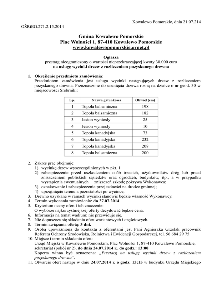 Kowalewo Pomorskie, dnia 21.07.214 OŚRiEG.271.2.15.2014 Gmina Kowalewo Pomorskie Plac Wolności 1, 87-410 Kowalewo Pomorskie www.kowalewopomorskie.ornet.pl Ogłasza przetarg nieograniczony o wartości nieprzekraczającej kwoty 30.000 euro na usługę wycinki drzew z rozliczeniem pozyskanego drewna 1. Określenie przedmiotu zamówienia: Przedmiotem zamówienia jest usługa wycinki następujących drzew z rozliczeniem pozyskanego drewna. Przeznaczone do usunięcia drzewa rosną na działce o nr geod. 30 w miejscowości Srebrniki: Lp. Nazwa gatunkowa Obwód (cm) 1 Topola balsamiczna 198 2 Topola balsamiczna 182 3 Jesion wyniosły 25 4 Jesion wyniosły 10 5 Topola kanadyjska 73 6 Topola kanadyjska 232 7 Topola kanadyjska 208 8 Topola balsamiczna 200 2. Zakres prac obejmuje: 1) wycinkę drzew wyszczególnionych w pkt. 1 2) zabezpieczenie przed uszkodzeniem osób trzecich, użytkowników dróg lub przed zniszczeniem pobliskich sąsiedztw oraz ogrodzeń, budynków, itp., a w przypadku wystąpienia ewentualnych zniszczeń szkodę pokrywa Wykonawca; 3) oznakowanie i zabezpieczenie przejezdności na drodze gminnej; 4) uprzątnięcie terenu z pozostałości po wycince; 3. Drewno uzyskane w ramach wycinki stanowić będzie własność Wykonawcy. 4. Termin wykonania zamówienia: do 27.07.2014 5. Kryterium oceny ofert i ich znaczenie: O wyborze najkorzystniejszej oferty decydować będzie cena. 6. Informacja na temat wadium: nie przewiduje się. 7. Nie dopuszcza się składania ofert wariantowych i częściowych. 8. Termin związania ofertą: 3 dni. 9. Osobą upoważnioną do kontaktu z oferentami jest Pani Agnieszka Grzelak pracownik Referatu Ochrony Środowiska, Rolnictwa i Ewidencji Gospodarczej, tel. 56 684 29 75 10. Miejsce i termin składania ofert: Urząd Miejski w Kowalewie Pomorskim, Plac Wolności 1, 87-410 Kowalewo Pomorskie, sekretariat (pokój nr 2), do dnia 24.07.2014 r., do godz.: 13:00 Koperta winna być oznaczona: „Przetarg na usługę wycinki drzew z rozliczeniem pozyskanego drewna”. 11. Otwarcie ofert nastąpi w dniu 24.07.2014 r. o godz. 13:15 w budynku Urzędu Miejskiego w Kowalewie Pom., Pl. Wolności 3, pokój nr 3. 12. Ogłaszający przetarg zastrzega sobie prawo unieważnienia przetargu bez podania przyczyn. Z uwagi na to, iż wartość zamówienia nie przekracza kwoty 30.000 EURO w niniejszym przetargu nie będą stosowane przepisy ustawy z dnia 29 stycznia 2004r. Prawo zamówień publicznych (tj. Dz. U z 2013r., poz. 907 z późn. zm.). A.Grzelak z up. Burmistrza /-/ mgr inż. Ilona Rybicka Doradca – Pełnomocnik Burmistrza …............................................................ Nazwa i adres firmy (wykonawcy) FORMULARZ OFERTOWY W PRZETARGU NA USŁUGĘ WYCINKI DRZEW Z ROZLICZENIEM POZYSKANEGO DREWNA 1. Dane oferenta (nazwa firmy lub osoby fizycznej i adres): .............................................................................................................................. .............................................................................................................................. .............................................................................................................................. .............................................................................................................................. 2. Numer telefonu/faxu: ….............................................................. 3. NIP: ….............................................................. 4. REGON: ….............................................................. 5. Wyceniona wartość usługi wycinki drzew: …........................................................ zł. brutto 6. Szacunkowa wartość pozyskanego drewna: …...................................................... zł. brutto 7. Cena oferowana (5-6): …........................................................................................ zł. brutto Słownie: …..............................................................…..............................................zł brutto 8. Termin wykonania zamówienia: ….............................................................. 1. Oświadczam, że do wykonania określonych prac i czynności posiadam niezbędne uprawnienia, wiedzę i doświadczenie oraz potencjał ekonomiczny i techniczny zapewniający wykonanie prac. 2. Oświadczam, że zapoznałem się z warunkami umowy, przyjmuję ją bez zastrzeżeń i zobowiązuję się – w przypadku wybrania mojej oferty – do zawarcia umowy na wyżej wymienionych warunkach, w miejscu i terminie wyznaczonym przez zamawiającego. …............................................................................... (Podpis oferenta lub osób uprawnionych do składania oświadczeń woli w imieniu wykonawcy)