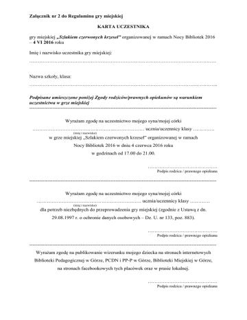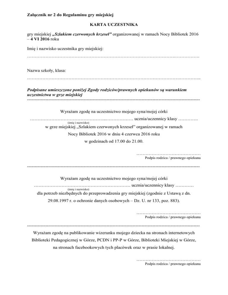 Załącznik nr 2 do Regulaminu gry miejskiej KARTA UCZESTNIKA gry miejskiej „Szlakiem czerwonych krzeseł” organizowanej w ramach Nocy Bibliotek 2016 – 4 VI 2016 roku Imię i nazwisko uczestnika gry miejskiej: …………………………………………………………………………………….……………. Nazwa szkoły, klasa: ……………………………………………………………………………………….………….. Podpisane umieszczone poniżej Zgody rodziców/prawnych opiekunów są warunkiem uczestnictwa w grze miejskiej ----------------------------------------------------------------------------------------------------------------Wyrażam zgodę na uczestnictwo mojego syna/mojej córki …………………………………………..……………… ucznia/uczennicy klasy …………. (imię i nazwisko) w grze miejskiej „Szlakiem czerwonych krzeseł” organizowanej w ramach Nocy Bibliotek 2016 w dniu 4 czerwca 2016 roku w godzinach od 17.00 do 21.00. …………………………………… Podpis rodzica / prawnego opiekuna ----------------------------------------------------------------------------------------------------------------Wyrażam zgodę na uczestnictwo mojego syna/mojej córki ……………………………………………………… ucznia/uczennicy klasy ………… (imię i nazwisko) dla potrzeb niezbędnych do przeprowadzenia gry miejskiej (zgodnie z Ustawą z dn. 29.08.1997 r. o ochronie danych osobowych – Dz. U. nr 133, poz. 883). …………………………………… Podpis rodzica / prawnego opiekuna ----------------------------------------------------------------------------------------------------------------Wyrażam zgodę na publikowanie wizerunku mojego dziecka na stronach internetowych Biblioteki Pedagogicznej w Górze, PCDN i PP-P w Górze, Biblioteki Miejskiej w Górze, na stronach facebookowych tych placówek oraz w prasie lokalnej. …………………………………… Podpis rodzica / prawnego opiekuna