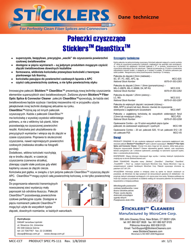 Dane techniczne Pałeczki czyszczące SticklersTM CleanStixxTM superczyste, bezpyłowe, precyzyjne „waciki” do czyszczenia powierzchni czołowej światłowodów dostępne w pięciu wymiarach – są jedynym produktem mogącym czyścić złączki światłowodowe dowolnych kształtów formowana, włóknista końcówka przewyższa końcówki z tworzywa piankowego lub tkaniny, końcówka pasująca do powierzchni czołowych łącznie z APC czyści całą powierzchnię czołową, a nie tylko powierzchnię styku Innowacyjne pałeczki Sticklers™ CleanStixx™ prezentują nową technikę czyszczenia elementów superszybkich sieci światłowodowych. Zwilżone płynem SticklersTM Fiber Optic Splice & Connector Cleaner pałeczki CleanStixx™spowodują, że każda sieć światłowodowa będzie szybsza i bardziej niezawodna niż w przypadku użycia jakiejkolwiek innej techniki dostępnej aktualnie na rynku. CleanStixx™różnią się od innych pałeczek czyszczących. Każda z pałeczek CleanStixxTM ma końcówkę z wysokiej czystości włóknistego polimeru, a nie z włókniny lub pianki, które pozostawiają na czyszczonej powierzchni resztki. Końcówka jest ukształtowana do precyzyjnych wymiarów i wkręca się do złączki w czasie czyszczenia. Poprawia to skuteczność czyszczenia, nawet najmniejszych powierzchni czołowych (niebieska strzałka na fotografii poniżej). Dodatkowo, włókna końcówki rozchylają się w środku złączki, w czasie jej czyszczenia (czerwona strzałka), zbierając cząstki stałe podczas gdy efekt kapilarny usuwa ze złączki ciecze. Końcówka jest giętka, w związku z tym jedynie pałeczki CleanStixxTM czyszczą złączki APC. CleanStixxTM mogą czyścić całą powierzchnię końcową, a nie tylko powierzchnię styku. Do pogorszenia własności transmisyjnych nowoczesnej sieci wystarczy mały paproszek lub odrobina tłuszczu. Pałeczki CleanStixxTM pozostawiają powierzchnie czołowe perfekcyjnie czyste. Dostępne w pięciu rozmiarach pałeczki CleanStixxTM mogą być użyte do wszystkich typów złączek, dowolnych rozmiarów, w każdych warunkach. Dystrybucja: DASAP Jarosław Lipiński ul. Słowicza 1A, Ustanów 05-540 Zalesie Górne tel: 22 7267767 fax: 22 2138381 [email protected] www.dasap.com.pl MCC-CCT PRODUCT SPEC PS-111 Rev. 1/8/2010 Szczegóły techniczne Każdy pałeczka ma jedną końcówkę czyszczącą. Końcówki pałeczek mających w swoim symbolu „S” służą do czyszczenia powierzchni czołowych, znajdujących się wewnątrz tulei centrujących, np. w gniazdach lub adapterach. Końcówki pałeczek z „P” w symbolu, przeznaczone są do czyszczenia odsłoniętych ferul lub zakończeń. Pałeczki są pakowane po 10 sztuk w oznakowane odpowiednim kolorem torebki, a następnie po 5 torebek w pudełko. W kartonie pakowane jest sześć pudełek. Nieograniczony okres przechowywania. Gwarancja: 12 miesięcy. Pałeczka do złączek 2,5mm (niebieski) – SC, ST, FC, ASC, AFC, itp. National Stock Number MCC-S25 6070-01-553-2263 Pałeczka do złączek 2,0mm i 1,6mm (pomarańczowy) – MIL-C-28876, MIL-C-38999, D4, MT-RJ MCC-S16 National Stock Number 6070-01-553-2262 Pałeczka do złączek 1,25mm (zielony) – LC, MU National Stock Number MCC-S12 6070-01-553-2267 Pałeczka do większych złączek i soczewek (różowy) – SMA, MTP (z pinami lub bez), Biconic; również do czyszczenia obiektywów z zagłębionymi soczewkami MCC-XMT Pałeczka z zagłębioną końcówką do wszystkich odsłoniętych feruli 2,5mm lub mniejszych (żółty) – MCC-P25 National Stock Number 6070-01-553-2258 Opakowanie Combo – po 10 sztuk wszystkich pięciu typów pałeczek; do zastosowań wojskowych i cywilnych MCC-VM Opakowanie Combo – 20 szt. pałeczek S25, 10 szt. pałeczek S12 i 20 szt. pałeczek P25 MCC-VS Uwagi PRODUKTY ZWIĄZANE: W celu uzyskania najlepszych wyników czyszczenia zagłębionych tulei, stosować pałeczki SticklersTM CleanStixxTM razem z płynem czyszczącym SticklersTM Fiber Optic Splice and Connector Cleaner. Chociaż inne płyny mogą być też używane, efekty będą gorsze. Wyłącznie rozpuszczalnik SticklersTM Cleaner odpowiednią gęstość, lepkość, czas wysychania, łatwość posługiwania i jak i unikatowe opakowanie, pozwalając na wykonanie czyszczeń szybko, łatwo i z powtarzalną skutecznością. DOSTĘPNOŚĆ: Więcej informacji dotyczących tego wyrobu i namiary lokalnych dystrybutorów znajdują się na stronie SticklersCleaners.com. ZNAKI TOWAROWE: Wszystkie nazwy „Sticklers”, „CleanStixx”, „CleanWipe”, CleanSlots”, „TravelSAFE” i „Triton” są znakami towarowymi MicroCare Corp. Nazwa MicroCare i logo są zarejestrowanymi znakami handlowymi MicroCare Corp. Pałeczki czyszczące chronione są patentem US 7,401,374. WYŁĄCZENIA: Informacje podane w niniejszej ulotce są oparte na danych uważanych za prawdziwe, ale MicroCare nie daje wyraźnych lub dorozumianych gwarancji ich dokładności i nie przyjmuje żadnych zobowiązań wynikających z ich użycia przez inne osoby. Niniejsza publikacja nie może być uważana za pozwolenie na działania według ani naruszania patentów nie wymienionych bezpośrednio w niniejszej publikacji. Mikrofotografie powierzchni czołowej światłowodów. Lewa: tłuszcz odcisków palców. Prawa: czysta złączka, doskonale przesyłająca sygnały danych. Powiększenie około 200x. 595 John Downey Drive, New Britain, CT 06051 USA tel: 001 860 827 0626 fax: 001 860 827 8105 Północna Ameryka: 800 638 0125 Email: [email protected] www.SticklersCleaners.com MicroCare Is ISO 9001:2008 Registered str. 1/1