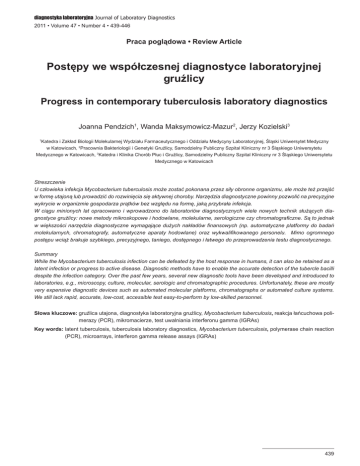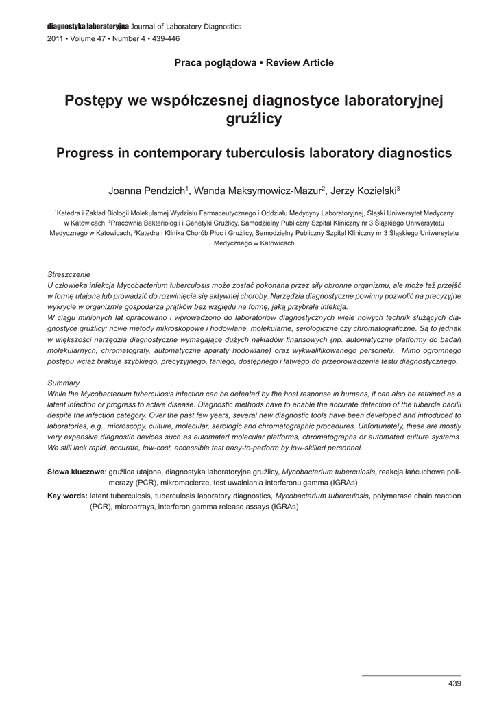 diagnostyka laboratoryjna Journal of Laboratory Diagnostics 2011 • Volume 47 • Number 4 • 439-446 Praca poglądowa • Review Article Postępy we współczesnej diagnostyce laboratoryjnej gruźlicy Progress in contemporary tuberculosis laboratory diagnostics Joanna Pendzich1, Wanda Maksymowicz-Mazur2, Jerzy Kozielski3 Katedra i Zakład Biologii Molekularnej Wydziału Farmaceutycznego i Oddziału Medycyny Laboratoryjnej, Śląski Uniwersytet Medyczny w Katowicach, 2Pracownia Bakteriologii i Genetyki Gruźlicy, Samodzielny Publiczny Szpital Kliniczny nr 3 Śląskiego Uniwersytetu Medycznego w Katowicach, 3Katedra i Klinika Chorób Płuc i Gruźlicy, Samodzielny Publiczny Szpital Kliniczny nr 3 Śląskiego Uniwersytetu Medycznego w Katowicach 1 Streszczenie U człowieka infekcja Mycobacterium tuberculosis może zostać pokonana przez siły obronne organizmu, ale może też przejść w formę utajoną lub prowadzić do rozwinięcia się aktywnej choroby. Narzędzia diagnostyczne powinny pozwolić na precyzyjne wykrycie w organizmie gospodarza prątków bez względu na formę, jaką przybrała infekcja. W ciągu minionych lat opracowano i wprowadzono do laboratoriów diagnostycznych wiele nowych technik służących diagnostyce gruźlicy: nowe metody mikroskopowe i hodowlane, molekularne, serologiczne czy chromatograficzne. Są to jednak w większości narzędzia diagnostyczne wymagające dużych nakładów finansowych (np. automatyczne platformy do badań molekularnych, chromatografy, automatyczne aparaty hodowlane) oraz wykwalifikowanego personelu. Mimo ogromnego postępu wciąż brakuje szybkiego, precyzyjnego, taniego, dostępnego i łatwego do przeprowadzenia testu diagnostycznego. Summary While the Mycobacterium tuberculosis infection can be defeated by the host response in humans, it can also be retained as a latent infection or progress to active disease. Diagnostic methods have to enable the accurate detection of the tubercle bacilli despite the infection category. Over the past few years, several new diagnostic tools have been developed and introduced to laboratories, e.g., microscopy, culture, molecular, serologic and chromatographic procedures. Unfortunately, these are mostly very expensive diagnostic devices such as automated molecular platforms, chromatographs or automated culture systems. We still lack rapid, accurate, low-cost, accessible test easy-to-perform by low-skilled personnel. Słowa kluczowe:gruźlica utajona, diagnostyka laboratoryjna gruźlicy, Mycobacterium tuberculosis, reakcja łańcuchowa polimerazy (PCR), mikromacierze, test uwalniania interferonu gamma (IGRAs) Key words:latent tuberculosis, tuberculosis laboratory diagnostics, Mycobacterium tuberculosis, polymerase chain reaction (PCR), microarrays, interferon gamma release assays (IGRAs) 439