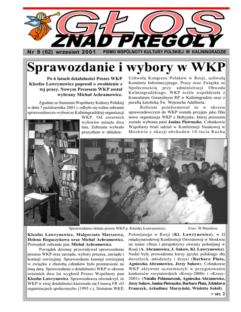 N r 9 (62) wrzesień 2001 PISMO WSPÓLNOTY KULTURY POLSKIEJ W KALININGRADZIE Sprawozdanie i wybory w WKP Uchwałą Kongresu Polaków w Rosji, uchwałą Komitetu Informacyjnego, Prasy oraz Związku ze Społecznością przy administracji Obwodu Kaliningradzkiego. WKP ściśle współdziała z Konsulatem Generalnym RP w Kaliningradzie oraz z Zgodnie ze Statutem Wspólnoty Kultury Polskiej parafią katolicką Św. Wojciecha Adalberta. Referent poinformował że w okresie w dniu 7 października 2001 r. odbyło się walne zebranie sprawozdawczo-wyborcze Kaliningradzkiej organizacji sprawozdawczym do WKP została przyjęta jako filia WKP. Od ostatnich nowa organizacja WKP z Bałtyjska, której prezesem wyborów minęło dwa została wybrana pani Janina Pietruszko. Członkowie lata. Zebranie wybrało Wspólnoty brali udział w Konferencji Naukowej w prezydium w składzie: M os kwie z oka zji ob chodów 1 0 - lecia R u ch u Po 6 latach działalności Prezes WKP Kleofas Ławrynowicz poprosił o zwolnienie z tej pracy. Nowym Prezesem WKP został wybrany Michał Achramowicz. Sprawozdanie składa prezes WKP p. Kleofas Ławrynowicz. Kleofas Ławrynowicz, Małgorzata Marszewa, Helena Rogaczykowa oraz Michał Achramowicz. Prowadził zebranie pan Michał Achramowicz. Porządek dzienny przewidywał sprawozdanie prezesa WKP oraz zarządu, wybory prezesa, zarządu i komisji rewizyjnej. Sprawozdanie komisji rewizyjnej w związku z chorobą członków było przeniesione na inną datę. Sprawozdanie o działalności WKP w okresie ostatnich dwu lat wygłosił Prezes Wspólnoty pan Kleofas Ławrynowicz. Sprawozdawca oświadczył, że WKP w swej działalności kierowała się Ustawą FR «O organizacjach społecznych» (1995 r.), Statutem WKP, Foto: W.Wasiliew. Polonijnego w Rosji (Kl. Ławrynowicz), w II międzynarodowej Konferencji Oświatowej w Moskwie na temat «Stan i perspektywy oświaty polonijnej w Rosji (A. Abramowicz, J. Sukow, Kl. Ławrynowicz). Nadal były prowadzone kursy języka polskiego dla dorosłych, młodzieży i dzieci (Barbara Pluta, Agnieszka Abramowicz, Jerzy Sukow). Członkowie WKP aktywnie uczestniczyli w przygotowaniu konkursów recytatorskich «Kresy-2000» i «Kresy2001» (Natalia Połamarczuk, Agnieszka Abramowicz, Jerzy Sukow, Janina Pietruszko, Barbara Pluta, Zdzisława Franczyk, Arkadiusz Murzyński, Wioletta Sokół). > str. 2 Str. 2 (ze str. 1) Nr 9 (62) wrzesień 2001 GŁOS ZNAD PREGOŁY Sprawozdanie i wybory w WKP Panie Danuta Szczęsna, Swietłana Grzybowska i Rozalia Teterska zorganizowały cykl sześciu koncertów «Historia muzyki polskiej na żywo» w wykonaniu polskich i kaliningradzkich muzyków w Kaliningradzie w ciągu 2000-2001 r. Dużym zainteresowaniem cieszyło się spotkanie przedstawicieli Polonii Kaliningradzkiej z polskimi pisarzami - uczestnikami międzynarodowego literackiego ekspresu «Europa 2000». Chór polonijny pod kierownictwem pani Heleny Rogaczykowej wielokrotnie występował na uroczystościach z okazji świąt kościelnych i narodowych. W organizacji koncertów chóru dzielnie pomagała - pani Małgorzata Marszewa, w stroje ludowe chórzyści byli zaopatrzeni dzięki staraniom pani Genowefy Nowickiej. Propagowanie piosenki polskiej, polskiego tańca, polskiej kuchni, twórczości narodowej były zawsze ważniejszym celem WKP na Festiwalach Narodowościowych, w Dniu Miasta, na uroczystościach świątecznych 3 MAJA i 11 LISTOPADA. Aktywny udział w tych imprezach stale biorą Małgorzata i Boris Marszewowie, Zdzisław Bernatowicz, Helena Rogaczykowa, Swietłana Siwołobowa-Potocka (polski taniec), Cezja Czyż (twórczość narodowa, obrazki), Jan Kamieniecki, Wasilij Wasiliew (dziennikarz), Stanisław Moskowkin, Benedykta Łuszczyk oraz Barbara Wasilewska (Gusiew), Teresa Griaznowa, Michał Achramowicz i inni. Regularne oraz właściwe naświetlenie wydarzeń we Wspólnocie i parafii, życia społecznego i kulturalnego, naszych dążeń i problemów, jak również stron „polskiej” historii naszego miasta i obwodu, opowiadań o słynnych Polakach w Rosji działaczach nauki, kultury, twórczości technicznej możemy znaleźć na łamach naszego pisma «Głos znad Pregoły». Sprawozdawca podkreślił żmudną, z reguły nocną pracę redaktora naczelnego Kazimierza Ławrynowicza obciążonego pracą zawodowa na uniwersytecie, jak również korektorów, tłumaczy p. Danuty Szczęsnej (Warszawa), Agnieszki Abramowicz, Jerzego Sukowa, redaktor technicznej Aleksandry Ławrynowicz, dziennikarza i reportera Wasilia Wasiliewa. Gazetę zyskuje na aktualności dzięki listom i informacjom jej stałych społecznych korespondentów Teresy Siwasz, Zenona Dmuchowskiego, Janiny Pietruszko, ks. Jerzego Steckiewicza i innych. Redaktor naczelny, który w tym dniu był zagranicą, prosił przekazać obecnym na zebraniu serdeczne podziękowanie za współpracę i zaproszenie do dalszych aktywnych kontaktów z „Głosem znad Pregoły”. Prawie w każdej znacznej imprezie Wspólnocie udzielał pomocy Konsulat Generalny RP w Kaliningradzie z Generalnym Konsulem panem Andrzejem Janickim-Rolą na czele. Bezpośrednio w organizacji wielu naszych imprez kulturalnych oraz przedsięwzięć brała udział i chętnie pomagała i pomaga nadal Konsul RP pani Wioletta Sokół. Wszystkie sprawy Polonii bierze sobie do serca i rozwiązuje najczęściej pozytywnie, ze szczerą chęcią. WKP serdecznie dziękuje pracownikom KG RP w Kaliningradzie za gościnność, dzięki której WKP tak często korzysta z pomieszczeń KG dla swojej działalności, za wszechstronną pomoc i poparcie w rozmaitych przedsięwzięciach Wspólnoty. Pod cz a s d yskusj i . Foto: W.Wasiliew. Sprawozdawca dał pozytywną ocenę działalności członkom zarządu WKP M.Achramowiczowi, Z. Bernatowiczowi, J. Kondratowi, Kaz. Ławrynowiczowi, B. Marszewowi, M. Marszewej, A. Teterskiemu, R. Teterskiej, W. Wasiljewowi, serdecznie podziękował za współpracę księdzu Jerzemu, księżom Aleksandrowi, Dariuszowi,