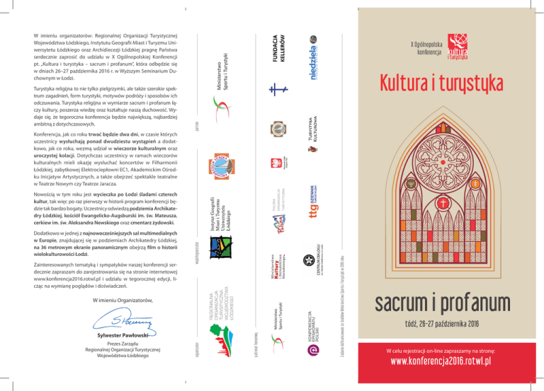 W imieniu organizatorów: Regionalnej Organizacji Turystycznej Województwa Łódzkiego, Instytutu Geografii Miast i Turyzmu Uniwersytetu Łódzkiego oraz Archidiecezji Łódzkiej pragnę Państwa serdecznie zaprosić do udziału w X Ogólnopolskiej Konferencji pt. „Kultura i turystyka – sacrum i profanum”, która odbędzie się w dniach 26–27 października 2016 r. w Wyższym Seminarium Duchownym w Łodzi. Kultura i turystyka partner Turystyka religijna to nie tylko pielgrzymki, ale także szerokie spektrum zagadnień, form turystyki, motywów podróży i sposobów ich odczuwania. Turystyka religijna w wymiarze sacrum i profanum łączy kultury, poszerza wiedzę oraz kształtuje naszą duchowość. Wydaje się, że tegoroczna konferencja będzie największą, najbardziej ambitną z dotychczasowych. X Ogólnopolska konferencja Konferencja, jak co roku trwać będzie dwa dni, w czasie których uczestnicy wysłuchają ponad dwudziestu wystąpień a dodatkowo, jak co roku, wezmą udział w wieczorze kulturalnym oraz uroczystej kolacji. Dotychczas uczestnicy w ramach wieczorów kulturalnych mieli okazję wysłuchać koncertów w Filharmonii Łódzkiej, zabytkowej Elektrociepłowni EC1, Akademickim Ośrodku Inicjatyw Artystycznych, a także obejrzeć spektakle teatralne w Teatrze Nowym czy Teatrze Jaracza. Zainteresowanych tematyką i sympatyków naszej konferencji serdecznie zapraszam do zarejestrowania się na stronie internetowej www.konferencja2016.rotwl.pl i udziału w tegorocznej edycji, licząc na wymianę poglądów i doświadczeń. Prezes Zarządu Regionalnej Organizacji Turystycznej Województwa Łódzkiego organizator Sylwester Pawłowski patronat honorowy W imieniu Organizatorów, Zadanie dofinansowane ze środków Ministerstwa Sportu i Turystyki w 2016 roku Dodatkowo w jednej z najnowocześniejszych sal multimedialnych w Europie, znajdującej się w podziemiach Archikatedry Łódzkiej, na 36 metrowym ekranie panoramicznym obejrzą film o historii wielokulturowości Łodzi. współorganizator Nowością w tym roku jest wycieczka po Łodzi śladami czterech kultur, tak więc po raz pierwszy w historii program konferencji będzie tak bardzo bogaty. Uczestnicy odwiedzą podziemia Archikatedry Łódzkiej, kościół Ewangelicko-Augsburski im. św. Mateusza, cerkiew im. św. Aleksandra Newskiego oraz cmentarz żydowski. W celu rejestracji on-line zapraszamy na stronę: www.konferencja2016.rotwl.pl 26 października 2016 900–1000 Rejestracja uczestników konferencji 1000–1030 Powitanie gości przez organizatorów SESJA A SESJA B 1540–1600 ks. prof. Jan Klinkowski Papieski Wydział Teologiczny we Wrocławiu Znaczenie sacrum w spotkaniu islamu i chrześcijaństwa w czasie współczesnej wędrówce ludów prof. Katarzyna Marciniak Uniwersytet im. Adama Mickiewicza w Poznaniu Sacrum czy profanum? – analiza ruchu pątniczego na podstawie pielgrzymek do wielkopolskich sanktuariów maryjnych 1600–1620 dr hab. Elżbieta Bilska-Wodecka, dr hab. Izabela Sołjan Uniwersytet Jagielloński Religijna i pozareligijna działalność sanktuariów katolickich ks. Michał Makula Parafia Ewangelicko -Augsburska św. Mateusza w Łodzi Rola obiektów sakralnych w rozumieniu problematyki wielokulturowości miasta ks. Łukasz Tarnawski Archidiecezja Łódzka Kraków bez Wzgórza Wawelskiego, Częstochowa bez Jasnej Góry, Rzym bez Watykanu dr Piotr Gryszel Uniwersytet Ekonomiczny we Wrocławiu Dziedzictwo ewangelików w krajobrazie Sudetów jako produkt turystyczny ks. Jakub Dmitruk Katedralna Parafia Prawosławna św. Aleksandra Newskiego Obiekty sakralne Cerkwi Prawosławnej w Polsce – kontekst poznawczy prof. Jacek Kaczmarek, mgr Joanna Dronka-Skrzypczak Uniwersytet Łódzki Droga pielgrzymkowa z Częstochowy do Lichenia – projekt i organizacja 1700–1720 Joanna Bik Uniwersytet Łódzki Światowe Dni Młodzieży. Radosne spotkanie na gruncie wiary dr Magdalena Duda-Seifert Uniwersytet Wrocławski Walory poznawcze miejsc kultu i zgromadzeń mniejszości religijnych Wrocławia 1720–1800 Dyskusja i podsumowanie dnia 1930/2100 Wieczór artystyczny / uroczysta kolacja SESJA PLENARNA KRAJOWA 10 –10 30 50 prof. Antoni Jackowski Uniwersytet Jagielloński Dzieje badań nad problemem turystyki religijnej w ramach geografii religii 1050–1110 Rabin Symcha Keller Fundacja Kellerów Turystyka żydowska o charakterze religijnym w regionie łódzkim 1110–1130 bp Damian Muskus OFM Koordynator generalny Komitetu Organizacyjnego ŚDM Podsumowanie Światowych Dni Młodzieży Kraków 2016 1130–1150 Szymon Gatlik Wydział Promocji i Turystyki Urzędu Miasta Krakowa ŚDM Kraków 2016. Czy naprawdę było warto? Spojrzenie “z miasta” 1200–1230 przerwa kawowa 1620–1640 1640–1700 SESJA PLENARNA ZAGRANICZNA 1230–1300 Don Gaetano Giovanni Biallo Opera Romana Pellegrinaggi, Włochy Religious Tourism as a New Way of Evangelisation 1300–1330 Otto van Veen Nyenrode Bussiness University, konsul honorowy Rzeczypospolitej Polskiej w Utrechcie, Holandia Travel and Tourism as a Religious Experience 1330–1400 Alexandre Marto Pereira Associação Empresarial Ourém-Fátima, Portugalia Fatima: Religious Tourism from a Hotelier Perspective 1400–1430 1445–1540 Rabin Avraham Krieger Shem Olam Instytute, Izrael Rabbinical Leadership and Its Relevance during the Succesful Settlement and then during the Demise of Jewish Life in Poland and Eastern Europe SESJA A SESJA B 1340–1400 prof. Jacek Potocki Uniwersytet Wrocławski Śnieżka jako miejsce kultu religijnego Małgorzata Wilk-Grzywna Regionalna Organizacja Turystyczna Województwa Świętokrzyskiego Oferta turystyki religijnej na przykładzie Pustelni Złotego Lasu w Rytwianach oraz wybranych obiektów sakralnych w Wielkiej Brytanii 1400–1420 dr inż. Tadeusz Jędrysiak Fundacja Oko-Lice Kultury dr Izabela Wyszowska Akademia Wychowania Fizycznego im. Eugeniusza Piaseckiego w Poznaniu Pielgrzymowanie w różnych religiach świata – cele i motyw