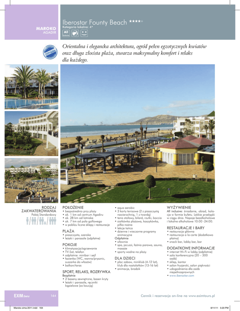 MAROKO ★★★★+ Iberostar Founty Beach Kategoria lokalna: 4 ★ AGADIR Orientalna i elegancka architektura, ogród pełen egzotycznych kwiatów oraz długa złocista plaża, stwarza maksymalny komfort i relaks dla każdego. RODZAJ ZAKWATEROWANIA Pokój Standardowy / / / POŁOŻENIE • bezpośrednio przy plaży • ok. 1 km od centrum Agadiru • ok. 28 km od lotniska • ok. 7 km od pola golfowego • w pobliżu liczne sklepy i restauracje PLAŻA • piaszczysta, szeroka • leżaki i parasole (odpłatne) POKOJE • klimatyzacja/ogrzewanie • TV-Sat, telefon • odpłatnie: minibar i sejf • łazienka (WC, wanna/prysznic, suszarka do włosów) • balkon/taras SPORT, RELAKS, ROZRYWKA Bezpłatnie • 2 baseny zewnętrzne, basen kryty • leżaki i parasole, ręczniki kąpielowe (za kaucją) 164 Maroko zima 2011.indd 164 • aqua aerobic • 3 korty tenisowe (2 z piaszczystą nawierzchnią, 1 z twardą) • tenis stołowy, bilard, rzutki, boccia • siatkówka plażowa, koszykówka, piłka nożna • lekcje tańca • dzienne i wieczorne programy animacyjne Odpłatnie • siłownia • spa, jacuzzi, łaźnia parowa, sauna, masaże • sporty wodne na plaży DLA DZIECI • plac zabaw, miniklub (4-12 lat), klub dla nastolatków (13-16 lat) • animacje, brodzik WYŻYWIENIE All inclusive: śniadanie, obiad, kolacja w formie bufetu. Lekkie przekąski w ciągu dnia. Napoje bezalkoholowe i lokalne alkoholowe 10:00 -24:00. RESTAURACJE I BARY • restauracja główna • restauracja a la carte (dodatkowo płatna) • snack bar, lobby bar, bar DODATKOWE INFORMACJE • internet Wi-Fi w lobby (odpłatnie) • sala konferencyjna (20 – 300 osób) • sklep, kantor • salon fryzjerski, salon piękności • udogodnienia dla osób niepełnosprawnych • www.iberostar.com Cennik i rezerwacja on-line na www.eximtours.pl 8/11/11 5:20 PM