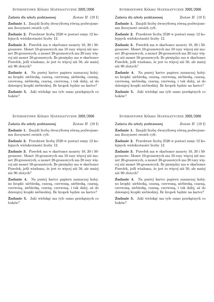 Internetowe Kółko Matematyczne 2005/2006 Zadania dla szkoły podstawowej Zestaw II (19 I) Internetowe Kółko Matematyczne 2005/2006 Zadania dla szkoły podstawowej Zestaw II (19 I) Zadanie 1. Znajdź liczbę dwucyfrową równą podwojonemu iloczynowi swoich cyfr. Zadanie 1. Znajdź liczbę dwucyfrową równą podwojonemu iloczynowi swoich cyfr. Zadanie 2. Przedstaw liczbę 2520 w postaci sumy 12 kolejnych wielokrotności liczby 12. Zadanie 2. Przedstaw liczbę 2520 w postaci sumy 12 kolejnych wielokrotności liczby 12. Zadanie 3. Pawełek ma w skarbonce monety 10, 20 i 50groszowe. Monet 10-groszowych ma 10 razy więcej niż monet 20-groszowych, a monet 20-groszowych ma 20 razy więcej niż monet 50-groszowych. Ile pieniędzy ma w skarbonce Pawełek, jeśli wiadomo, że jest to więcej niż 50, ale mniej niż 90 złotych? Zadanie 3. Pawełek ma w skarbonce monety 10, 20 i 50groszowe. Monet 10-groszowych ma 10 razy więcej niż monet 20-groszowych, a monet 20-groszowych ma 20 razy więcej niż monet 50-groszowych. Ile pieniędzy ma w skarbonce Pawełek, jeśli wiadomo, że jest to więcej niż 50, ale mniej niż 90 złotych? Zadanie 4. Na pustej kartce papieru zaznaczaj kolejno kropki: niebieską, czarną, czerwoną, niebieską, czarną, czerwoną, niebieską, czarną, czerwoną, i tak dalej, aż do dziesiątej kropki niebieskiej. Ile kropek będzie na kartce? Zadanie 4. Na pustej kartce papieru zaznaczaj kolejno kropki: niebieską, czarną, czerwoną, niebieską, czarną, czerwoną, niebieską, czarną, czerwoną, i tak dalej, aż do dziesiątej kropki niebieskiej. Ile kropek będzie na kartce? Zadanie 5. Jaki wielokąt ma tyle samo przekątnych co boków? Zadanie 5. Jaki wielokąt ma tyle samo przekątnych co boków? Internetowe Kółko Matematyczne 2005/2006 Internetowe Kółko Matematyczne 2005/2006 Zadania dla szkoły podstawowej Zestaw II (19 I) Zadania dla szkoły podstawowej Zestaw II (19 I) Zadanie 1. Znajdź liczbę dwucyfrową równą podwojonemu iloczynowi swoich cyfr. Zadanie 1. Znajdź liczbę dwucyfrową równą podwojonemu iloczynowi swoich cyfr. Zadanie 2. Przedstaw liczbę 2520 w postaci sumy 12 kolejnych wielokrotności liczby 12. Zadanie 2. Przedstaw liczbę 2520 w postaci sumy 12 kolejnych wielokrotności liczby 12. Zadanie 3. Pawełek ma w skarbonce monety 10, 20 i 50groszowe. Monet 10-groszowych ma 10 razy więcej niż monet 20-groszowych, a monet 20-groszowych ma 20 razy więcej niż monet 50-groszowych. Ile pieniędzy ma w skarbonce Pawełek, jeśli wiadomo, że jest to więcej niż 50, ale mniej niż 90 złotych? Zadanie 3. Pawełek ma w skarbonce monety 10, 20 i 50groszowe. Monet 10-groszowych ma 10 razy więcej niż monet 20-groszowych, a monet 20-groszowych ma 20 razy więcej niż monet 50-groszowych. Ile pieniędzy ma w skarbonce Pawełek, jeśli wiadomo, że jest to więcej niż 50, ale mniej niż 90 złotych? Zadanie 4. Na pustej kartce papieru zaznaczaj kolejno kropki: niebieską, czarną, czerwoną, niebieską, czarną, czerwoną, niebieską, czarną, czerwoną, i tak dalej, aż do dziesiątej kropki niebieskiej. Ile kropek będzie na kartce? Zadanie 4. Na pustej kartce papieru zaznaczaj kolejno kropki: niebieską, czarną, czerwoną, niebieską, czarną, czerwoną, niebieską, czarną, czerwoną, i tak dalej, aż do dziesiątej kropki niebieskiej. Ile kropek będzie na kartce? Zadanie 5. Jaki wielokąt ma tyle samo przekątnych co boków? Zadanie 5. Jaki wielokąt ma tyle samo przekątnych co boków?