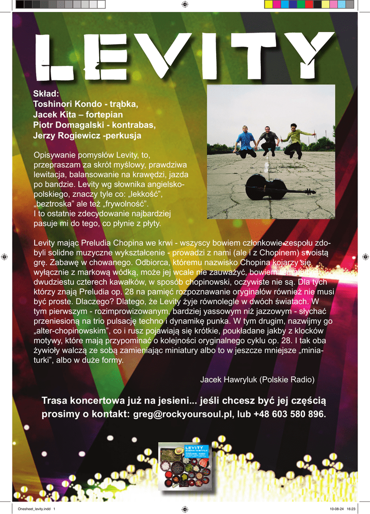 Skład: Toshinori Kondo - trąbka, Jacek Kita – fortepian Piotr Domagalski - kontrabas, Jerzy Rogiewicz -perkusja Opisywanie pomysłów Levity, to, przepraszam za skrót myślowy, prawdziwa lewitacja, balansowanie na krawędzi, jazda po bandzie. Levity wg słownika angielskopolskiego, znaczy tyle co: „lekkość”, „beztroska” ale też „frywolność”. I to ostatnie zdecydowanie najbardziej pasuje mi do tego, co płynie z płyty. Levity mając Preludia Chopina we krwi - wszyscy bowiem członkowie zespołu zdobyli solidne muzyczne wykształcenie - prowadzi z nami (ale i z Chopinem) swoistą grę. Zabawę w chowanego. Odbiorca, któremu nazwisko Chopina kojarzy się wyłącznie z markową wódką, może jej wcale nie zauważyć, bowiem tematy tych dwudziestu czterech kawałków, w sposób chopinowski, oczywiste nie są. Dla tych którzy znają Preludia op. 28 na pamięć rozpoznawanie oryginałów również nie musi być proste. Dlaczego? Dlatego, że Levity żyje równolegle w dwóch światach. W tym pierwszym - rozimprowizowanym, bardziej yassowym niż jazzowym - słychać przeniesioną na trio pulsację techno i dynamikę punka. W tym drugim, nazwijmy go „alter-chopinowskim”, co i rusz pojawiają się krótkie, poukładane jakby z klocków motywy, które mają przypominać o kolejności oryginalnego cyklu op. 28. I tak oba żywioły walczą ze sobą zamieniając miniatury albo to w jeszcze mniejsze „miniaturki”, albo w duże formy. Jacek Hawryluk (Polskie Radio) Trasa koncertowa już na jesieni... jeśli chcesz być jej częścią prosimy o kontakt: [email protected], lub +48 603 580 896. Onesheet_levity.indd 1 10-08-24 16:23