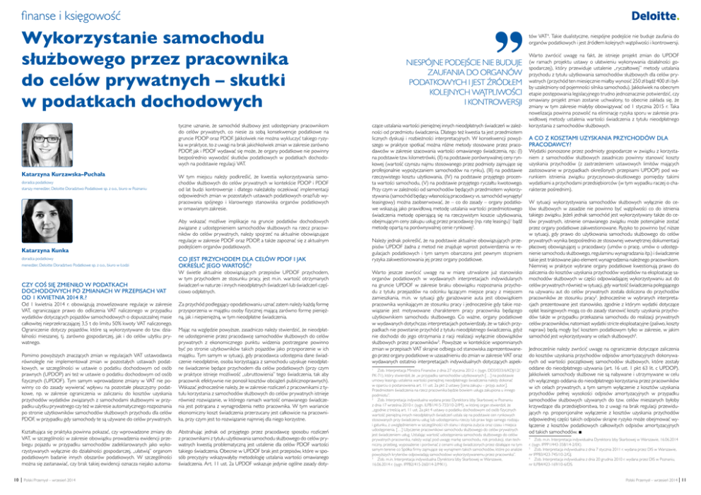 finanse i księgowość Wykorzystanie samochodu służbowego przez pracownika do celów prywatnych – skutki w podatkach dochodowych tyczne uznanie, że samochód służbowy jest udostępniany pracownikom do celów prywatnych, co niesie za sobą konsekwencje podatkowe na gruncie PDOP oraz PDOF. Jakkolwiek nie można wykluczyć takiego ryzyka w praktyce, to z uwagi na brak jakichkolwiek zmian w zakresie zarówno PDOP, jak i PDOF wydawać się może, że organy podatkowe nie powinny bezpośrednio wywodzić skutków podatkowych w podatkach dochodowych na podstawie regulacji VAT. Katarzyna Kurzawska–Puchała doradca podatkowy starszy menedżer, Deloitte Doradztwo Podatkowe sp. z o.o., biuro w Poznaniu Katarzyna Kunka doradca podatkowy menedżer, Deloitte Doradztwo Podatkowe sp. z o.o., biuro w Łodzi CZY COŚ SIĘ ZMIENIŁO W PODATKACH DOCHODOWYCH PO ZMIANACH W PRZEPISACH VAT OD 1 KWIETNIA 2014 R.? Od 1 kwietnia 2014 r. obowiązują znowelizowane regulacje w zakresie VAT, ograniczające prawo do odliczenia VAT naliczonego w przypadku wydatków dotyczących pojazdów samochodowych o dopuszczalnej masie całkowitej nieprzekraczającej 3,5 t do limitu 50% kwoty VAT naliczonego. Ograniczenie dotyczy pojazdów, które są wykorzystywane do tzw. działalności mieszanej, tj. zarówno gospodarczej, jak i do celów użytku prywatnego. W tym miejscu należy podkreślić, że kwestia wykorzystywania samochodów służbowych do celów prywatnych w kontekście PDOP i PDOF od lat budzi kontrowersje i dlatego należałoby oczekiwać implementacji odpowiednich zmian w pozostałych ustawach podatkowych oraz/lub wypracowania spójnego i klarownego stanowiska organów podatkowych w omawianym zakresie. Aby wskazać możliwe implikacje na gruncie podatków dochodowych związane z udostępnieniem samochodów służbowych na rzecz pracowników do celów prywatnych, należy spojrzeć na aktualnie obowiązujące regulacje w zakresie PDOF oraz PDOP, a także zapoznać się z aktualnym podejściem organów podatkowych. CO JEST PRZYCHODEM DLA CELÓW PDOF I JAK OKREŚLIĆ JEGO WARTOŚĆ? W świetle aktualnie obowiązujących przepisów UPDOF przychodem, w tym przychodem ze stosunku pracy, jest m.in. wartość otrzymanych świadczeń w naturze i innych nieodpłatnych świadczeń lub świadczeń częściowo odpłatnych. Za przychód podlegający opodatkowaniu uznać zatem należy każdą formę przysporzenia w majątku osoby fizycznej mającą zarówno formę pieniężną, jak i niepieniężną, w tym nieodpłatne świadczenia. Pomimo powyższych znaczących zmian w regulacjach VAT ustawodawca równolegle nie implementował zmian w pozostałych ustawach podatkowych, w szczególności w ustawie o podatku dochodowym od osób prawnych (UPDOP) ani też w ustawie o podatku dochodowym od osób fizycznych (UPDOF). Tym samym wprowadzone zmiany w VAT nie powinny co do zasady wywierać wpływu na pozostałe płaszczyzny podatkowe, np. w zakresie ograniczenia w zaliczaniu do kosztów uzyskania przychodów wydatków związanych z samochodami służbowymi w przypadku użytku prywatnego czy też w zakresie automatycznego rozpoznania po stronie użytkowników samochodów służbowych przychodu dla celów PDOF, w przypadku gdy samochody te są używane do celów prywatnych. Mając na względzie powyższe, zasadniczo należy stwierdzić, że nieodpłatne udostępnienie przez pracodawcę samochodów służbowych do celów prywatnych z ekonomicznego punktu widzenia postrzegane powinno być po stronie użytkowników takich pojazdów jako przysporzenie w ich majątku. Tym samym w sytuacji, gdy pracodawca udostępnia dane świadczenie nieodpłatnie, osoba korzystająca z samochodu uzyskuje nieodpłatne świadczenie będące przychodem dla celów podatkowych (przy czym w praktyce istnieje możliwość „ubruttowienia” tego świadczenia, tak aby pracownik efektywnie nie ponosił kosztów obciążeń publicznoprawnych). Wskazać jednocześnie należy, że w zakresie rozliczeń z pracownikami z tytułu korzystania z samochodów służbowych do celów prywatnych istnieje również rozwiązanie, w którego ramach wartość omawianego świadczenia jest potrącana z wynagrodzenia netto pracownika. W tym wariancie ekonomiczny koszt świadczenia przerzucany jest całkowicie na pracownika, przy czym jest to rozwiązanie najmniej dla niego korzystne. Kształtująca się praktyka powinna pokazać, czy wprowadzone zmiany do VAT, w szczególności w zakresie obowiązku prowadzenia ewidencji przebiegu pojazdu w przypadku samochodów zadeklarowanych jako wykorzystywanych wyłącznie do działalności gospodarczej, „ułatwią” organom podatkowym badanie innych obszarów podatkowych. W szczególności można się zastanawiać, czy brak takiej ewidencji oznacza niejako automa- Abstrahując jednak od przyjętego przez pracodawcę sposobu rozliczeń z pracownikami z tytułu użytkowania samochodu służbowego do celów prywatnych kwestią problematyczną jest ustalenie dla celów PDOF wartości takiego świadczenia. Obecnie w UPDOF brak jest przepisów, które w sposób precyzyjny wskazywałyby metodologię ustalania wartości omawianego świadczenia. Art. 11 ust. 2a UPDOF wskazuje jedynie ogólne zasady doty- 10 | Polski Przemysł – wrzesień 2014 tów VAT4. Takie dualistyczne, niespójne podejście nie buduje zaufania do organów podatkowych i jest źródłem kolejnych wątpliwości i kontrowersji. NIESPÓJNE PODEJŚCIE NIE BUDUJE ZAUFANIA DO ORGANÓW PODATKOWYCH I JEST ŹRÓDŁEM KOLEJNYCH WĄTPLIWOŚCI I KONTROWERSJI czące ustalania wartości pieniężnej innych nieodpłatnych świadczeń w zależności od przedmiotu świadczenia. Dlatego też kwestia ta jest przedmiotem licznych dyskusji i rozbieżności interpretacyjnych. W konsekwencji powyższego w praktyce spotkać można różne metody stosowane przez pracodawców w zakresie szacowania wartości omawianego świadczenia, np.: (I) na podstawie tzw. kilometrówki, (II) na podstawie porównywaln