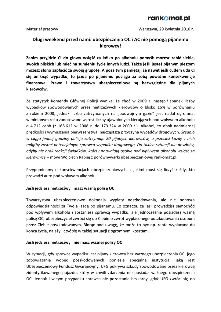 Materiał prasowy Warszawa, 29 kwietnia 2010 r. Długi weekend przed nami: ubezpieczenia OC i AC nie pomogą pijanemu kierowcy! Zanim przyjdzie Ci do głowy wsiąść za kółko po alkoholu pomyśl: możesz zabić siebie, swoich bliskich lub mieć na sumieniu życie innych ludzi. Także jeśli jesteś pijanym pieszym możesz słono zapłacić za swoją głupotę. A poza tym pamiętaj, że nawet jeśli cudem uda Ci się uniknąć wypadku, to jazda po pijanemu pociąga za sobą poważne konsekwencje finansowe. Prawo i towarzystwa ubezpieczeniowe są bezwzględne dla pijanych kierowców. Ze statystyk Komendy Głównej Policji wynika, że choć w 2009 r. nastąpił spadek liczby wypadków spowodowanych przez nietrzeźwych kierowców o blisko 15% w porównaniu z rokiem 2008, jednak liczba zatrzymanych na „podwójnym gazie” jest nadal ogromna: w minionym roku zanotowano wzrost liczby ujawnionych kierujących pod wpływem alkoholu o 4 712 osób (z 168 612 w 2008 r. do 173 324 w 2009 r.). Alkohol, to obok nadmiernej prędkości i wymuszania pierwszeństwa, najczęstsza przyczyna wypadów drogowych. Średnio w ciągu jednej godziny policja zatrzymuje 20 pijanych kierowców, a przecież każdy z nich mógłby zostać potencjalnym sprawcą wypadku drogowego. Do takich sytuacji nie doszłoby, gdyby nie brak reakcji świadków, którzy pozwalają osobie pod wpływem alkoholu wsiąść za kierownicę – mówi Wojciech Rabiej z porównywarki ubezpieczeniowej rankomat.pl. Przypominamy o konsekwencjach ubezpieczeniowych, z jakimi musi się liczyć każdy, kto prowadzi auto pod wpływem alkoholu. Jeśli jedziesz nietrzeźwy i masz ważną polisę OC Towarzystwa ubezpieczeniowe dokonają wypłaty odszkodowania, ale nie ponoszą odpowiedzialności za Twoją jazdę po pijanemu. Co oznacza, że jeśli prowadzisz samochód pod wpływem alkoholu i zostaniesz sprawcą wypadku, ale jednocześnie posiadasz ważną polisę OC, ubezpieczyciel zwróci się do Ciebie o zwrot wypłaconego odszkodowania osobom przez Ciebie poszkodowanym. Biorąc pod uwagę, że może to być np. renta wypłacana do końca życia, należy liczyć się w takiej sytuacji z ogromnymi kosztami. Jeśli jedziesz nietrzeźwy i nie masz ważnej polisy OC W sytuacji, gdy sprawcą wypadku jest pijany kierowca bez ważnego ubezpieczenia OC, jego zobowiązania wobec poszkodowanych poniesie specjalna instytucja, jaką jest Ubezpieczeniowy Fundusz Gwarancyjny. UFG pokrywa szkody spowodowane przez kierowcę zidentyfikowanego pojazdu, który w chwili zdarzenia nie posiadał ważnego ubezpieczenia OC. Jednak i w tym przypadku sprawca nie pozostanie bezkarny, gdyż UFG zwróci się do niego o zwrot poniesionych wydatków oraz nałoży karę za nieposiadanie ważnego ubezpieczenia OC. Jeśli jedziesz nietrzeźwy i masz AC Polisy dobrowolne (również mieszkaniowe, polisy na życie czy NNW) zawierają wyłączenie odpowiedzialności towarzystwa, jeśli szkody są związane z faktem, że ubezpieczony spowodował szkodę lub przyczynił się do niej, będąc pod wpływem alkoholu. Nietrzeźwy kierowca, który brał udział w wypadku nie może liczyć na wypłatę odszkodowania z dobrowolnego ubezpieczenia AC. Taki zapis towarzystwa wprowadziły do ogólnych warunków ubezpieczenia i jest to powszechna praktyka. Kierowca poruszający się pod wpływem alkoholu, narkotyków bądź innych środków odurzających nie otrzyma żadnego świadczenia z AC – mówi Wojtek Rabiej z rankomat.pl. Inne konsekwencje: grzywna i zakaz prowadzenia samochodów do lat 3 oraz pozbawienie wolności do 2 lat i zakaz prowadzenia samochodu do 10 lat W Polsce dopuszczalny poziom alkoholu we krwi kierowcy to 0,2 promila. Gdy zawartość alkoholu we krwi wynosi lub prowadzi do stężenia od 0,2 do 0,5 promila (czyli w wydychanym powietrzu od 0,1 mg do 0,25 mg alkoholu w 1 dm3) mamy do czynienia ze stanem po użyciu alkoholu. W takim przypadku pijanemu kierowcy grozi grzywna oraz zakaz prowadzenia pojazdów do 3 lat. Jeżeli poziom alkoholu we krwi jest większy niż 0,5 promila (a w wydychanym powietrzu jest go więcej niż 0,25 mg w 1 dm3) kierujący znajduje się w stanie nietrzeźwości, jest to przestępstwo, za które grozi pozbawienie wolności do 2 lat oraz zakaz prowadzenia samochodu nawet do 10 lat. Podróż z pijanym kierowcą a OC komunikacyjne Warto zastanowić się również, czy towarzystwo ubezpieczeniowe w ramach OC komunikacyjnego wypłaci nam odszkodowanie, jeśli podróżujemy z nietrzeźwym kierowcą i jesteśmy z jego winy uczestnikiem wypadku drogowego. W takiej sytuacji pasażerowie mogą mieć spore problemy z uzyskaniem należnego im świadczenia, a jeśli nawet zostanie ono przyznane, to powinni się liczyć z tym, że będzie o kilkadziesiąt procent niższe niż w razie wypadku spowodowanego przez trzeźwego kierowcę. Takie potrącenie wynika z faktu, że poszkodowany, akceptując nietrzeźwość kierowcy, przyczynił się do powstania szkody, zatem również powinien ponieść jej konsekwencje. Ograniczenie wysokości odszkodowania dotyczy także tych pasażerów, którzy są współwłaścicielami pojazdu. Tak zdarza się najczęściej wtedy, gdy osoba siedząca obok nietrzeźwego kierowcy jest małżonkiem. W praktyce wygląda to tak, że np. żona siadająca obok pijanego męża-kierowcy, może utracić swoje uprawnienia do jakichkolwiek wypłat od towarzystwa ubezpieczeniowego, jeśli przytrafi im się wypadek drogowy – dodaje Wojtek Rabiej. A jeśli wypadek spowodował pijany… pieszy? Bardzo często kierowcy zastanawiają się, czy można domagać się od pijanego pieszego pokrycia kosztów naprawy pojazdu, jeśli to pieszy spowodował kolizję. Odpowiedź brzmi: można. Tylko, że w takim wypadku pijany sprawca będzie ponosił wszystkie koszty szkód osobiście, co niestety wymaga procesu sądowego. Nawet jeśli posiadałby polisę OC w życiu prywatnym, co jest mało prawdopodobne, to polisa nie da mu ochrony, ponieważ standardowo we wsz