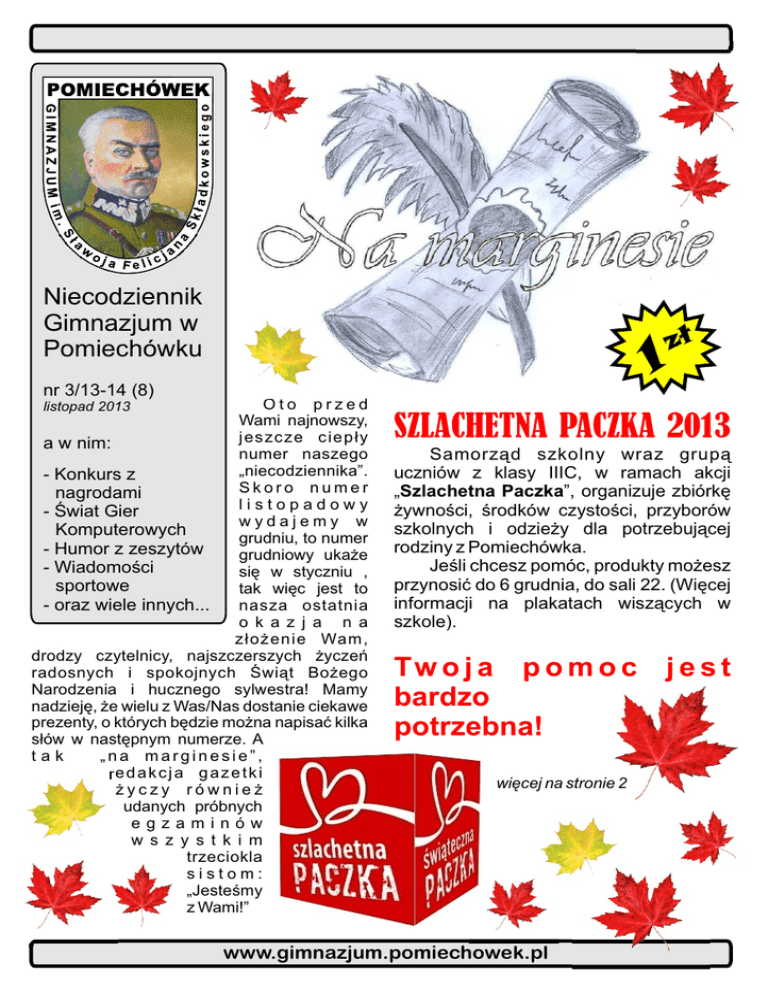 Niecodziennik Gimnazjum w Pomiechówku 1 nr 3/13-14 (8) Oto przed Wami najnowszy, jeszcze ciepły a w nim: numer naszego „niecodziennika”. - Konkurs z Skoro numer nagrodami listopadowy - Świat Gier wydajemy w Komputerowych grudniu, to numer - Humor z zeszytów grudniowy ukaże - Wiadomości się w styczniu , sportowe tak więc jest to - oraz wiele innych... nasza ostatnia o k a z j a n a złożenie Wam, drodzy czytelnicy, najszczerszych życzeń radosnych i spokojnych Świąt Bożego Narodzenia i hucznego sylwestra! Mamy nadzieję, że wielu z Was/Nas dostanie ciekawe prezenty, o których będzie można napisać kilka słów w następnym numerze. A tak „na marginesie”, redakcja gazetki życzy również udanych próbnych egzaminów w s z y s t k i m trzeciokla sistom: „Jesteśmy z Wami!” listopad 2013 zł SZLACHETNA PACZKA 2013 Samorząd szkolny wraz grupą uczniów z klasy IIIC, w ramach akcji „Szlachetna Paczka”, organizuje zbiórkę żywności, środków czystości, przyborów szkolnych i odzieży dla potrzebującej rodziny z Pomiechówka. Jeśli chcesz pomóc, produkty możesz przynosić do 6 grudnia, do sali 22. (Więcej informacji na plakatach wiszących w szkole). Tw o j a p o m o c j e s t bardzo potrzebna! więcej na stronie 2 www.gimnazjum.pomiechowek.pl „Na Marginesie” Plany SAMORZĄDOWE na listopad i grudzień: - Obchody Święta Niepodległości V Szkolny Turniej Warcabowy III Szkolny Turniej Skoków Narciarskich Góra Grosza 2013 "Szlachetna Paczka" Szkolny Konkurs na Świąteczny Wystrój Sal Konkurs plastyczny na Kartkę Bożonarodzeniową - Jasełka szkolne - i inne :) Mamy nadzieję, że wspólnie uda się nam sprawić, by przed świętami Bożego Narodzenia ktoś miał powód do uśmiechu i choć na chwilę zapomniał o zmartwieniach. nr 3/13-14 (8) Projekt Edukacyjny: 13 listopada minął pod znakiem "Zdjęć Klasowych", które, w ramach projektu edukacyjnego wykonywały uczennice klasy 2C (Natalia Kiliś, Joanna KostroOlechowska, Weronika Banach, Aleksandra Pietrzak, Karolina Turska Arakelyan) w sali konferencyjnej. Potrzeby rodziny: Żywność trwała: Herbata, Kawa, Ryż, Kasza, Makaron, Mąka, Cukier, Olej, Dżem, Konserwy mięsne, Konserwy rybne, Warzywa w puszkach. Produkty dla niemowląt: mleko modyfikowane (Bebiko) , zupki dla dziecka (od 5/6 miesiąca Gerber) Środki czystości: Proszek do prania, Płyny czyszczące, Płyn do mycia naczyń, Szampon, Pasta do zębów, Szczoteczka do zębów, Mydło/żel myjący . Kolejnym krokiem w/w projektu jest obróbka cyfrowa przygotowanego materiału i wywołanie pamiątkowych fotografii. TRZYMAMY KCIUKI !!! Artykuły dziecięce: „pampersy” (od 7-18kg, obojętne jakiej firmy) Pomoce szkolne: Zeszyty, Bloki, Kredki, Farbki, Plastelina, Papier kolorowy, Nożyczki, Klej, Piórnik, Plecak, Przybory do pisania Wyposażenie mieszkania: Koc, Poduszka, Pościel Szczególne upominki: Lalka dla pięciolatki, samochodzik dla trzylatka, maskotka dla pięciomiesięcznego dziecka !!! Najważniejsze potrzeby: żywność, odzież, środki czystości pomysłodawca: Kamil Bonas redaktor naczelny: Weronika Banach redakcja: Katarzyna Zyzek, Natalia Moczydłowska, Anna Smogorzewska, Marta Suska, Emilia Składanek, Ewelina Bierć, Mateusz Słowikowski, Kamila Szafrańska, Sebastian Wrzochol, Klaudia Łabęda, autor logo: Natalia Szczesna, opiekunowie: Barbara Więcław i Leszek Gałężewski nr 3/13-14 (8) „Na Marginesie” 11 listopada Czyli U roczyste Obchody 95 R o c z n i c y O d z y s k a n i a Niepodległości. 8 listopada, w ramach Dnia Niepodległości, g r u p a uczniów pod opieką p.Barbary Więcław, p.Justyny Mazurek i p.Piotra Wojciechowskiego przygotowała dla nas lekcję historii. Przedstawieniu towarzyszyła piękna oprawa muzyczna, w w y k o n a n i u szkolnego chóru. Była chwila zadumy, były łzy, był śmiech... [Zapis wideo przedstawienia obejrzeć możecie na szkolnej s t r o n i e internetowej] RED -3- nr 3/13-14 (8) „Na Marginesie” Konkurs Pieśni Patriotycznej "Pieśń ujdzie cało..." 14 listopada w Miejskim Centrum Kultury i Sztuki w Pułtusku, w sali kina „Narew”, odbył się IV Powiatowy Konkurs Pieśni Patriotycznej „Pieśń ujdzie cało”. Naszą szkołę i gminę reprezentował zespół wokalny w składzie: Marysia Piwowarek, Patrycja Winniak i Joanna Kostro-Olechowska, a opiekę nad nimi sprawowała p. Katarzyna Zawieska. Dziewczęta wykonały utwór „Tango na głos, orkiestrę i jeszcze jeden głos” z repertuaru Maryli Rodowicz, zdobywając WYRÓŻNIENIE w kategorii "Gimnazjum". GRATULUJEMY i życzymy dalszych sukcesów!!! Ich występ możecie obejrzeć na stronie naszego gimnazjum. Miejmy nadzieję, że w naszej szkole będzie się rozwijało coraz więcej talentów wokalnych, ale i nie tylko. CHÓMOR z ZESZYTUF - język angielski bee - owca rhino - jednorożec lub byk z rogiem truskawka - trasberry.” - „Po pierwszym bombardowaniu rozległo się wiele ofiar i pożarów.” - „Małczył je tak "tkurz by nie sie poniesi gniewowi" wiedzome jak własny pamietasz tym kroriem.” - „Rozmawiałem z naszymi księdzamy o wspólnych przyjacielach.” - „Harcerka to ta co harcuje.” - „Miałem połamane nogi i jedną nogę.” - „Harcerka to mały harcerz.” - „Gnębili mnie, aż straciłem nieprzytomność.” - „Muj dzadek myślę rze był dobrym dzudkiem mimo swej nerwość. Dawadz mi Przykład jak rzydź na tym świecie.” - „Drzewko to ..., to co rośnie.” - „Samożąt.” - „Kutnia.” - „Obfity opad śniegu - śniegobicie.” UWAGA !!! Zamieszczone żarty są autentyczne -4- nr 3/13-14 (8) „Na Marginesie” Odjazdowa BIBLIOTEKA Szkolna "Czytanie książek to najpiękniejsza zabawa, jaką sobie ludzkość wymyśliła" Wisława Szymborska "ENCYKLOPEDIA EDUKACYJNA" w 60 tomach to rzetelne i niezastąpione źródło informacji, przyjazny przewodnik po ścieżkach nauki i najważniejszych dziedzinach życia. Setki ilustracji - fotografie, re