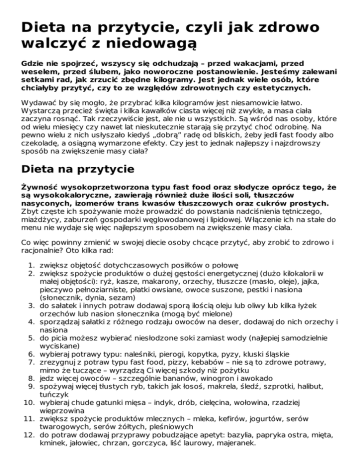 Dieta na przytycie, czyli jak zdrowo walczyć z niedowagą Gdzie nie spojrzeć, wszyscy się odchudzają – przed wakacjami, przed weselem, przed ślubem, jako noworoczne postanowienie. Jesteśmy zalewani setkami rad, jak zrzucić zbędne kilogramy. Jest jednak wiele osób, które chciałyby przytyć, czy to ze względów zdrowotnych czy estetycznych. Wydawać by się mogło, że przybrać kilka kilogramów jest niesamowicie łatwo. Wystarczą przecież święta i kilka kawałków ciasta więcej niż zwykle, a masa ciała zaczyna rosnąć. Tak rzeczywiście jest, ale nie u wszystkich. Są wśród nas osoby, które od wielu miesięcy czy nawet lat nieskutecznie starają się przytyć choć odrobinę. Na pewno wielu z nich usłyszało kiedyś „dobrą” radę od bliskich, żeby jedli fast foody albo czekoladę, a osiągną wymarzone efekty. Czy jest to jednak najlepszy i najzdrowszy sposób na zwiększenie masy ciała? Dieta na przytycie Żywność wysokoprzetworzona typu fast food oraz słodycze oprócz tego, że są wysokokaloryczne, zawierają również duże ilości soli, tłuszczów nasyconych, izomerów trans kwasów tłuszczowych oraz cukrów prostych. Zbyt częste ich spożywanie może prowadzić do powstania nadciśnienia tętniczego, miażdżycy, zaburzeń gospodarki węglowodanowej i lipidowej. Włączenie ich na stałe do menu nie wydaje się więc najlepszym sposobem na zwiększenie masy ciała. Co więc powinny zmienić w swojej diecie osoby chcące przytyć, aby zrobić to zdrowo i racjonalnie? Oto kilka rad: 1. zwiększ objętość dotychczasowych posiłków o połowę 2. zwiększ spożycie produktów o dużej gęstości energetycznej (dużo kilokalorii w małej objętości): ryż, kasze, makarony, orzechy, tłuszcze (masło, oleje), jajka, pieczywo pełnoziarniste, płatki owsiane, owoce suszone, pestki i nasiona (słonecznik, dynia, sezam) 3. do sałatek i innych potraw dodawaj sporą ilością oleju lub oliwy lub kilka łyżek orzechów lub nasion słonecznika (mogą być mielone) 4. sporządzaj sałatki z różnego rodzaju owoców na deser, dodawaj do nich orzechy i nasiona 5. do picia możesz wybierać niesłodzone soki zamiast wody (najlepiej samodzielnie wyciskane) 6. wybieraj potrawy typu: naleśniki, pierogi, kopytka, pyzy, kluski śląskie 7. zrezygnuj z potraw typu fast food, pizzy, kebabów – nie są to zdrowe potrawy, mimo że tuczące – wyrządzą Ci więcej szkody niż pożytku 8. jedz więcej owoców – szczególnie bananów, winogron i awokado 9. spożywaj więcej tłustych ryb, takich jak łosoś, makrela, śledź, szprotki, halibut, tuńczyk 10. wybieraj chude gatunki mięsa – indyk, drób, cielęcina, wołowina, rzadziej wieprzowina 11. zwiększ spożycie produktów mlecznych – mleka, kefirów, jogurtów, serów twarogowych, serów żółtych, pleśniowych 12. do potraw dodawaj przyprawy pobudzające apetyt: bazylia, papryka ostra, mięta, kminek, jałowiec, chrzan, gorczyca, liść laurowy, majeranek. 13. spożywaj 5–6 posiłków dziennie, najlepiej o tych samych godzinach codziennie, dozwolone jest pojadanie między posiłkami 14. dbaj o to, aby potrawy były kolorowe, estetycznie przygotowane i podane, mają one zachęcać do jedzenia Należy pamiętać, że dieta wysokokaloryczna powinna być wprowadzana powoli, aby przyzwyczaić organizm i układ pokarmowy do rosnącej ilości energii. Zwiększanie masy ciała jest procesem żmudnym i czasochłonnym, dlatego przed jej rozpoczęciem należy uzbroić się cierpliwość. Efekty nie pojawią się szybko, ale na pewno takie postępowanie nie przyniesie organizmowi szkód i zapewni utrzymanie zdrowia. Literatura: Rogulska A. Postępowanie dietetyczne w niedożywieniu, Wydawnictwo Lekarskie PZWL, Warszawa 2010 Author: Marta Konował Link do artykułu: http://bonavita.pl/dieta-na-przytycie-czyli-jak-zdrowo-walczyc-zniedowaga