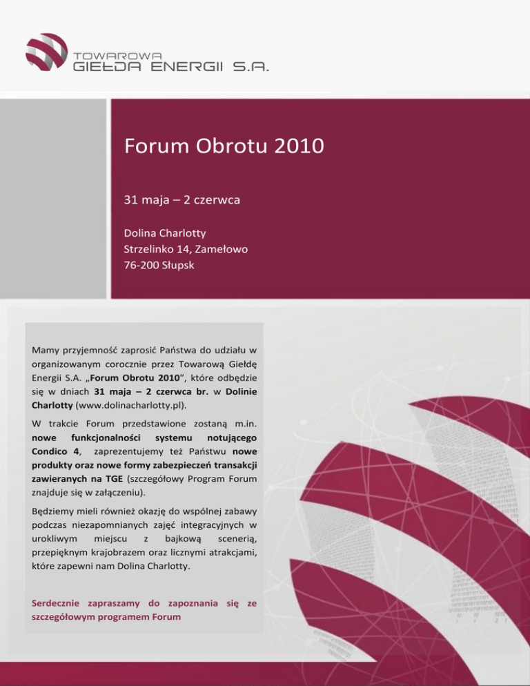 Forum Obrotu 2010 31 maja – 2 czerwca Dolina Charlotty Strzelinko 14, Zamełowo 76-200 Słupsk Mamy przyjemnośd zaprosid Paostwa do udziału w organizowanym corocznie przez Towarową Giełdę Energii S.A. „Forum Obrotu 2010”, które odbędzie się w dniach 31 maja – 2 czerwca br. w Dolinie Charlotty (www.dolinacharlotty.pl). W trakcie Forum przedstawione zostaną m.in. nowe funkcjonalności systemu notującego Condico 4, zaprezentujemy też Paostwu nowe produkty oraz nowe formy zabezpieczeo transakcji zawieranych na TGE (szczegółowy Program Forum znajduje się w załączeniu). Będziemy mieli również okazję do wspólnej zabawy podczas niezapomnianych zajęd integracyjnych w urokliwym miejscu z bajkową scenerią, przepięknym krajobrazem oraz licznymi atrakcjami, które zapewni nam Dolina Charlotty. Serdecznie zapraszamy do zapoznania się ze szczegółowym programem Forum Program I dzieo – 31/05 14.00 – 15.00 Obiad 15.00 – 15.45 TGE na wspólnym europejskim rynku energii 15.45 – 17.00 Nowa organizacja RDN w perspektywie market coupling 17.00 – 18.00 Prezentacja nowych funkcjonalności systemu notującego Condico 4 20.00 Kolacja w Rock Klubie II dzieo – 1/06 08.30 – 10.00 Śniadanie 10.00 – 11.30 Nowe produkty na TGE 11.30 – 13.00 Nowe formy zabezpieczeo transakcji zawieranych na TGE – IRGIT S.A. 13.00 – 14.00 Obiad 15.00 – 19.00 Zajęcia integracyjne 20.00 Kolacja III dzieo – 2/06 08.00 – 9.30 Śniadanie 10.00 – 12.00 Rola URE w kontrolowaniu realizacji obowiązku sprzedaży energii w trybie publicznym – przedstawiciel URE 12.00 – 13.00 Obiad i wyjazd z hotelu