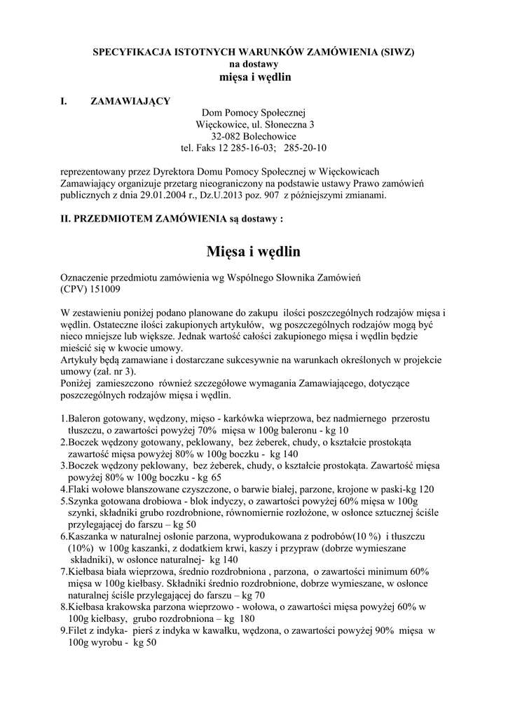 SPECYFIKACJA ISTOTNYCH WARUNKÓW ZAMÓWIENIA (SIWZ) na dostawy mięsa i wędlin I. ZAMAWIAJĄCY Dom Pomocy Społecznej Więckowice, ul. Słoneczna 3 32-082 Bolechowice tel. Faks 12 285-16-03; 285-20-10 reprezentowany przez Dyrektora Domu Pomocy Społecznej w Więckowicach Zamawiający organizuje przetarg nieograniczony na podstawie ustawy Prawo zamówień publicznych z dnia 29.01.2004 r., Dz.U.2013 poz. 907 z późniejszymi zmianami. II. PRZEDMIOTEM ZAMÓWIENIA są dostawy : Mięsa i wędlin Oznaczenie przedmiotu zamówienia wg Wspólnego Słownika Zamówień (CPV) 151009 W zestawieniu poniżej podano planowane do zakupu ilości poszczególnych rodzajów mięsa i wędlin. Ostateczne ilości zakupionych artykułów, wg poszczególnych rodzajów mogą być nieco mniejsze lub większe. Jednak wartość całości zakupionego mięsa i wędlin będzie mieścić się w kwocie umowy. Artykuły będą zamawiane i dostarczane sukcesywnie na warunkach określonych w projekcie umowy (zał. nr 3). Poniżej zamieszczono również szczegółowe wymagania Zamawiającego, dotyczące poszczególnych rodzajów mięsa i wędlin. 1.Baleron gotowany, wędzony, mięso - karkówka wieprzowa, bez nadmiernego przerostu tłuszczu, o zawartości powyżej 70% mięsa w 100g baleronu - kg 10 2.Boczek wędzony gotowany, peklowany, bez żeberek, chudy, o kształcie prostokąta zawartość mięsa powyżej 80% w 100g boczku - kg 140 3.Boczek wędzony peklowany, bez żeberek, chudy, o kształcie prostokąta. Zawartość mięsa powyżej 80% w 100g boczku - kg 65 4.Flaki wołowe blanszowane czyszczone, o barwie białej, parzone, krojone w paski-kg 120 5.Szynka gotowana drobiowa - blok indyczy, o zawartości powyżej 60% mięsa w 100g szynki, składniki grubo rozdrobnione, równomiernie rozłożone, w osłonce sztucznej ściśle przylegającej do farszu – kg 50 6.Kaszanka w naturalnej osłonie parzona, wyprodukowana z podrobów(10 %) i tłuszczu (10%) w 100g kaszanki, z dodatkiem krwi, kaszy i przypraw (dobrze wymieszane składniki), w osłonce naturalnej- kg 140 7.Kiełbasa biała wieprzowa, średnio rozdrobniona , parzona, o zawartości minimum 60% mięsa w 100g kiełbasy. Składniki średnio rozdrobnione, dobrze wymieszane, w osłonce naturalnej ściśle przylegającej do farszu – kg 70 8.Kiełbasa krakowska parzona wieprzowo - wołowa, o zawartości mięsa powyżej 60% w 100g kiełbasy, grubo rozdrobniona – kg 180 9.Filet z indyka- pierś z indyka w kawałku, wędzona, o zawartości powyżej 90% mięsa w 100g wyrobu - kg 50 10.Kiełbasa mielonka wieprzowa, o zawartości mięsa powyżej 60% w 100g kiełbasy, składniki średnio rozdrobnione - kg 40 11.Kiełbasa mortadela wieprzowo-wołowa, o zawartości mięsa 50% w 100g kiełbasy, homogenizowana, w osłonce sztucznej ściśle przylegającej do farszu – kg 60 12.Kiełbasa parówkowa wieprzowa, o zawartości powyżej 70% mięsa w 100g wyrobu , składniki drobno rozdrobnione, dobrze wymieszane, w osłonce sztucznej, ściśle przylegającej do farszu - kg 170 13.Kiełbasa szynkowa grubo rozdrobniona, wieprzowa, wędzona, parzona, zawierająca minimum 60% mięsa wieprzowego- kg 185 14.Kiełbasa wiejska drobiowa cienka, wędzona, pieczona o zawartości powyżej 70 gram mięsa drobiowego i 46 gram mięsa wieprzowego w 100g wyrobu. Składniki średnio rozdrobnione, dobrze wymieszane, w osłonce naturalnej, ściśle przylegającej do farszu kg 335 15.Kiełbasa zielonogórska wieprzowa ,średnio rozdrobniona, parzona zawierająca min.51% mięsa wieprzowego w 100 gramach kiełbasy - kg 60 16.Kiełbasa zwyczajna wieprzowa, cienka, składniki średnio rozdrobnione, o zawartości 60% mięsa w 100g kiełbasy, z małą ilością tłuszczu, w osłonce naturalnej ściśle przylegającej do farszu, skórka łatwo się ściągająca - kg110 17.Kiełbasa żywiecka wieprzowa, wędzona, pieczona, o zawartości powyżej 80% mięsa w 100g kiełbasy. Składniki średnio rozdrobnione, dobrze wymieszane. W osłonce sztucznej, ściśle przylegającej do farszu, przylegającej do farszu, skórka łatwo się ściągająca – kg 260 18.Kości wieprzowe kg 600 19.Kości wołowe kg 600 20.Kurczak świeży surowy, waga tuszki ok.1,60 kg I gat. oczyszczony, wypatroszony, barwa mięśnia różowa - kg 600 21.Mięso – filet z kurczaka surowy, I gat., bez kości, barwa mięśnia- różowa – kg 300 22.Mięso ćwiartka z kurczaka surowa, I gat. oczyszczony, bez piór, barwa mięśnia różowa - kg 865 23.Mięso gulaszowe wieprzowe gatunek I , chude, bez skóry, bez słoniny, barwa mięśnia-jasno różowa- kg 560 24.Mięso gulaszowe wołowe gatunek I chude, barwa mięśnia-jasno czerwona – kg 510 25.Mięso karczek wieprzowy bez kości I gat., chudy – kg 60 26.Mięso łopatka wieprzowa bez kości, I gat, bez skóry, bez słoniny, barwa mięśnia-jasno różowa – kg 50 27.Mięso pieczeń woł. I gat. młode, bez tłuszczu, o barwie mięśnia - jasno czerwonej, nie przerośnięta żyłami – kg 630 28.Mięso schab z kością I gat. bez słoniny, barwa mięśnia – różowa – kg 580 29.Mięso żeberka – surowe, wąskie, cięte paski, chude –kg 110 30.Ogonówka wędzona gotowana, wieprzowa, o zawartości powyżej 80% mięsa w 100g ogonówki – kg 230 31.Parówki cienkie drobiowo- wieprzowa o zawartości powyżej 60% mięsa w 100g wyrobu – kg 570 32.Pasztetowa drobiowa o zawartości surowców drobiowych powyżej 41% (skórki z indyka i kurczaka, wątroba z kurczaka, mięso mechanicznie oddzielone indycze), i surowców wieprzowych powyżej 20% (tłuszcz wieprzowy, skórki wieprzowe, wątroba wieprzowa) – kg 325 33.Pasztet drobiowy o zawartości podrobów i mięsa powyżej 70% w 100g wyrobu, powierzchnia pasztetu zapieczona- kg 80 34.Polędwica drobiowa grubo rozdrobniona zawierająca minimum 76 % mięsa drobiowego w 100 gramach polędwicy –kg 90 35.Polędwica sopocka wieprzowa wędzona, parzona, o zawartości powyżej 80% mięsa w 100g polędwicy – kg 35 36.Rolada boczkowa wędzona g