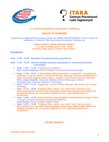 23 LUTEGO OGÓLNOPOLSKI DZIEŃ WALKI Z DEPRESJĄ DIALOG W CHOROBIE Organizatorzy ogólnopolskiej kampanii społecznej FORUM PRZECIW DEPRESJI -Servier Polska we współpracy z Fundacją ITAKA zapraszają mieszkańców Warszawy na: DZIEŃ OTWARTY FORUM PRZECIW DEPRESJI w środę 23 lutego, godz.11:00 – 18:00 Kinoteka, Pałac Kultury i Nauki, Plac Defilad 1 W programie: Godz. 11:00 – 18:00 Bezpłatne konsultacje lekarzy psychiatrów Godz. 11:00 – 15:30 Otwarte wykłady uznanych specjalistów w dziedzinie psychiatrii i psychologii: • Godz. 11:00 – 11:45 - O depresji bez tajemnic. Prof. Janusz Heitzman, Prezes Polskiego Towarzystwa Psychiatrycznego • Godz. 11:45 – 12:35 – O komunikacji lekarza psychiatry z pacjentem – na podstawie publikacji „Listy do Lekarza. Listy do Pacjentów. Depresja i Choroba Dwubiegunowa”. Jakie znaczenie odgrywa relacja lekarz – pacjent w skutecznym leczeniu depresji? Prof. Łukasz Święcicki, Ordynator Oddziału Chorób Afektywnych II Kliniki Psychiatrycznej Instytutu Psychiatrii i Neurologii Godz. 12.40 – 13:10 – Happening “ Forum Przeciw Depresji - Nie jesteś sam” (przed Kinoteką) Godz. 13:15 – 14:00 – Projekcja filmu „Dzień, noc, dzień”prof. Bartosza Łozy Kierownika Kliniki Psychiatrii Warszawskiego Uniwersytetu Medycznego (WUM) oraz Zastępcy Dyrektora ds. Lecznictwa Szpitala im. Prof. Jana Mazurkiewicza w Pruszkowie Godz. 14:00 – 14:45 – Kiedy człowiek z depresją ginie? Doświadczenia Fundacji ITAKA w pomocy ludziom dotkniętym problemem depresji. Anna Dziurka, Prezes Zarządu Fundacji ITAKA Godz. 14:50 – 15:30 – Projekcja filmu „Dzień, noc, dzień” prof. Bartosza Łozy Kierownika Kliniki Psychiatrii Warszawskiego Uniwersytetu Medycznego (WUM) oraz Zastępcy Dyrektora ds. Lecznictwa Szpitala im. Prof. Jana Mazurkiewicza w Pruszkowie • • • • WSTĘP WOLNY! HAPPENING PRZED KINOTEKĄ: 1 Przedstawienie Teatru Ulicznego zatytułowane „Nie jesteś sam” będzie wyrazem wsparcia dla osób zmagających się z problemem depresji. Do wzięcia udziału w tym wydarzeniu zapraszamy wszystkich, którzy zechcą wspólnie z artystami zaangaŜować się w spontaniczną dramę. Radosnymi rytmami oraz wachlarzem kolorów wspólnie udowodnimy, Ŝe depresja jest chorobą, z którą moŜna walczyć i z którą moŜna wygrać. Wypuszczone w niebo balony, w kulminacyjnym momencie widowiska, będą symbolem uwalniania ludzkich emocji. Uczestnicy happeningu otrzymają broszury i materiały edukacyjne, przygotowane specjalnie na potrzeby piątej edycji kampanii. Dołącz do nas! PokaŜemy razem, Ŝe chorzy na depresję nie są sami! Serdecznie zapraszamy! O KAMPANII FORUM PRZECIW DEPRESJI to ogólnopolska kampania społeczna organizowana od 2007r. Jej celem jest przede wszystkim uświadamianie społeczeństwu, Ŝe depresja nie jest chwilowym stanem, ale powaŜną chorobą, którą naleŜy leczyć. FORUM PRZECIW DEPRESJI ma takŜe pomóc w przełamywaniu oporu i niechęci chorych i ich rodzin przed zgłaszaniem się do lekarzy, terapeutów i grup wsparcia. FORUM PRZECIW DEPRESJI TO RÓWNIEś: ANTYDEPRESYJNY TELEFON ZAUFANIA FUNDACJI ITAKA: 022 654 40 41, przy którym dyŜurują lekarze psychiatrzy. Telefon jest czynny przez cały rok w poniedziałki i w czwartki w godzinach 17:00-20:00, a podczas Ogólnopolskiego Dnia Walki z Depresją (23 lutego) od godziny 12:00 do 22:00. STRONA INTERNETOWA: www.forumprzeciwdepresji.pl Powstała z myślą o osobach chorych na depresję i tych, których bliscy lub znajomi zmagają się z tą chorobą. Za jej pośrednictwem moŜna uzyskać wiele informacji o objawach, przebiegu i sposobach leczenia depresji oraz wykonać test ryzyka zachorowania na depresję. CHAT Z LEKARZEM PSYCHIATRĄ 23 lutego (w środę) w godzinach 14:00–17:00 oraz 25 lutego (w piątek) w godzinach 10:-13:00 moŜna będzie porozmawiac z lekarzem psychiatrą, który będzie dyŜurował na stronie www.forumprzeciwdepresji.pl. Zapraszamy do zadawania pytań. Dodatkowe informacje: Sylwia Olczak PRIMUM Public Relations Tel. 22 690 67 50, fax. 22 690 67 60 Tel. kom. 0 608 501 207 e-mail: [email protected] www.forumprzeciwdepresji.pl 2