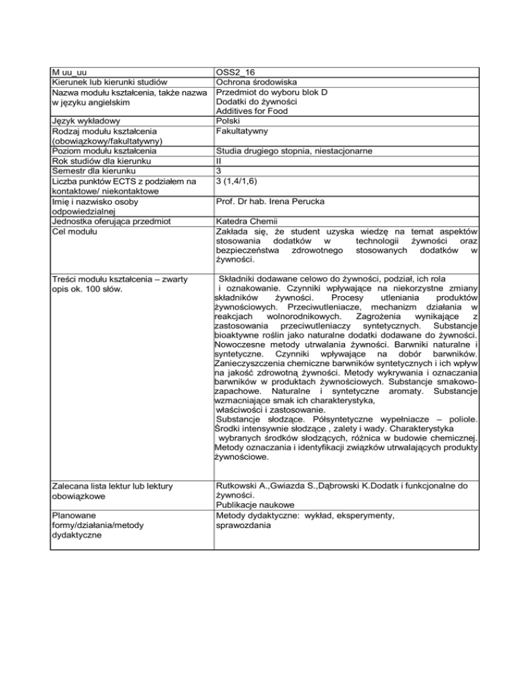 M uu_uu Kierunek lub kierunki studiów Nazwa modułu kształcenia, także nazwa w języku angielskim Język wykładowy Rodzaj modułu kształcenia (obowiązkowy/fakultatywny) Poziom modułu kształcenia Rok studiów dla kierunku Semestr dla kierunku Liczba punktów ECTS z podziałem na kontaktowe/ niekontaktowe Imię i nazwisko osoby odpowiedzialnej Jednostka oferująca przedmiot Cel modułu OSS2_16 Ochrona środowiska Przedmiot do wyboru blok D Dodatki do żywności Additives for Food Polski Fakultatywny Studia drugiego stopnia, niestacjonarne II 3 3 (1,4/1,6) Prof. Dr hab. Irena Perucka Katedra Chemii Zakłada się, że student uzyska wiedzę na temat aspektów stosowania dodatków w technologii żywności oraz bezpieczeństwa zdrowotnego stosowanych dodatków w żywności. Treści modułu kształcenia – zwarty opis ok. 100 słów. Składniki dodawane celowo do żywności, podział, ich rola i oznakowanie. Czynniki wpływające na niekorzystne zmiany składników żywności. Procesy utleniania produktów żywnościowych. Przeciwutleniacze, mechanizm działania w reakcjach wolnorodnikowych. Zagrożenia wynikające z zastosowania przeciwutleniaczy syntetycznych. Substancje bioaktywne roślin jako naturalne dodatki dodawane do żywności. Nowoczesne metody utrwalania żywności. Barwniki naturalne i syntetyczne. Czynniki wpływające na dobór barwników. Zanieczyszczenia chemiczne barwników syntetycznych i ich wpływ na jakość zdrowotną żywności. Metody wykrywania i oznaczania barwników w produktach żywnościowych. Substancje smakowozapachowe. Naturalne i syntetyczne aromaty. Substancje wzmacniające smak ich charakterystyka, właściwości i zastosowanie. Substancje słodzące. Półsyntetyczne wypełniacze – poliole. Środki intensywnie słodzące , zalety i wady. Charakterystyka wybranych środków słodzących, różnica w budowie chemicznej. Metody oznaczania i identyfikacji związków utrwalających produkty żywnościowe. Zalecana lista lektur lub lektury obowiązkowe Rutkowski A.,Gwiazda S.,Dąbrowski K.Dodatk i funkcjonalne do żywności. Publikacje naukowe Metody dydaktyczne: wykład, eksperymenty, sprawozdania Planowane formy/działania/metody dydaktyczne