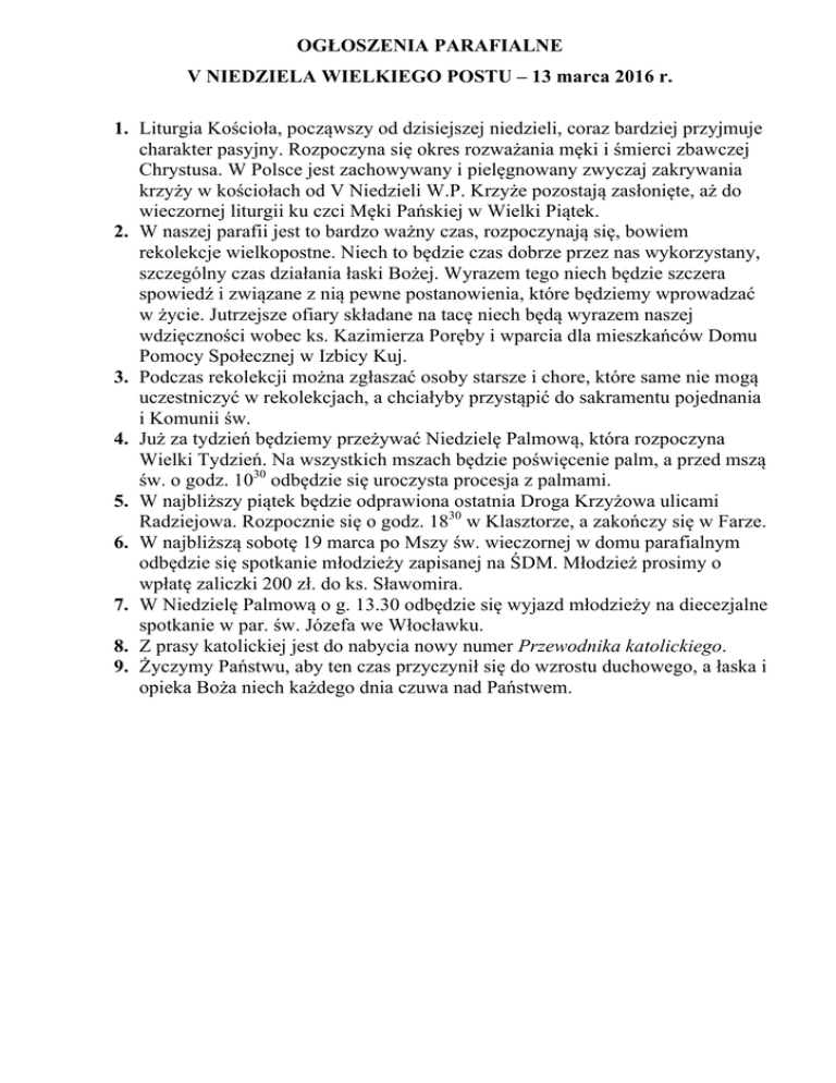 OGŁOSZENIA PARAFIALNE V NIEDZIELA WIELKIEGO POSTU – 13 marca 2016 r. 1. Liturgia Kościoła, począwszy od dzisiejszej niedzieli, coraz bardziej przyjmuje charakter pasyjny. Rozpoczyna się okres rozważania męki i śmierci zbawczej Chrystusa. W Polsce jest zachowywany i pielęgnowany zwyczaj zakrywania krzyży w kościołach od V Niedzieli W.P. Krzyże pozostają zasłonięte, aż do wieczornej liturgii ku czci Męki Pańskiej w Wielki Piątek. 2. W naszej parafii jest to bardzo ważny czas, rozpoczynają się, bowiem rekolekcje wielkopostne. Niech to będzie czas dobrze przez nas wykorzystany, szczególny czas działania łaski Bożej. Wyrazem tego niech będzie szczera spowiedź i związane z nią pewne postanowienia, które będziemy wprowadzać w życie. Jutrzejsze ofiary składane na tacę niech będą wyrazem naszej wdzięczności wobec ks. Kazimierza Poręby i wparcia dla mieszkańców Domu Pomocy Społecznej w Izbicy Kuj. 3. Podczas rekolekcji można zgłaszać osoby starsze i chore, które same nie mogą uczestniczyć w rekolekcjach, a chciałyby przystąpić do sakramentu pojednania i Komunii św. 4. Już za tydzień będziemy przeżywać Niedzielę Palmową, która rozpoczyna Wielki Tydzień. Na wszystkich mszach będzie poświęcenie palm, a przed mszą św. o godz. 1030 odbędzie się uroczysta procesja z palmami. 5. W najbliższy piątek będzie odprawiona ostatnia Droga Krzyżowa ulicami Radziejowa. Rozpocznie się o godz. 1830 w Klasztorze, a zakończy się w Farze. 6. W najbliższą sobotę 19 marca po Mszy św. wieczornej w domu parafialnym odbędzie się spotkanie młodzieży zapisanej na ŚDM. Młodzież prosimy o wpłatę zaliczki 200 zł. do ks. Sławomira. 7. W Niedzielę Palmową o g. 13.30 odbędzie się wyjazd młodzieży na diecezjalne spotkanie w par. św. Józefa we Włocławku. 8. Z prasy katolickiej jest do nabycia nowy numer Przewodnika katolickiego. 9. Życzymy Państwu, aby ten czas przyczynił się do wzrostu duchowego, a łaska i opieka Boża niech każdego dnia czuwa nad Państwem.
