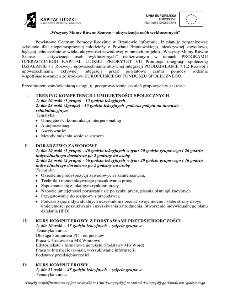 „Wszyscy Mamy Równe Szanse – aktywizacja osób wykluczonych” Powiatowe Centrum Pomocy Rodzinie w Braniewie informuje, iż planuje zorganizować szkolenia dla: niepełnosprawnej młodzieży z Powiatu Braniewskiego, nieaktywnej zawodowo, będącej jednocześnie w wieku aktywności zawodowej w ramach projektu „Wszyscy Mamy Równe Szanse – aktywizacja osób wykluczonych” realizowanym w ramach PROGRAMU OPERACYJNEGO KAPITAŁ LUDZKI PRIORYTET VII Promocja integracji społecznej DZIAŁANIE 7.1 Rozwój i upowszechnianie aktywnej integracji PODDZIAŁANIE 7.1.2 Rozwój i upowszechnianie aktywnej integracji przez powiatowe centra pomocy rodzinie współfinansowanych ze środków EUROPEJSKIEGO FUNDUSZU SPOŁECZNEGO. Przedmiotem zamówienia są usługi, tj. przeprowadzenie szkoleń grupowych w zakresie: I. II. TRENING KOMPETENCJI I UMIEJĘTNOŚCI SPOŁECZNYCH 1) dla 10 osób (1 grupa) - 15 godzin lekcyjnych 2) dla 23 osób (2grupa) - 15 godzin lekcyjnych podczas pobytu na turnusie rehabilitacyjnym Tematyka: Umiejętności komunikacji interpersonalnej Autoprezentacji Asertywności Metody radzenia sobie ze stresem DORADZTWO ZAWODOWE 1) dla 10 osób (1 grupa) - 40 godzin lekcyjnych w tym: 20 godzin grupowego i 20 godzin indywidualnego doradztwa po 2 godziny na osobę 2) dla 23 osób (2 grupa) - 66 godzin lekcyjnych w tym: 20 godzin grupowego i 46 godzin indywidualnego doradztwa po 2 godziny na osobę Tematyka: Określenie predyspozycji zawodowych i zainteresowań, Techniki i metod aktywnego poszukiwania pracy. Zapoznanie się z lokalnym rynkiem pracy Nabycie umiejętności poruszania się po rynku pracy, pisania pism aplikacyjnych Przygotowanie do rozmowy z pracodawcą Podczas zajęć indywidualnych uczestnik ma poznać swoje mocne i słabe strony nabyć umiejętności poszukiwania i uzyskiwania zatrudnienia. Stworzenie indywidualnego planu działania (IPD). III. KURS KOMPUTEROWY Z PODSTAWAMI PRZEDSIĘBIORCZOŚCI 1) dla 10 osób – 35 godzin lekcyjnych – zajęcia grupowe Tematyka kursu: Obsługa komputera PC - od podstaw Praca w środowisku MS Windows Edytor tekstu - formatowanie tekstu (Podstawy MS Word) Praca w Internecie (e-mail, wyszukiwanie informacji) Podstawy przedsiębiorczości IV. KURS KOMPUTEROWY 1) dla 23 osób – 45 godzin lekcyjnych – zajęcia grupowe Tematyka kursu: Projekt współfinansowany jest ze środków Unii Europejskiej w ramach Europejskiego Funduszu Społecznego „Wszyscy Mamy Równe Szanse – aktywizacja osób wykluczonych” Obsługa komputera PC - od podstaw Praca w środowisku MS Windows Edytor tekstu - formatowanie tekstu (Podstawy MS Word) Arkusz kalkulacyjny (Podstawy MS Excel) Praca w Internecie (e-mail, wyszukiwanie informacji) Wykonawca zobowiązuje się zapewnić: Pomieszczenia, w których możliwe będzie przeprowadzenie zajęć Poczęstunek podczas zajęć tj. kawa, herbata, napoje, paluszki, ciastka itp. Prowadzić dzienniki zajęć i listy obecności Wystawić certyfikaty potwierdzające ukończenie poszczególnych szkoleń Zajęcia „Trening kompetencji i umiejętności społecznych” planowany jest dla grupy 2 podczas turnusu rehabilitacyjnego. Osoba przeprowadzająca szkolenie wyjazdowe będzie miała zapewniony: nocleg oraz wyżywienie. Pozostałe szkolenia muszą zostać przeprowadzone stacjonarnie w Braniewie. Jeżeli jesteście państwo zainteresowani przeprowadzeniem w/w. szkoleń prosimy o przedstawienie oferty cenowej. W związku z powyższym zwracam się z prośbą o wypełnienie oferty cenowej i dostarczenie do biura projektu: Powiatowe Centrum Pomocy Rodzinie w Braniewie ul. Plac Piłsudskiego 2, 14-500 Braniewo (pokój nr 105 sekretariat), tel. 55 644-29-55. Formularz ofertowy w wersji elektronicznej można pobrać ze strony: http://www.pcprbraniewo.pl Menu pliki do pobrania PZP-druki formularz dostępny w wersji .pdf oraz .doc Oferty należy składać do dnia: 24.05.2010 08:00. W zamkniętych kopertach oznaczonych: ZORGANIZOWANIE SZKOLEŃ – OFERTA NIE OTWIERAĆ Termin związania ofertą: 14 dni (od ostatecznego terminu składania ofert). TERMIN WYKONANIA POSZCZEGÓLNYCH MODUŁÓW SZKOLENIOWYCH VI – XII 2010 r. Harmonogram przeprowadzenia szkoleń: Lp. Nazwa szkolenia 1. Doradztwo zawodowe Trening kompetencji i umiejętności 2. społecznych Trening kompetencji i umiejętności 3. społecznych 4. Kurs komputerowy Kurs komputerowy z podstawami 5. przedsiebiorczości Grupa docelowa 1i2 Miesiąc -2010 r. Czerwiec 2 Wrzesień 1 Październik 1 Listopad/Grudzień 2 Listopad/Grudzień Kryteria oceny ofert: Zamawiający dokona wyboru najkorzystniejszej oferty w oparaciu o nastepujące kryteria: Projekt współfinansowany jest ze środków Unii Europejskiej w ramach Europejskiego Funduszu Społecznego „Wszyscy Mamy Równe Szanse – aktywizacja osób wykluczonych” Cena – 100% Kryterium „cena” punktowo oceniane będzie w skali 0-100 pkt. Liczba punktów (C) w powyższym kryterium liczona będzie następująco: C = (cena oferty najtańszej)/(cena oferty badanej) x 100 pkt. Zamawiający dokona oceny i wyboru najkorzystniejszej oferty. W związku z powyższym zwracamy się z prośbą o informację, czy jesteście Państwo w stanie zorganizować w/w szkolenia w podanym zakresie. Z poważaniem Kierownik PCPR Braniewo – Małgorzata Dunajska Projekt współfinansowany jest ze środków Unii Europejskiej w ramach Europejskiego Funduszu Społecznego