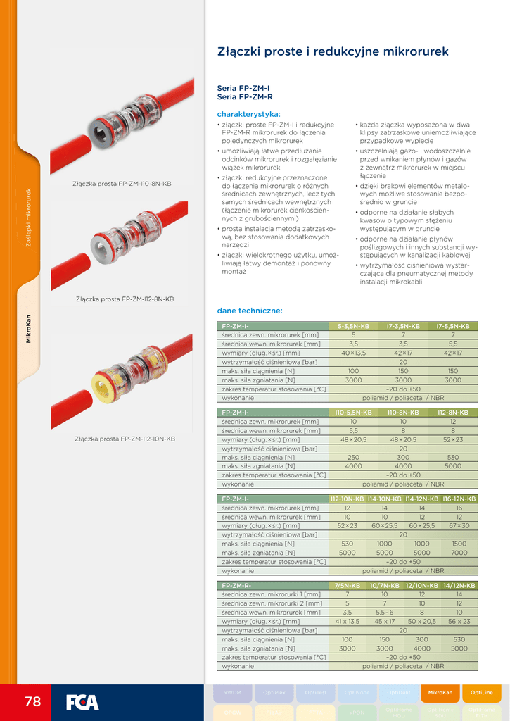 Złączki proste i redukcyjne mikrorurek Seria FP-ZM-I Seria FP-ZM-R charakterystyka: Zaślepki mikrorurek Złączka prosta FP-ZM-I10-8N-KB • złączki proste FP-ZM-I i redukcyjne FP-ZM-R mikrorurek do łączenia pojedynczych mikrorurek • każda złączka wyposażona w dwa klipsy zatrzaskowe uniemożliwiające przypadkowe wypięcie • umożliwiają łatwe przedłużanie odcinków mikrorurek i rozgałęzianie wiązek mikrorurek • uszczelniają gazo- i wodoszczelnie przed wnikaniem płynów i gazów z zewnątrz mikrorurek w miejscu łączenia • złączki redukcyjne przeznaczone do łączenia mikrorurek o różnych średnicach zewnętrznych, lecz tych samych średnicach wewnętrznych (łączenie mikrorurek cienkościennych z grubościennymi) • dzięki brakowi elementów metalowych możliwe stosowanie bezpośrednio w gruncie • odporne na działanie słabych kwasów o typowym stężeniu występującym w gruncie • prosta instalacja metodą zatrzaskową, bez stosowania dodatkowych narzędzi MikroKan OptiNode • złączki wielokrotnego użytku, umożliwiają łatwy demontaż i ponowny montaż • odporne na działanie płynów poślizgowych i innych substancji występujących w kanalizacji kablowej • wytrzymałość ciśnieniowa wystarczająca dla pneumatycznej metody instalacji mikrokabli Złączka prosta FP-ZM-I12-8N-KB dane techniczne: Złączka prosta FP-ZM-I12-10N-KB FP-ZM-Iśrednica zewn. mikrorurek [mm] średnica wewn. mikrorurek [mm] wymiary (dług. × śr.) [mm] wytrzymałość ciśnieniowa [bar] maks. siła ciągnienia [N] maks. siła zgniatania [N] zakres temperatur stosowania [°C] wykonanie 5-3,5N-KB 5 3,5 40 × 13,5 I7-3,5N-KB I7-5,5N-KB 7 7 3,5 5,5 42 × 17 42 × 17 20 100 150 150 3000 3000 3000 –20 do +50 poliamid / poliacetal / NBR FP-ZM-Iśrednica zewn. mikrorurek [mm] średnica wewn. mikrorurek [mm] wymiary (dług. × śr.) [mm] wytrzymałość ciśnieniowa [bar] maks. siła ciągnienia [N] maks. siła zgniatania [N] zakres temperatur stosowania [°C] wykonanie I10-5,5N-KB 10 5,5 48 × 20,5 I10-8N-KB I12-8N-KB 10 12 8 8 48 × 20,5 52 × 23 20 250 300 530 4000 4000 5000 –20 do +50 poliamid / poliacetal / NBR FP-ZM-II12-10N-KB I14-10N-KB I14-12N-KB I16-12N-KB średnica zewn. mikrorurek [mm] 12 14 14 16 średnica wewn. mikrorurek [mm] 10 10 12 12 wymiary (dług. × śr.) [mm] 52 × 23 60 × 25,5 60 × 25,5 67 × 30 wytrzymałość ciśnieniowa [bar] 20 maks. siła ciągnienia [N] 530 1000 1000 1500 maks. siła zgniatania [N] 5000 5000 5000 7000 zakres temperatur stosowania [°C] –20 do +50 wykonanie poliamid / poliacetal / NBR FP-ZM-Rśrednica zewn. mikrorurki 1 [mm] średnica zewn. mikrorurki 2 [mm] średnica wewn. mikrorurek [mm] wymiary (dług. × śr.) [mm] wytrzymałość ciśnieniowa [bar] maks. siła ciągnienia [N] maks. siła zgniatania [N] zakres temperatur stosowania [°C] wykonanie 78 7/5N-KB 7 5 3,5 41 x 13,5 100 3000 10/7N-KB 12/10N-KB 14/12N-KB 10 12 14 7 10 12 5,5 – 6 8 10 45 x 17 50 x 20,5 56 x 23 20 150 300 530 3000 4000 5000 –20 do +50 poliamid / poliacetal / NBR xWDM OptiPlex OptiTest OptiNode OptiDukt MikroKan OptiLine OPGW FibAir FTTA xPON OptiHome MDU OptiHome SDU OptiHome FITH