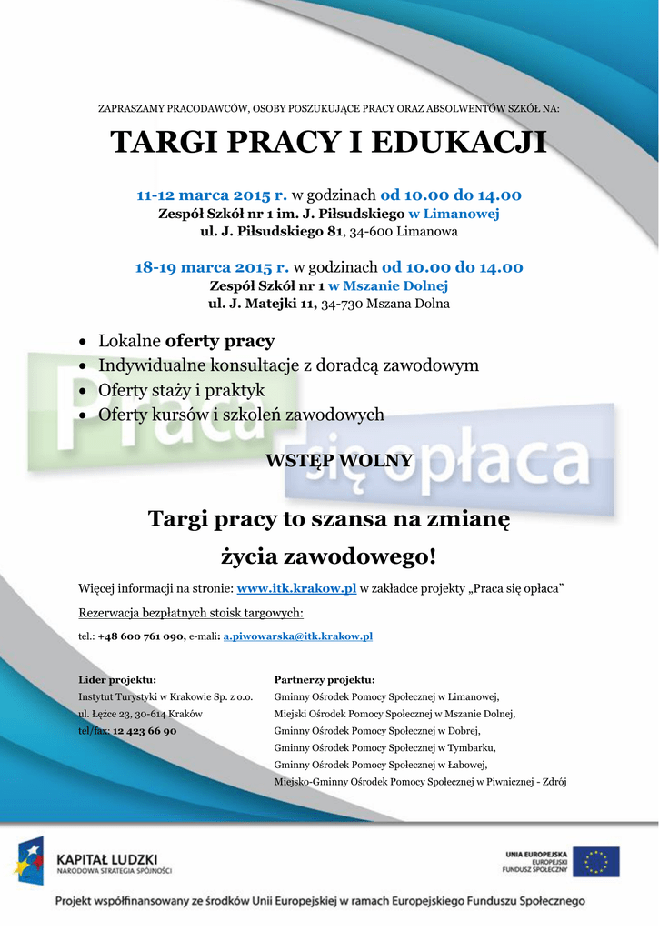 ZAPRASZAMY PRACODAWCÓW, OSOBY POSZUKUJĄCE PRACY ORAZ ABSOLWENTÓW SZKÓŁ NA: TARGI PRACY I EDUKACJI 11-12 marca 2015 r. w godzinach od 10.00 do 14.00 Zespół Szkół nr 1 im. J. Piłsudskiego w Limanowej ul. J. Piłsudskiego 81, 34-600 Limanowa 18-19 marca 2015 r. w godzinach od 10.00 do 14.00 Zespół Szkół nr 1 w Mszanie Dolnej ul. J. Matejki 11, 34-730 Mszana Dolna Lokalne oferty pracy Indywidualne konsultacje z doradcą zawodowym Oferty staży i praktyk Oferty kursów i szkoleń zawodowych WSTĘP WOLNY Targi pracy to szansa na zmianę życia zawodowego! Więcej informacji na stronie: www.itk.krakow.pl w zakładce projekty „Praca się opłaca” Rezerwacja bezpłatnych stoisk targowych: tel.: +48 600 761 090, e-mali: [email protected] Lider projektu: Partnerzy projektu: Instytut Turystyki w Krakowie Sp. z o.o. Gminny Ośrodek Pomocy Społecznej w Limanowej, ul. Łężce 23, 30-614 Kraków Miejski Ośrodek Pomocy Społecznej w Mszanie Dolnej, tel/fax: 12 423 66 90 Gminny Ośrodek Pomocy Społecznej w Dobrej, Gminny Ośrodek Pomocy Społecznej w Tymbarku, Gminny Ośrodek Pomocy Społecznej w Łabowej, Miejsko-Gminny Ośrodek Pomocy Społecznej w Piwnicznej - Zdrój