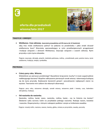 TRADYCJE I OBRZĘDY  Wielkanoc. Czas odnowy. (warsztat prowadzimy od 20 marca do 12 kwietnia) Jaką moc miała wielkanocna palma? Co jedzono na przednówku i jakie smaki skrywał wielkanocny kosz? Warsztaty wprowadzające w rytm przedświątecznych przygotowań i tradycje związane z okresem Wielkanocy. Zwyczaje związane z czasem odnowy. Rytm przyrody a rytm życia człowieka. Pojęcia: zwyczaje, obrzędy, pisanki, niedziela palmowa, rośliny, przednówek, post, postne menu, życie codzienne, tradycja, święta, symbolika. PRZYRODA  Cztery pory roku. Wiosna. Widzieliście już pierwsze przebiśniegi? Słyszeliście brzęczenie muchy? A może wypatrzyliście nadlatującego bociana? Wspólne odkrywanie pierwszych oznak wiosny i obserwacja budzącej się do życia przyrody. Budowanie bocianich gniazd i poszukiwanie najlepszych ziaren na wysiew. Tworzenie mini szklarni do własnych obserwacji. Pojęcia: pory roku, wiosenne obrzędy, oznaki wiosny, wiosenne ptaki i kwiaty, czas, kalendarz obrzędowy, tradycja.  Od nasionka do nasionka. Nasionko, roślina, kwiat, owoc, nasionko, roślina, kwiat… czy ta historia ma koniec? Śledzenie cyklu wzrostu roślin na przykładzie jednego nasionka. Rodzaje nasion, kwiatów i owoców. Eksperymenty z różnymi rodzajami podłoża i wizyta w królestwie owadów. Pojęcia: rozwój roślin, nasiona, owoce, kwiaty, gleba, zmiany w przyrodzie, owady, pszczoły. Muzeum Etnograficzne im. Seweryna Udzieli w Krakowie I www.etnomuzeum.eu I [email protected] I 12 430 60 23 LOGIKA  Matematyka na ludowo. Jak nie stracić rachuby w izbie, kopie i tuzinie? Czy stopy i łokcie mogą ułatwić zakupy? Rachunki w wiejskiej chacie i góralskim szałasie. Dawne sposoby handlu i rozliczeń wprowadzające uczestników w podstawowe problemy matematyczne. Pojęcia: matematyka, dodawanie, odejmowanie, targ, handel, jarmark, dawne miary i wagi, mierzenie długości, bezmian.  Jak to działa? Czy dom może funkcjonować bez prądu? Co łączy kołowrotek, lokomotywę i rowerek? Zabawy fizyką i fizyka w zabawie. Wprawianie w ruch dawnych mechanizmów i tropienie tradycyjnych rozwiązań w nowoczesnej odsłonie. Proste eksperymenty z kołami, bloczkami, przekładniami i dźwigniami. Pojęcia: dawne sprzęty domowe, pojazdy, mechanizmy, maszyny proste, zabawy konstrukcyjne, eksperymenty, mechanika. DAWNIEJ I DZIŚ  Gdzie mieszkali Krakowiak i Krakowianka. Jak wyglądał dawny dom i jego mieszkańcy? Wizyta w izbie krakowskiej połączona z niezwykłymi opowieściami, przymierzaniem dawnych strojów i pracą z rekwizytami. Pojęcia: Kraków, mała ojczyzna, opowieść, rzemiosło, rodzina, teatr, rolnictwo.  Chodź, opowiem Ci legendę. Czy legend można tylko słuchać? A może uda się je powąchać, dotknąć lub wytańczyć? Opowieści magicznego Krakowa tworzone słowem, ruchem, dźwiękiem i obrazem. Radość wspólnego opowiadania i przeżywania historii przy pomocy różnych zmysłów. Pojęcia: legenda, historia Krakowa, symbol, atrybut, Smok Wawelski, św. Kinga, Lajkonik, Twardowski, strój ludowy, teatr, ścieżka zmysłów.  Laboratorium zabawy. Co zrobić z wolnym czasem, gdy nie ma pod ręką tableta, telewizora ani nawet książki? Jak pokonać nudę za pomocą patyków, kredy i starych szmatek? Pomysły na czas wolny sprzed stu lat. Wprawianie w ruch zabawek z odpustowych kramów, podwórek i wiejskich chat. Pojęcia: dawne zabawki, gry i zabawy dziecięce, czas wolny, obowiązki dzieci, życie codzienne na wsi i w mieście, zwyczaje. Muzeum Etnograficzne im. Seweryna Udzieli w Krakowie I www.etnomuzeum.eu I [email protected] I 12 430 60 23 INFORMACJE PRAKTYCZNE Wielkość grup Warsztaty prowadzimy dla grup nie większych niż 25 osób. Większym grupom proponujemy podzielenie uczestników na dwa zespoły. W tym wypadku prosimy o wybranie dwóch tematów z listy warsztatów dostępnych na stronie. Opiekunowie grup Opiekunowie są zwolnieni z opłat za wejście na warsztat. Zachęcamy do aktywnego uczestniczenia w zajęciach. Prosimy o czuwanie nad zachowaniem grupy i współpracę z osobą prowadzącą. Czas trwania Dla przedszkolaków w wieku od 3 do 4 lat warsztat trwa 60 minut, dla pozostałych grup 90 minut. Prowadzący czeka na spóźnioną grupę 15 minut. Cennik Koszt warsztatu muzealnego (poza warsztatami świątecznymi) wynosi 7 zł od dziecka dla grup powyżej 11 osób, Mniejsze grupy są zobowiązane do zakupu 11 biletów. Istnieje też możliwość wykupienia karnetu. W ramach karnetu oferujemy pakiet trzech warsztatów w cenie 6 zł od dziecka. Karnety są przeznaczone dla grup powyżej 11 osób i zachowują ważność przez cały rok szkolny. Koszt warsztatu dotyczącego tematyki świątecznej („Wielkanoc. Czas odnowy.”) wynosi 10 zł od uczestnika. Honorujemy Kartę Dużej Rodziny. Każdy uczestnik grupy zorganizowanej posiadający KDR zapłaci 50% mniej za udział w zwiedzaniu i zajęciach edukacyjnych. Dojazd i parking Muzeum Etnograficzne w Krakowie mieści się dwóch budynkach na krakowskim Kazimierzu. Kolekcja stała oraz część wystaw czasowych usytuowane są w budynku Ratusza, przy placu Wolnica 1. Wystawy czasowe można także oglądać w budynku przy ulicy Krakowskiej 46, zlokalizowanym około 200 metrów od Ratusza. Muzeum nie posiada parkingu. Najbliższy parking dla autokarów mieści się przy ul. Dajwór (1 stanowisko, postój do 10 min). Rezerwacja warsztatów Warsztaty prowadzimy jedynie dla grup, które dokonały wcześniejszej rezerwacji. Prosimy o zgłaszanie zamówienia z tygodniowym wyprzedzeniem. Rezerwacje przyjmujemy od poniedziałku do piątku w godzinach 9.00 – 17.00 pod numerem telefonu 12 430 60 23 lub pod adresem [email protected]. W przypadku nieuzasadnionej rezygnacji z zarezerwowanych zajęć, zamawiający ponosi połowę kosztów. Muzeum Etnograficzne im. Seweryna Udzieli w Krakowie I www.etnomuzeum.eu I [email protected] I 12 430 60 23