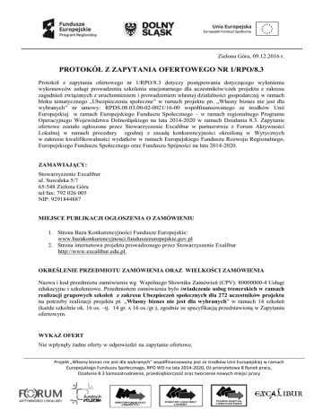 Zielona Góra, 09.12.2016 r. PROTOKÓŁ Z ZAPYTANIA OFERTOWEGO NR 1/RPO/8.3 Protokół z zapytania ofertowego nr 1/RPO/8.3 dotyczy postępowania dotyczącego wyłonienia wykonawców usługi prowadzenia szkolenia stacjonarnego dla uczestników/czek projektu z zakresu zagadnień związanych z uruchomieniem i prowadzeniem własnej działalności gospodarczej w ramach bloku tematycznego „Ubezpieczenia społeczne” w ramach projektu pn. „Własny biznes nie jest dla wybranych” nr umowy: RPDS.08.03.00-02-0021/16-00 współfinansowanego ze środków Unii Europejskiej w ramach Europejskiego Funduszu Społecznego – w ramach regionalnego Programu Operacyjnego Województwa Dolnośląskiego na lata 2014-2020 w ramach Działania 8.3. Zapytanie ofertowe zostało ogłoszone przez Stowarzyszenie Excalibur w partnerstwie z Forum Aktywności Lokalnej w ramach procedury zgodnej z zasadą konkurencyjności określoną w Wytycznych w zakresie kwalifikowalności wydatków w ramach Europejskiego Funduszu Rozwoju Regionalnego, Europejskiego Funduszu Społecznego oraz Funduszu Spójności na lata 2014-2020. ZAMAWIAJĄCY: Stowarzyszenie Excalibur ul. Suwalska 5/7 65-548 Zielona Góra tel/fax: 792 026 005 NIP: 9291844887 MIEJSCE PUBLIKACJI OGŁOSZENIA O ZAMÓWIENIU 1. Strona Baza Konkurencyjności Fundusze Europejskie: www.bazakonkurencyjnosci.funduszeeuropejskie.gov.pl 2. Strona internetowa projektu prowadzonego przez Stowarzyszenie Exalibur http://www.excalibur.edu.pl. OKREŚLENIE PRZEDMIOTU ZAMÓWIENIA ORAZ WIELKOŚCI ZAMÓWIENIA Nazwa i kod przedmiotu zamówienia wg Wspólnego Słownika Zamówień (CPV): 80000000-4 Usługi edukacyjne i szkoleniowe. Przedmiotem zamówienia było świadczenie usług trenerskich w ramach realizacji grupowych szkoleń z zakresu Ubezpieczeń społecznych dla 272 uczestników projektu na potrzeby realizacji projektu pt. „Własny biznes nie jest dla wybranych” w ramach 14 szkoleń (każde szkolnie ok. 16 os. –tj. 14 gr. x 16 os./gr.), zgodnie ze specyfikacją przedstawioną w Zapytaniu ofertowym. WYKAZ OFERT Nie wpłynęły żadne oferty w odpowiedzi na zapytanie ofertowe. Projekt „Własny biznes nie jest dla wybranych” współfinansowany jest ze środków Unii Europejskiej w ramach Europejskiego Funduszu Społecznego, RPO WD na lata 2014-2020, Oś priorytetowa 8 Rynek pracy, Działanie 8.3 Samozatrudnienie, przedsiębiorczość oraz tworzenie nowych miejsc pracy INFORMACJA O SPEŁNIENIU WARUNKÓW UDZIAŁU W POSTĘPOWANIU RZEZ WYKONAWCÓW Nie wpłynęły żadne oferty w odpowiedzi na zapytanie ofertowe. INFORMACJA O SPEŁNIENIU WARUNKU, O KTÓRYM MOWA W PKT 2 LIT. A WYTYCZNYCH W ZAKRESIE KWALIFIKOWALNOŚCI WYDATKÓW Nie wpłynęły żadne oferty w odpowiedzi na zapytanie ofertowe. INFORMACJA O WAGACH PUNKTOWYCH LUB PROCENTOWYCH PRZYPISANYCH DO POSZCZEGÓLNYCH KRYTERIÓW OCENY I SPOSOBIE PRZYZNAWANIA PUNKTACJI POSZCZEGÓLNYM WYKONAWCOM ZA SPEŁNIENIE DANEGO KRYTERIUM Nie wpłynęły żadne oferty w odpowiedzi na zapytanie ofertowe. WSKAZANIE WYBRANEJ OFERTY WRAZ Z UZASADNIENIEM WYBORU Nie wpłynęły żadne oferty w odpowiedzi na zapytanie ofertowe. DATA SPORZĄDZENIA PROTOKOŁU I PODPIS ZAMAWIAJĄCEGO Zielona Góra, 09.12.2016 r. …………………………………………………… ZAŁĄCZNIKI: 1. Potwierdzenie upublicznienia zapytania ofertowego na stronach internetowych 2. Złożone oferty – nie dotyczy. 3. Oświadczenie/oświadczenia o braku powiązań z wykonawcami, którzy złożyli oferty, podpisane przez osoby wykonujące w imieniu zamawiającego czynności związane z procedurą wyboru wykonawcy, w tym biorące udział w procesie oceny ofert (tj. powiązań, o których mowa pkt 2 lit. b) – nie dotyczy. Projekt „Własny biznes nie jest dla wybranych” współfinansowany jest ze środków Unii Europejskiej w ramach Europejskiego Funduszu Społecznego, RPO WD na lata 2014-2020, Oś priorytetowa 8 Rynek pracy, Działanie 8.3 Samozatrudnienie, przedsiębiorczość oraz tworzenie nowych miejsc pracy