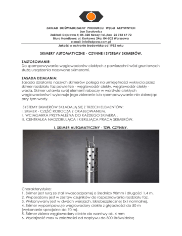 ZAKŁAD DOŚWIADCZALNY PRODUKCJI WĘGLI AKTYWNYCH Jan Saratowicz Zakład: Dąbrowa 4; 05-320 Mrozy; tel./fax 25 752 67 72 Biuro Handlowe: ul. Korkowa 24a; 04-502 Warszawa e-mail: [email protected] Jakość w ochronie środowiska od 1982 roku SKIMERY AUTOMATYCZNE - CZYNNE I SYSTEMY SKIMERÓW. ZASTOSOWANIE: Do spompowywania węglowodorów ciekłych z powierzchni wód gruntowych służą urządzenia nazywane skimerami. ZASADA DZIAŁANIA: Zasada działania naszych skimerów polega na umiejętności wykrycia przez skimer rozdziału faz powietrze - węglowodór ciekły, węglowodór ciekły woda. Skimer ustawia swój element roboczy w warstwie ciekłych węglowodorów i wykonuje jego zbieranie lub spompowywanie nie zbierając przy tym wody. SYSTEMY SKIMERÓW SKŁADAJĄ SIĘ Z TRZECH ELEMENTÓW: I. SKIMER - CZĘŚĆ ROBOCZA Z OKABLOWANIEM, II. WCIĄGARKA PRZYNALEŻNA DO KAŻDEGO SKIMERA , III. CENTRALKA NADZORUJĄCA I KIERUJĄCA PRACĄ SKIMERÓW. I. SKIMER AUTOMATYCZNY - TZW. CZYNNY. Charakterystyka: 1. Skimer jest rurą ze stali kwasoodpornej o średnicy 90mm i długości 1,4 m. 2. Wyposażony jest w zestaw czujników do rozpoznawania rozdziału faz. 3. Wykonywany jest w dwóch wersjach. Iskrobezpiecznej Ex i normalnej. 4. Skimer wypompowuje węglowodory ciekłe z głębokości do 50 m (wykonanie specjalne do 70 m). 5. Skimer zbiera węglowodory ciekłe do warstwy ok. 4 mm 6. Wydajność max w zależności od napływu do 800 litrów/dobę II. WCIĄGARKA. Elementem ustawiającym skimer w pożądanym położeniu, zbierającym, przetwarzającym i przesyłającym informacje dotyczące pracy skimera, a także zarządzającym jego pracą jest urządzenie umownie nazywane Wciągarką. Wciągarka jest urządzeniem mechaniczno – elektrycznym realizującym następujące funkcje: 1. Ustawia skimer w odpowiednim położeniu względem wody w warstwie węglowodorów. 2. Zawiaduje pracą skimera. 3. Jest wyposażona w program samouczenia potrafiący dobierać czas napełniania i wypróżniania skimera do warunków lokalnych napływów do odwiertów. 4. Wyposażona jest w czujnik przepełnienia zbiornika zewnętrznego wyłączający skimer do czasu wymiany zbiornika. 5. Przesyła do Centrali systemu dane o pracy skimera takie jak: czas sczerpywania, czas spompowywania, ilość spompowanego produktu, ilości wody wypompowanej z otworu podczas depresjonowania i wielu innych. 6. Po założeniu na rurociąg pompy depresjonującej automatycznego zaworu regulacyjnego wraz z przepływomierzem można poprzez wciągarkę sterować jej wydajnością. III. CENTRALKA. Elementem scalającym poszczególne skimery w system jest Centralka. Zadaniem Centralki systemu jest: 1. Synchronizacja pracy skimerów, dzięki czemu system zużywa do swej pracy znikomą ilości energii elektrycznej oraz sprężonego powietrza (w przypadku urządzeń pneumatycznych). 2. Centralka jest elementem łączącym system skimerów z osobami zawiadującymi systemem. 3. Z jej pomocą można sterować systemem na odległość poprzez telefon komórkowy za pośrednictwem SMS. Centralka przekazuje dane o pracy systemu geologowi prowadzącemu prace rekultywacyjne. 4. Również poprzez Centralkę, drogą telefoniczną można sterować na odległość systemem zmieniając nastawy parametrów pracy systemu i poszczególnych skimerów. 5. Wbudowany w nią układ archiwizacji danych pozwala na prześledzenie zmian szybkości napływu i miąższości warstwy w każdym otworze oraz wszelkich istotnych parametrów pracy poprzez cały czas użytkowania instalacji. 6. Istnieje możliwość podłączenia do centralki układu monitorującego pracę współpracującej stacji oczyszczania wody (stripingu). ZALETY: 1. System skimerów jest narzędziem pracy oddanym w ręce osoby prowadzącej rekultywację (geologa). Kieruje on procesem zbierania wolnego produktu naftowego i optymalizuje go na bieżąco bez potrzeby przebywania w miejscu instalacji systemu. Otrzymuje raporty o aktualnym stanie systemu, a w tym: a) ilości pozyskanego produktu z poszczególnych otworów (pośrednio o szybkości napływu produktu do poszczególnych otworów) b) ilości i szybkości depresjonowania poszczególnych otworów c) w opcji: wahanie się poziomu lustra wody w otworach, miąższości warstwy węglowodorów ciekłych, wykrywanie wody w sczerpywanym produkcie. 2. Minimalizacja zużycia energii elektrycznej poprzez synchronizację pracy wielu skimerów, wykorzystanie programu samouczenia. Skimer dąży do takiego stanu, w którym pompowanie następuje po czasie pozwalającym na jego całkowite napełnienie lub uzysk produktu podczas pompowania jest najbardziej ekonomiczny z uwagi na zużycie prądu elektrycznego, lub sprężonego powietrza. 3. System kontroli skimera pozwala na odczytanie na odległość błędów, które wystąpiły podczas pracy skimera, a co za tym idzie przygotowanie się do serwisu w przypadku występujących usterek. Część usterek w pracy skimera można skorygować wysyłając polecenia zmiany trybu pracy lub zmiany nastaw przez telefon komórkowy. SKIMERY WOLNOSTOJĄCE: Każdy skimer może funkcjonować jako oddzielne urządzenie bez konieczności podłączania go do centralki. Nie posiada on wtedy takich opcji jak: 1. Rejestracji zdarzeń historycznych 2. Możliwości zdalnej zmiany nastaw i sterowania pracą skimera 3. Powiadomienia SMS o nieprawidłowościach w procesie sczerpywania produktu poprzez skimer. W dalszym ciągu natomiast jest on automatycznie ustawiany w warstwie produktu oraz następuje automatyczne spompowanie sczerpanego produktu do zbiornika. Skimery wolnostojące wymagają niezależnego zasilenia napięciem 230V. Jeśli system składa się z wielu skimerów, a nie posiada centralki, niezbędne jest zastosowanie sprężarki o znacznie wyższych parametrach (większa wydajność). INNE TYPY SKIMERÓW: Dla małych systemów sczerpywania produkujemy skimery ręczne, skimery z czujnikiem rozdziału faz (woda/węglowodór ciekły), póła