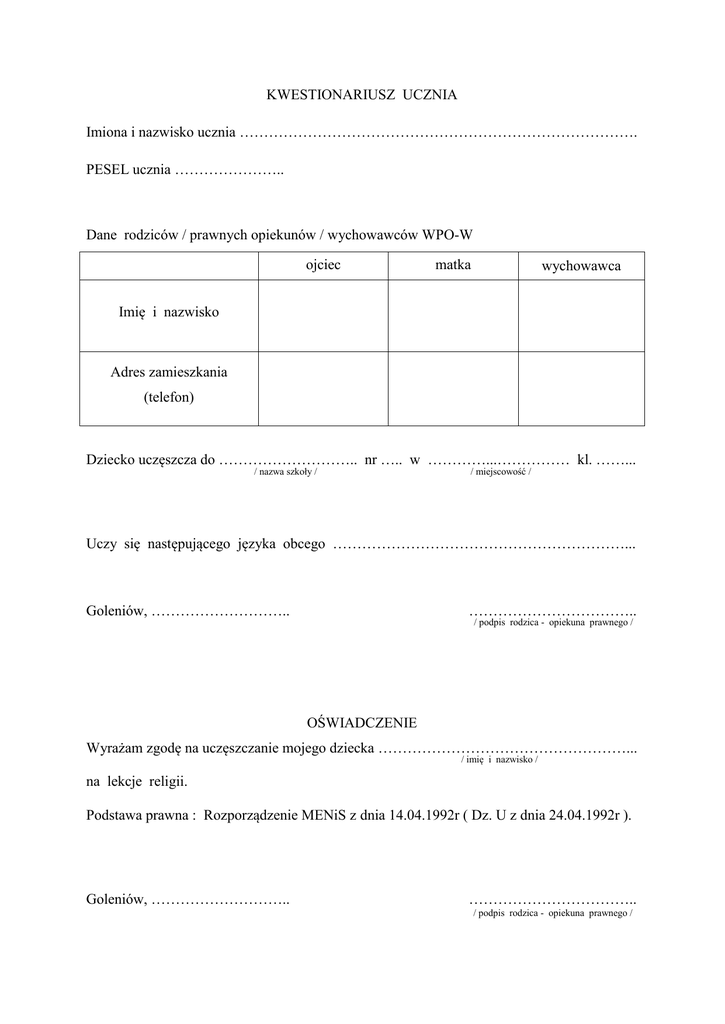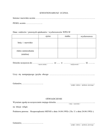KWESTIONARIUSZ UCZNIA Imiona i nazwisko ucznia ………………………………………………………………………. PESEL ucznia ………………….. Dane rodziców / prawnych opiekunów / wychowawców WPO-W ojciec matka wychowawca Imię i nazwisko Adres zamieszkania (telefon) Dziecko uczęszcza do ……………………….. nr ….. w …………...…………… kl. ……... / nazwa szkoły / / miejscowość / Uczy się następującego języka obcego ……………………………………………………... Goleniów, ……………………….. …………………………….. / podpis rodzica - opiekuna prawnego / OŚWIADCZENIE Wyrażam zgodę na uczęszczanie mojego dziecka ……………………………………………... / imię i nazwisko / na lekcje religii. Podstawa prawna : Rozporządzenie MENiS z dnia 14.04.1992r ( Dz. U z dnia 24.04.1992r ). Goleniów, ……………………….. …………………………….. / podpis rodzica - opiekuna prawnego /