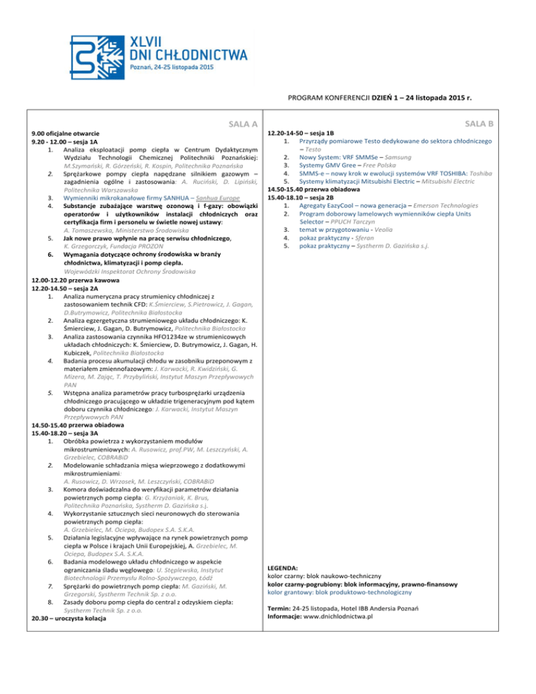 PROGRAM KONFERENCJI DZIEŃ 1 – 24 listopada 2015 r. SALA A SALA B 9.00 oficjalne otwarcie 9.20 ‐ 12.00 – sesja 1A 1. Analiza eksploatacji pomp ciepła w Centrum Dydaktycznym Wydziału Technologii Chemicznej Politechniki Poznańskiej: M.Szymański, R. Górzeński, R. Kospin, Politechnika Poznańska 2. Sprężarkowe pompy ciepła napędzane silnikiem gazowym – zagadnienia ogólne i zastosowania: A. Ruciński, D. Lipiński, Politechnika Warszawska 3. Wymienniki mikrokanałowe firmy SANHUA – Sanhua Europe 4. Substancje zubażające warstwę ozonową i f‐gazy: obowiązki operatorów i użytkowników instalacji chłodniczych oraz certyfikacja firm i personelu w świetle nowej ustawy: A. Tomaszewska, Ministerstwo Środowiska 5. Jak nowe prawo wpłynie na pracę serwisu chłodniczego, K. Grzegorczyk, Fundacja PROZON 6. Wymagania dotyczące ochrony środowiska w branży chłodnictwa, klimatyzacji i pomp ciepła. Wojewódzki Inspektorat Ochrony Środowiska 12.00‐12.20 przerwa kawowa 12.20‐14.50 – sesja 2A 1. Analiza numeryczna pracy strumienicy chłodniczej z zastosowaniem technik CFD: K.Śmierciew, S.Pietrowicz, J. Gagan, D.Butrymowicz, Politechnika Białostocka 2. Analiza egzergetyczna strumieniowego układu chłodniczego: K. Śmierciew, J. Gagan, D. Butrymowicz, Politechnika Białostocka 3. Analiza zastosowania czynnika HFO1234ze w strumienicowych układach chłodniczych: K. Śmierciew, D. Butrymowicz, J. Gagan, H. Kubiczek, Politechnika Białostocka 4. Badania procesu akumulacji chłodu w zasobniku przeponowym z materiałem zmiennofazowym: J. Karwacki, R. Kwidziński, G. Mizera, M. Zając, T. Przybyliński, Instytut Maszyn Przepływowych PAN 5. Wstępna analiza parametrów pracy turbosprężarki urządzenia chłodniczego pracującego w układzie trigeneracyjnym pod kątem doboru czynnika chłodniczego: J. Karwacki, Instytut Maszyn Przepływowych PAN 14.50‐15.40 przerwa obiadowa 15.40‐18.20 – sesja 3A 1. Obróbka powietrza z wykorzystaniem modułów mikrostrumieniowych: A. Rusowicz, prof.PW, M. Leszczyński, A. Grzebielec, COBRABiD 2. Modelowanie schładzania mięsa wieprzowego z dodatkowymi mikrostrumieniami: A. Rusowicz, D. Wrzosek, M. Leszczyński, COBRABiD 3. Komora doświadczalna do weryfikacji parametrów działania powietrznych pomp ciepła: G. Krzyżaniak, K. Brus, Politechnika Poznańska, Systherm D. Gazińska s.j. 4. Wykorzystanie sztucznych sieci neuronowych do sterowania powietrznych pomp ciepła: A. Grzebielec, M. Ociepa, Budopex S.A. S.K.A. 5. Działania legislacyjne wpływające na rynek powietrznych pomp ciepła w Polsce i krajach Unii Europejskiej, A. Grzebielec, M. Ociepa, Budopex S.A. S.K.A. 6. Badania modelowego układu chłodniczego w aspekcie ograniczania śladu węglowego: U. Stęplewska, Instytut Biotechnologii Przemysłu Rolno‐Spożywczego, Łódź 7. Sprężarki do powietrznych pomp ciepła: M. Gaziński, M. Grzegorski, Systherm Technik Sp. z o.o. 8. Zasady doboru pomp ciepła do central z odzyskiem ciepła: Systherm Technik Sp. z o.o. 20.30 – uroczysta kolacja 12.20‐14‐50 – sesja 1B 1. Przyrządy pomiarowe Testo dedykowane do sektora chłodniczego – Testo 2. Nowy System: VRF SMMSe – Samsung 3. Systemy GMV Gree – Free Polska 4. SMMS‐e – nowy krok w ewolucji systemów VRF TOSHIBA: Toshiba 5. Systemy klimatyzacji Mitsubishi Electric – Mitsubishi Electric 14.50‐15.40 przerwa obiadowa 15.40‐18.10 – sesja 2B 1. Agregaty EazyCool – nowa generacja – Emerson Technologies 2. Program doborowy lamelowych wymienników ciepła Units Selector – PPUCH Tarczyn 3. temat w przygotowaniu ‐ Veolia 4. pokaz praktyczny ‐ Sferan 5. pokaz praktyczny – Systherm D. Gazińska s.j. LEGENDA: kolor czarny: blok naukowo‐techniczny kolor czarny‐pogrubiony: blok informacyjny, prawno‐finansowy kolor grantowy: blok produktowo‐technologiczny Termin: 24‐25 listopada, Hotel IBB Andersia Poznań Informacje: www.dnichlodnictwa.pl PROGRAM KONFERENCJI DZIEŃ 2 – 25 listopada 2015 r. SALA A 8.40‐11.40 1. Analiza porównawcza wybranych ziębników w obiegu pompy ciepła / Nowy kierunek studiów "chłodnictwo i klimatyzacja": T. Łokietek, Zachodniopomorski Uniwersytet Technologiczny w Szczecinie, 2. Wybrane problemy oceny projektowej efektywności energetycznej wysokotemperaturowych powietrznych pomp ciepła: T. Bohdal, H. Charun, W. Kuczyński, M. Sikora, Politechnika Koszalińska 3. Dobór czynnika roboczego dla sprężarkowej, wysokotemperaturowej powietrznej pompy ciepła: H. Charun, T. Bohdal, W. Kuczyński, M. Sikora, Politechnika Koszalińska 4. Studium możliwości wykorzystania powietrznych kolektorów słonecznych do współpracy z powietrznymi pompami ciepła: K. Dutkowski, P. Piątkowski, M. Sikora, Politechnika Koszalińska 5. Analiza porównawcza oporów przepływu chłodniczych mieszanin zeotropowych w minikanałach: T. Bohdal, K. Widomska, M. Sikora, Politechnika Koszalińska 6. Model propagacji niestabilności temperaturowych podczas skraplania czynnika chłodniczego r404a w minikanałach rurowych: H. Charun, T.Bohdal, W. Kuczyński, Politechnika Koszalińska 7. Analiza numeryczna zastosowania modułu eżektorowego w instalacjach chłodniczych supermarketów na naturalny czynnik R744, J. Smołka, M.Palacz, Michał Haida, J.Bodys, A.Fic, Z.Buliński, A.Nowak, K.Banasiak, A.Hafner, Politechnika Śląska 11.40‐12.00 przerwa kawowa 12.00‐15.00 8. Wsparcie WFOŚiGW w zakresie OZE i ochrony środowiska. Wojewódzki Fundusz Ochrony Środowiska i Gospodarki Wodnej w Poznaniu 9. Dotacje z ZUS na BHP na rozwój, modyfikację i usprawnienie stanu technicznego maszyn, urządzeń oraz systemów i środków ochronnych. Zakład Ubezpieczeń Społecznych 10. Certyfikacja personelu i firm w zakresie OZE ze szczególnym uwzględnieniem pomp ciepła. Urząd Dozoru Technicznego 11. Odzysk ciepła w systemach VRF FUJITSU – kiedy warto stosować – Klimatherm 12. Duże systemy chłodnicze z wyskotemperaturowym odzyskiem ciepła: Frio