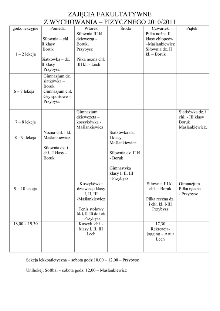 ZAJĘCIA FAKULTATYWNE Z WYCHOWANIA – FIZYCZNEGO 2010/2011 godz. lekcyjne Poniedz. Siłownia – chł. II klasy Boruk Wtorek Siłownia III kl. dziewcząt Boruk, Przybysz Środa 1 – 2 lekcja 6 – 7 lekcja Siatkówka – dz. II klasy Przybysz Gimnazjum dz. siatkówka – Boruk Gimnazjum chł. Gry sportowe – Przybysz Piątek Piłka nożna chł. III kl. - Lech Siatkówka dz. i chł. - III klasy Boruk Maślankiewicz, Gimnazjum dziewczęta – koszykówka Maślankiewicz 7 – 8 lekcja 8 – 9 lekcja Czwartek Piłka nożna II klasy chłopców –Maślankiewicz Siłownia dz. II kl. – Boruk Nożna-chł. I kl. Maślankiewicz Siatkówka dz. I klasy – Maślankiewicz Siłownia dz. i chł. I klasy Boruk Siłownia dz. II kl - Boruk Gimnastyka klasy I, II, III - Przybysz 9 – 10 lekcja Koszykówka dziewcząt klasy I, II, III -Maślankiewicz Tenis stołowy Siłownia III kl. chł. – Boruk Piłka ręczna dz. i chł. kl. I-III Przybysz kl. I, II, III dz. i ch 18,00 – 19,30 - Przybysz Koszyk. chł. klasy I, II, III Lech Sekcja lekkoatletyczna – sobota godz.10,00 – 12,00 – Przybysz Unihokej, Softbal – sobota godz. 12,00 – Maślankiewicz 17,30 Rekreacjajogging – Artur Lech Gimnazjum Piłka ręczna - Przybysz
