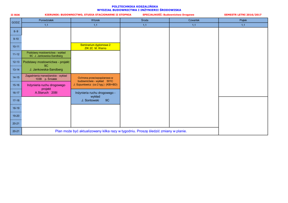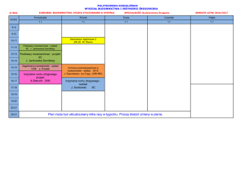POLITECHNIKA KOSZALIŃSKA WYDZIAŁ BUDOWNICTWA I INŻYNIERII ŚRODOWISKA II ROK GODZ. KIERUNEK: BUDOWNICTWO, STUDIA STACJONARNE II STOPNIA SPECJALNOŚĆ: Budownictwo Drogowe Poniedziałek Wtorek Środa Czwartek Piątek 1,1 1,1 1,1 1,1 1,1 8−9 9-10 Seminarium dyplomowe 2 ZIK 2C M. Werno 10-11 11-12 12-13 13-14 14-15 15-16 16-17 17-18 Podstawy mostownictwa - wykład 9C J. Jankowska-Sandberg Podstawy mostownictwa - projekt 9C J. Jankowska-Sandberg Zagadnienia menedżerskie - wykład 103B p. Śmiałek Inżynieria ruchu drogowego projekt A.Staruch 208I Ochrona przeciwpopżarowa w budownictwie - wykład 501C J. Szpuntowicz (co 2 tyg.) (KBI+BD) Inżynieria ruchu drogowego wykład J. Sontowski 9C 18-19 19-20 20-21 20-21 SEMESTR LETNI 2016/2017 Plan może być aktualizowany kilka razy w tygodniu. Proszę śledzić zmiany w planie.