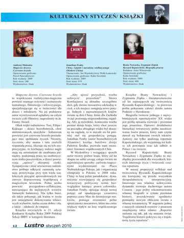 KULTURALNY STYCZEŃ/ KSIĄŻKI Magiczne drzewo. Czerwone krzesło to współczesna realistyczno-magiczna powieść znanego reżysera i scenarzysty teatralnego, filmowego i telewizyjnego, specjalizującego się w twórczości dla dzieci i młodzieży. Na jej podstawie autor wyreżyserował oglądany na całym świecie cykl filmowy, nagrodzony m.in. Emmy Award. Obok trójki rodzeństwa: Tosi, Filipa i Kukiego - dzieci bezrobotnych, choć utalentowanych, muzyków - bohaterem powieści jest czerwone krzesło posiadające moc spełniania życzeń. Niestety, życzenie, aby mama i tata znaleźli wspaniałą pracę, okazuje się na tyle nieprecyzyjne, że kochający rodzice nagle stają się automatami do zarabiania pieniędzy, podejmują pracę na snobistycznym statku pasażerskim, a dzieci powierzają „opiece” okropnej ciotki. Sympatyczne i dość urwisowate rodzeństwo próbuje odkręcić zaistniałą sytuację, przeżywając przy tym wiele szaleńczych przygód spowodowanych nie zawsze dopracowaną współpracą z magicznym krzesłem. Pełna uroku powieść przygodowo-refleksyjna, nawiązująca do najlepszych wzorów fantastyki baśniowej. Nie tylko bawi, ale także pokazuje, jak ważna w życiu jest umiejętność dokonywania właściwych wyborów, trafna ocena dobra i zła, a także - zdolność do empatii. Książka zwyciężyła w 21. edycji Konkursu Książka Roku 2009 Polskiej Sekcji IBBY w kategorii literatura. 12 Lustro „Aby ujrzeć przyszłość, trzeba uchwycić przeszłość”. Słowa Konfucjusza są aktualne szczególnie dziś, gdy dawne mocarstwa odchodzą w cień, a ich miejsce zastępują nowe potęgi. Jednym z najważniejszych krajów świata są dziś Chiny, które dla Zachodu wciąż pozostają nieprzeniknioną zagadką. Aby ją rozwikłać, koniecznie trzeba poznać dzieje kraju, który choć jeszcze na początku ubiegłego wieku był skazany na zagładę, to w niecałe sto lat później stał się gospodarczą potęgą. Jonathan Fenby (autor bestsellerowych Aliantów) kreśląc burzliwe dzieje Państwa Środka, pozwala nam zrozumieć fenomen współczesnych Chin. W błyskotliwy i wciągający sposób autor tworzy portret kraju, który od lat skupia na sobie uwagę całego świata na najróżniejsze sposoby: zarówno tragicznymi wydarzeniami na Placu Niebiańskiego Pokoju, jak i organizacją olimpiady w Pekinie w 2008 roku. Chiny to kraj pełen paradoksów: dynamicznie rozwijającej się gospodarce towarzyszy polityczny reżim bezwzględnie łamiący prawa człowieka. Jonathan Fenby, opisując dzieje nowej potęgi od upadającego cesarstwa poprzez czasy Mao do dzisiejszego rozkwitu, pomaga zrozumieć pełne sprzeczności mocarstwo, które ma coraz większy wpływ na losy współczesnego świata. styczeń 2010 Beata Nowacka, Zygmunt Ziątek Ryszard Kapuściński. Biografia pisarza Redaktor: Artur Wiśniewski Opracowanie graficzne: Kuba Sowiński Rok wydania: 2008 Ilość stron: 400 Wydawnictwo: Znak Książka Beaty Nowackiej i Zygmunta Ziątka - literaturoznawców od lat zajmujących się twórczością Ryszarda Kapuścińskiego - to pierwsza próba pokazania całości dzieła autora Podróży z Herodotem. Biografia twórcza jednego z najwybitniejszych reportażystów XX wieku jest próbą opisania rozwoju i przemian jego pisarstwa. Opisowi działalności literackiej towarzyszy próba naszkicowania losów pisarza, który sam często stawał się bohaterem swoich tekstów. Autorzy nie tylko analizują reportaże Kapuścińskiego, ale wyjaśniają też kulisy ich powstania oraz ich odbiór w Polsce i na świecie. Ryszard Kapuściński Beaty Nowackiej i Zygmunta Ziątka to niezbędny przewodnik dla wszystkich, których interesuje życie i twórczość cesarza reportażu. W naszej propozycji refleksji nad twórczością Ryszarda Kapuścińskiego nie kierujemy się przede wszystkim skrupulatnością interpretacyjną. Interesuje nas właśnie uchwycenie dynamiki rozwoju duchowego autora Cesarza - jego próby rekonstruowania własnej biografii w rytmie przemian historii, poszukiwanie zgodności pomiędzy nowym obliczem świata a własną tożsamością. W nagraniu jednej z naszych ostatnich rozmów z pisarzem znajdujemy takie zdanie: „Reporter zmienia się tak, jak się zmienia świat. Trajektoria historii pokrywa się z trajektorią życia reportera”. Zdjęcia: materiały prasowe Jonathan Fenby Chiny. Upadek i narodziny wielkiej potęgi (Modern China) Tłumaczenie: Jan Wąsiński,Jerzy Wołk-Łaniewski Opracowanie graficzne: Kuba Sowiński Rok wydania: 2009 Ilość stron: 979 Wydawnictwo: Znak Andrzej Maleszka Magiczne drzewo. Czerwone krzesło Opracowanie graficzne: Paweł Panczakiewicz Rok wydania: 2009 Ilość stron: 240 Wydawnictwo: Znak T KULTURALNY STYCZEŃ/ WYWIAD o było 19 lipca zeszłego roku, program był na żywo, wcześniej chwilę rozmawiałam z moim gościem i dopadło mnie zdziwieniem, które być zdziwieniem już nie powinno, bo właściwie dotyczy wszystkich ludzi wielkiego formatu. Chodziło mianowicie o to, że Ryszard Kapuściński okazał się osobą skromną, bezpośrednią i skupiającą całą swoją uwagę na rozmówcy. Myślę, że to było jednym z powodów jego sukcesu - że umiał słuchać i nie bagatelizował żadnych pytań. Wyobrażam sobie, że w ten sam sposób rozmawiał z ważnymi personami i na przykład z żebrakiem gdzieś w Afryce. Nasza rozmowa dotyczył książki, która się pojawiła, którą teraz trzymam w ręku, książki pod tytułem "Ten Inny". To jest zbiór wykładów, które Ryszard Kapuściński wygłaszał w Wiedniu, Grazu i Krakowie w latach 1990-2004, a wszystkie dotyczyły sprawy Innego, inności. Magda Mikołajczak: A co znaczyło dla Ryszarda Kapuścińskiego? Ryszard Kapuściński: Można to pojęcie bardzo różnie interpretować, można mówić o tym, że Inny to jest po prostu “nie ja”, każdy “nie ja” to jest ktoś inny, więc to jest takie bardzo wąskie pojęcie personalne, i można to pojęcie