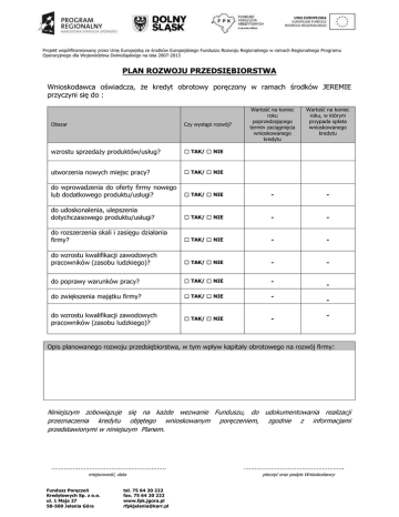 Projekt współfinansowany przez Unię Europejską ze środków Europejskiego Funduszu Rozwoju Regionalnego w ramach Regionalnego Programu Operacyjnego dla Województwa Dolnośląskiego na lata 2007-2013 PLAN ROZWOJU PRZEDSIĘBIORSTWA Wnioskodawca oświadcza, że kredyt obrotowy poręczony w ramach środków JEREMIE przyczyni się do : Wartość na koniec roku poprzedzającego termin zaciągnięcia wnioskowanego kredytu Wartość na koniec roku, w którym przypada spłata wnioskowanego kredytu Obszar Czy wystąpi rozwój? wzrostu sprzedaży produktów/usług? ☐ TAK/ ☐ NIE utworzenia nowych miejsc pracy? ☐ TAK/ ☐ NIE do wprowadzenia do oferty firmy nowego lub dodatkowego produktu/usługi? ☐ TAK/ ☐ NIE - - do udoskonalenia, ulepszenia dotychczasowego produktu/usługi? ☐ TAK/ ☐ NIE - - do rozszerzenia skali i zasięgu działania firmy? ☐ TAK/ ☐ NIE - - do wzrostu kwalifikacji zawodowych pracowników (zasobu ludzkiego)? ☐ TAK/ ☐ NIE - - do poprawy warunków pracy? ☐ TAK/ ☐ NIE - do zwiększenia majątku firmy? ☐ TAK/ ☐ NIE - do wzrostu kwalifikacji zawodowych pracowników (zasobu ludzkiego)? ☐ TAK/ ☐ NIE - - Opis planowanego rozwoju przedsiębiorstwa, w tym wpływ kapitały obrotowego na rozwój firmy: Niniejszym zobowiązuje się na każde wezwanie Funduszu, do udokumentowania realizacji przeznaczenia kredytu objętego wnioskowanym poręczeniem, zgodnie z informacjami przedstawionymi w niniejszym Planem. ……………………………………………………… miejscowość, data Fundusz Poręczeń Kredytowych Sp. z o.o. ul. 1 Maja 27 58-500 Jelenia Góra tel. 75 64 20 222 fax. 75 64 20 222 www.fpk.jgora.pl [email protected] ………………………………………………. pieczęć oraz podpis Wnioskodawcy