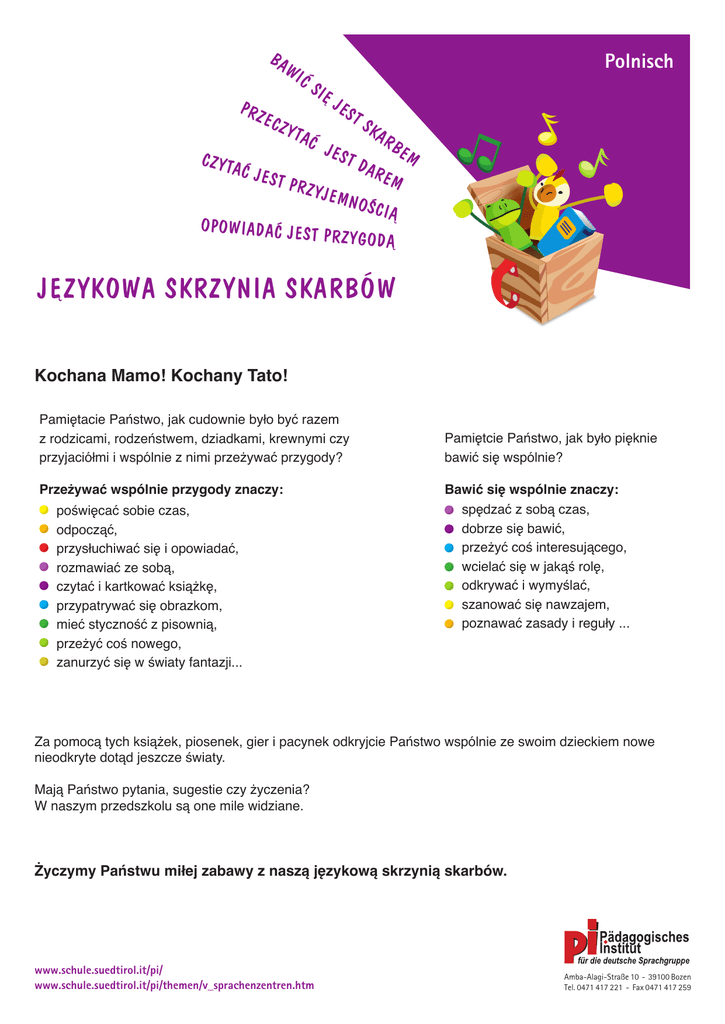 ba Polnisch wi Cs iE prz je st sk yta ar C je be m st d czyta are C jes m t prz yjem noSc iA opowiadaC jes t przygodA ecz JEzykowa skrzynia skarbów Kochana Mamo! Kochany Tato! Pamiętacie Państwo, jak cudownie było być razem z rodzicami, rodzeństwem, dziadkami, krewnymi czy przyjaciółmi i wspólnie z nimi przeżywać przygody? Przeżywać wspólnie przygody znaczy: poświęcać sobie czas, odpocząć, przysłuchiwać się i opowiadać, rozmawiać ze sobą, czytać i kartkować książkę, przypatrywać się obrazkom, mieć styczność z pisownią, przeżyć coś nowego, zanurzyć się w światy fantazji... Pamiętcie Państwo, jak było pięknie bawić się wspólnie? Bawić się wspólnie znaczy: spędzać z sobą czas, dobrze się bawić, przeżyć coś interesującego, wcielać się w jakąś rolę, odkrywać i wymyślać, szanować się nawzajem, poznawać zasady i reguły ... Za pomocą tych książek, piosenek, gier i pacynek odkryjcie Państwo wspólnie ze swoim dzieckiem nowe nieodkryte dotąd jeszcze światy. Mają Państwo pytania, sugestie czy życzenia? W naszym przedszkolu są one mile widziane. Życzymy Państwu miłej zabawy z naszą językową skrzynią skarbów. www.schule.suedtirol.it/pi/ www.schule.suedtirol.it/pi/themen/v_sprachenzentren.htm Amba-Alagi-Straße 10 - 39100 Bozen Tel. 0471 417 221 - Fax 0471 417 259 Sp Deutsch iel en Les en Vorl esen in - ei - ein ErzÄhlen - ein -e n Ge Sc ha tz Gesc nus s henk Abenteuer Schatzkiste der Sprachen Liebe Mutter, lieber Vater, erinnern Sie sich, wie schön es war, mit den Eltern, Geschwistern, Großeltern, Verwandten oder Freunden zusammen zu sein und gemeinsam eine Geschichte zu erleben? Erinnern Sie sich, wie schön es war, zusammen zu spielen? Gemeinsam Geschichten erleben heißt: Zusammen spielen heißt: sich Zeit schenken zur Ruhe kommen zuhören und erzählen miteinander reden in einem Buch blättern und lesen Bilder betrachten, mit Schrift in Kontakt kommen Neues erfahren in fantastische Welten eintauchen … in Beziehung sein Spaß haben Spannendes erleben in eine Rolle schlüpfen entdecken und erfinden einander respektieren Regeln kennen lernen … Entdecken Sie mit diesen Büchern, Liedern, Spielen und Handpuppen gemeinsam mit Ihrem Kind neue Welten. Haben Sie Fragen, Anregungen, Wünsche? Diese sind bei uns im Kindergarten willkommen. Wir wünschen Ihnen viel Freude mit der Schatzkiste der Sprachen. www.schule.suedtirol.it/pi/ www.schule.suedtirol.it/pi/themen/v_sprachenzentren.htm Amba-Alagi-Straße 10 - 39100 Bozen Tel. 0471 417 221 - Fax 0471 417 259