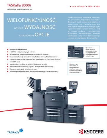 TASKalfa 8000i druk kopia skan faks URZĄDZENIE WIELOFUNKCYJNE A3 WIELOfunKCYJNOŚĆ, WYSOKA WYDAJNOŚĆ ROZBUDOWANE OPCJE Dzięki połączeniu szybkiego skanowania, drukowania, kopiowania oraz rozbudowanych opcji podawania papieru i wykańczania prac, TASKalfa 8000i jest potężnym narzędziem wspomagającym wysokonakładowe prace biurowe. Jest to wysoce wydajne i produktywne urządzenie wielofunkcyjne idealnie spełniające rolę departamentowego centrum przetwarzania dokumentów. Opcjonalne kasety wysokiej pojemności A3 lub A4 przydatne do drukowania wysokonakładowego Do 80 stron A4 na minutę 2 GB RAM i duży twardy dysk 320 GB W standardzie szybkie drukowanie i skanowanie sieciowe Rozszerzone funkcje faksu: dwie linie, funkcje siciowe, faks internetowy Zaawansowane funkcje zabezpieczeń: Data Security Kit, Copy Guard Kit, czytnik USB IC Card Szeroki zakres mediów: do 300 g/m2, drukowanie banerów Standardowo 4.150 arkuszy papieru, maksymalnie 7.650 arkuszy Zaawansowane opcje wykańczania prac Technologia długowiecznych podzespołów redukująca koszty eksploatacji Kolorowy, szeroki, i łatwy w obsłudze ekran dotykowy zapewnia komfortową obsługę wszystkich funkcji. TASKalfa 8000i URZĄDZENIE WIELODUNKCYJNEa3 TASKalfa 8000i jest połączeniem wydajności i niezawodności z ekstremalną żywotnością podzespołów co gwarantuje efektywne i niezawodne działanie. Aby sprostać wysokim wymaganiom współczesnego biura. TASKalfa 8000i oferuje elastyczność i efektywą wydajność, zapewniając przy tym minimalny wpływ na środowisko naturalne. INFORMACJE OGÓLNE Technologia KYOCERA Laser Mono, platforma HyPASTM Prędkość pracy (w stronach na minutę) do 80/40 stron A4/A3 na minutę Rozdzielczość 600 x 600 dpi, technologia Multi-bit 9.600 dpi x 600 dpi Czcinoki/kody: 93 czcionki konturowe (PCL6), 8 czcionek (Windows Vista), 136 czcionek PostScript KPDL 3, 45 typów 1-wymiarowych plus 2-wymiarowy kod kreskowy (PDF-417) OPCJE Funkcje: szybka kopia, drukuj i zachowaj pracę, wydruk prywatny, zarządzanie pracami Internet Fax Kit (A) KOPIOWANIE Maks. : A3 Czas nagrzewania od włączenia zasilania ok. 30 sekund lub mniej Kopiowanie ciągłe: 1–999 Czas pierwszej strony ok. 4,7 sek. lub mniej Zoom nastawny: 5R/5E Procesor IBM PowerPC 750CL/800 MHz Pamięć 2 GB RAM + 320 GB HDD Standardowe interfejsy USB 2.0 (Hi-Speed), USB Host 2.0, Fast Ethernet 10Base- T/ 100BaseTX/1000BaseT, gniazdo opcjonalnego serwera druku, gnizado pamięci CompactFlash®, gniazdo opcjonalnego systemu faksowego Wymiary (szer x głęb x wys) 685 x 723 x 1.053 mm (bez panela operatora) 1.039 x 723 x 1.347 mm (z panelem operatora) Waga: ok. 152 kg Zasilanie: AC 220 V ~ 240 V, 50/60 Hz Zużycie energii drukowanie: 1.410 W tryb gotowości: 300 W tryb uśpienia: 20 W Chałas (ISO 7779/ISO 9296) drukowanie: 75 dB(A) tryb gotowosci: 58 dB(A) Standardy bezpieczeństwa: GS, TÜV, CE To urządzenie jest produkowane zgodnie z normą jakości ISO 9001, normą ochrony środowiska ISO 14001 oraz zgodnie z dyrektywą RoHs. OBSŁUGA PAPIERU Wszystkie podane pojemności dotyczą papieru o grubości maks. 0.11 mm. Zaleca się stosowanie papieru polecanego przez KYOCERA w normalnych warunkach otoczenia. Pojemność wejściowa 150-kartkowa taca wielofunkcyjna, 60–300 g/m2, A6R–304,8 x 457,2 mm, baner maks. 304,8 x 1.219,2 mm; bank papieru 2 x 1.500 arkuszy, 60-256 g/m2, A4, B5; kasety uniwersalne 2 x 500 arkuszy, 60–256 g/m2, A5R– 304,8 x 457,2 mm Maks. pojemność wejściowa: 7.650 arkuszy A4 Podajnik dokumentów (dwustronny-jednoprzebiegowy) 270 arkuszy; 35–220 g/m2 (tryb 1-stronny), 50–220 g/m2 (tryb 2-stronny); A5R–A3 Dupleks: w standardzie, obsługa papieru A5R–304,8 x 457,2 mm, 60–256 g/m2 Pojemność wyjściowa Maks. 4300 arkuszy (z finiszerem DF-790) DRUKOWANIE Język kontrolera: PRESCRIBE IIc Zakres zoom: 25–400 % co 1 % Funkcje: Skanuj-raz-drukuj-wielokrotnie, sorter elektroniczny, funkcja 2w1 i 4w1, powtarzanie obrazu, numeracja stron, tryb okładek, kopiowanie broszur, tryb pilnej kopii Tryby ekspozycji: Automatyczny lub ręczny: 7 lub 13 stopni Typ oryginału: Tekst + foto, tekst, foto, mapa SKANOWANIE Funkcje: Skan-do-email, Skan-do-FTP, Skan-do-SMB, Skan-doUSB Host, Skan-to-HDD, sieciowy TWAIN, skanowanie WSD Prędkość skanowania (A4, 300 dpi, tryb dwustronny) mono: 200 obrazów na minutę, kolor: 150 obrazów na minutę Rozdzielczość: 600 dpi, 400 dpi, 300 dpi, 200 dpi, 200 x 100 dpi, 200 x 400 dpi, (256 odcieni) Maks. obszar skanowania: A3 Rozpoznawanie oryginału: Tekst, foto, tekst + foto, OCR Protokół sieciowy: TCP/IP Typy plików: PDF (szyfrowany i kompresowany, PDF/A), JPEG, TIFF, XPS FAKS (opcja) Kompatybilność: ITU-T Super G3 Prędkość modemu: Maks. 33.6 kbps Prędkość transmisji: Maks. 3 sekundy (JBIG) Gęstość skanowania Tryb normal: 8 pkt/mm x 3,85 linii/mm Tryb fine: 8 pkt/mm x 7,7 linii/mm Tryb superfine: 8 pkt/mm x 15,4 linii/mm Tryb ultrafine: 16 pkt/mm x 15,4 linii/mm, półtony Fax System (V) Obsługa papieru PF-730 Ppdajnik papieru 2 x 500 arkuszy, 60–256 g/m2, A5R–304.8 x 457.2 mm, folio PF-740 Podajnik papieru 2 x 1.500 arkuszy, 60–256 g/m2, A4, B5, letter PF-770 A4 Podajnik papieru (boczny) 3.000 arkuszy, 60–300 g/m2, A4, B5 PF-780 Kaseta wielofunkcyjna 500 arkuszy, 60–256 g/m2, A5R–304,8 x 457,2 mm DF-790 Finiszer dokumentów Taca główna: maks. 4.000 arkuszy A4 (3.000 z BF-730); maks. 60–300 g/m2; max. B5R–304,8 x 457,2 mm Taca pomocnicza: 200 arkuszy A4; 60–300 g/m2; A6R–A3 Taca pomocnicza (górna): 100 arkuszy; 60–300 g/m2; A6R–A4 Zszywacz na 65 arkuszy A4 lub 30 arkuszy A3 - 3 pozycyjny, B5–304,8 x 457,2 mm PH-7C/PH-7D Dziurkacz do DF-790 2-otwory/4-otwory/typ szwedzki, 60–300 g/m2, A5R–A3 MT-730 Mailbox do DF-790 7 półek x 100 arkuszy A4, 50 arkuszy A3/B4, 60–163 g/m2 BF-730 Broszurownica do DF-790 Maks. 64 strony (16 arkuszy) składacz i zszywacz broszur 60–256 g/m2, A3, B4, A4R, okładki 60–220 g/m2 (tryb jedn