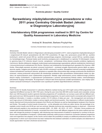 diagnostyka laboratoryjna Journal of Laboratory Diagnostics 2012 • Volume 48 • Number 2 • 127-152 Kontrola jakości • Quality Control Sprawdziany międzylaboratoryjne prowadzone w roku 2011 przez Centralny Ośrodek Badań Jakości w Diagnostyce Laboratoryjnej Interlaboratory EQA programmes realised in 2011 by Centre for Quality Assessment in Laboratory Medicine Andrzej M. Brzeziński, Barbara Przybył-Hac Centralny Ośrodek Badań Jakości w Diagnostyce Laboratoryjnej, Łódź Streszczenie Centralny Ośrodek Badań Jakości w Diagnostyce Laboratoryjnej prowadził w 2011r. osiem programów międzylaboratoryjnych i zorganizował 28 różnych sprawdzianów dla 250-1700 uczestników. W ciągu roku opracowano ponad 800 tys. wyników kontrolnych, wśród nich ponad 250 tys. wyników powszechnego programu chemicznego i ponad 300 tys. wyników programu hematologicznego. Ponieważ każdy wynik kontrolny powiązany jest z dodatkowymi co najmniej 10 informacjami, tworzy to ogromną bazę 8-10 milionów danych rocznie, zarządzanie i archiwizacja której stwarza poważne problemy logistyczne i techniczne. Bardzo efektywnie następuje modernizacja wykorzystywanego wyposażenia, głównie analizatorów chemicznych i immunochemicznych analizatorami firm Roche i Siemens oraz analizatorów hematologicznych aparatami firm Sysmex i ABX Horiba. Równolegle poprawia się jakość oznaczeń kontrolnych – ponieważ przyjęte dopuszczalne granice błędu są rygorystycznie wąskie, osiągana jest poprawność tylko 92-95% ocenianych wyników. Niewątpliwe trudności powoduje występująca czasem bimodalność ocenianych zbiorów, spotykana w wypadku kilku odczynników tego samego producenta dla określonych oznaczeń, zmianą producenta odczynników dla określonego analizatora albo wprowadzane udoskonalenia metod czy aparatury nie wykorzystywane przez użytkowników programów. Niestety uległ zahamowaniu proces elektronicznego przekazu danych między uczestnikami, a organizatorami sprawdzianów z powodu wprowadzonej blokady etatów, uniemożliwiającej zatrudnienie drugiego informatyka. W programach w których taka forma łączności została wprowadzona, czas między wykonaniem oznaczeń kontrolnych a otrzymaniem ocen uzyskanych wyników uległ kilkukrotnemu skróceniu. Summary Polish Centre for Quality Assessment in Laboratory Medicine realised during year 2012 eight various EQA programmes and organised 28 different surveys for 250-1700 users. During the year more than 800 000 control results were evaluated, among them over 250 thousands results in general chemistry programme (27 constituents, our surveys a year with two different samples each) and over 300 thousands for basic haematological programme. As each control result is connected with at least 8-10 additional information, it creates a countless number of 8-10 millions of datas per year – the management and archiving of such huge amount of information creates a serious logistic and technical question. Very impressive is efficient modernisation, mainly chemical and immunochemical analysers from Roche and Siemens as well as haematological analysers from Sysmex and Horiba. The quality of control results increase too – as the allowable error limits are rather narrow, the percentage of acceptable control results only 92-95 per cent are archived. Besides technical also essential progress is observed – N-terminal atrial natriuretic peptide is very spectacular example (2008 – 32, 2009 – 60, 2010 – 97, 2011 – 109 labs). Some problems are created with bimodal distribution of results, connected from time to time with different reagents for the same method and analyser, with change the producer of reagents, with introducing new improvement of method or equipment or contrary to the producers rules of exploitation of analysers. Unfortunately extremely useful process of electronic connection between programme users and organisers has stopped, as the Centre cannot obtain the possibility to employ an additional professional worker. For programmes in which such improvement has been realised the time between estimation of control samples and obtainment of results appreciation has been shortened several times. 127 Sprawdziany międzylaboratoryjne prowadzone w roku 2011 przez Centralny Ośrodek Badań Jakości w Diagnostyce ... Słowa kluczowe:sprawdziany międzylaboratoryjne, ocena wyników kontrolnych, rozkład wyników kontrolnych, elektroniczny przekaz danych Key words:interlaboratory surveys, evaluation of control results, distribution of control results, electronic data transfer 128