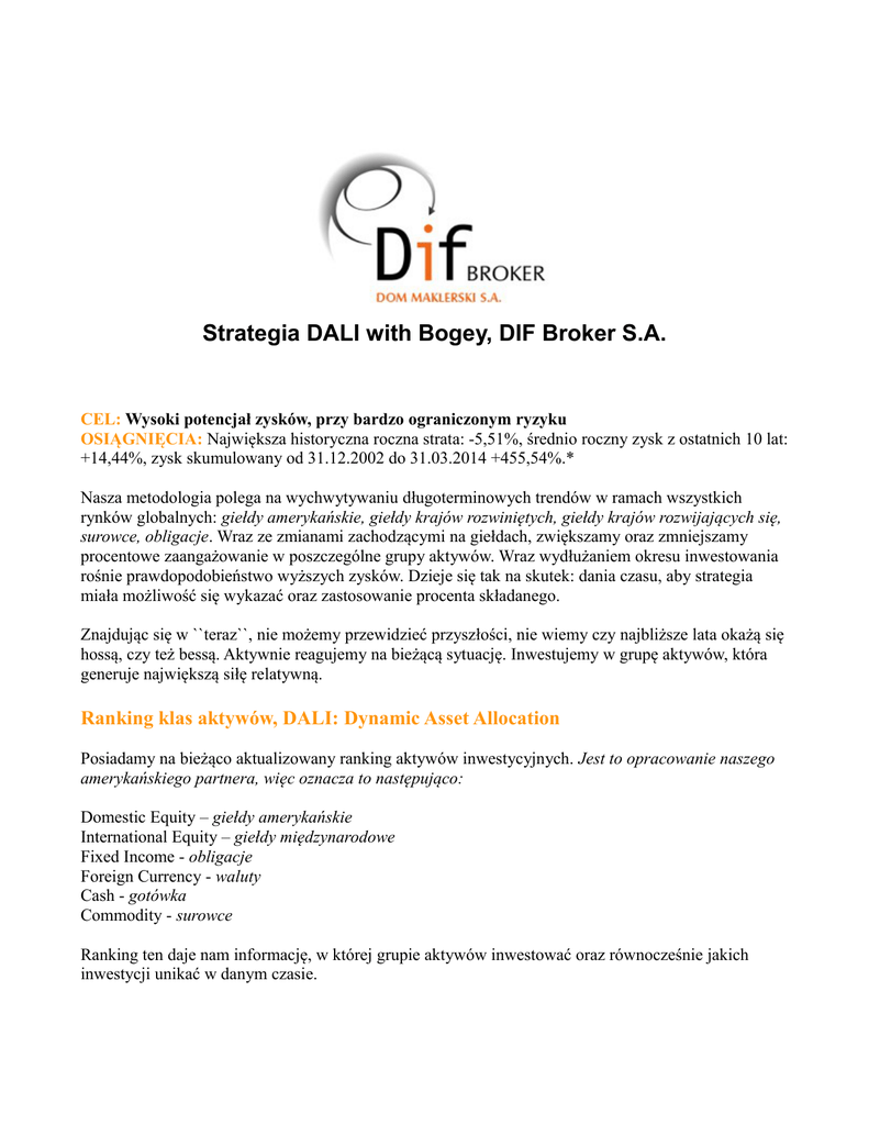 Strategia ta jest ostrożniejszą wersją strategii DALI Asset Allocation. Strategia także inwestuje po
