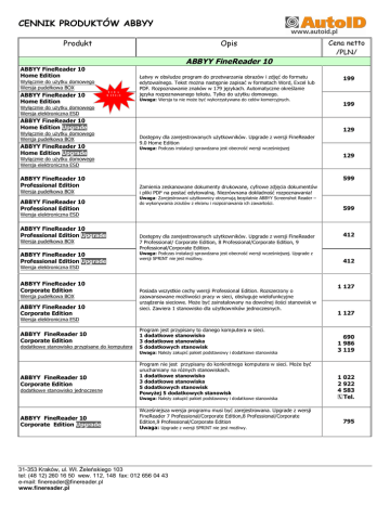 CENNIK PRODUKTÓW ABBYY Produkt Opis Cena netto /PLN/ ABBYY FineReader 10 ABBYY FineReader 10 Home Edition Wy cznie do u ytku domowego Wersja pude kowa BOX ABBYY FineReader 10 Home Edition NOWA WERSJA atwy w obs udze program do przetwarzania obrazów i zdj do formatu edytowalnego. Tekst mo na nast pnie zapisa w formatach Word, Excel lub PDF. Rozpoznawanie znaków w 179 j zykach. Automatyczne okre lanie zyka rozpoznawanego tekstu. Tylko do u ytku domowego. Uwaga: Wersja ta nie mo e by wykorzystywana do celów komercyjnych. Wy cznie do u ytku domowego Wersja elektroniczna ESD ABBYY FineReader 10 Home Edition Upgrade Wy cznie do u ytku domowego Wersja pude kowa BOX ABBYY FineReader 10 Home Edition Upgrade Wersja pude kowa BOX ABBYY FineReader 10 Professional Edition 199 129 Dost pny dla zarejestrowanych u ytkowników. Upgrade z wersji FineReader 9.0 Home Edition Uwaga: Podczas instalacji sprawdzana jest obecno wersji wcze niejszej 129 Wy cznie do u ytku domowego Wersja elektroniczna ESD ABBYY FineReader 10 Professional Edition 199 599 Zamienia zeskanowane dokumenty drukowane, cyfrowe zdj cia dokumentów i pliki PDF na posta edytowaln . Niezrównana dok adno rozpoznawania! Uwaga: Zarejestrowani u ytkownicy otrzymuj bezp atnie ABBYY Screenshot Reader – do wykonywania zrzutów z ekranu i rozpoznawania ich zawarto ci. 599 Wersja elektroniczna ESD ABBYY FineReader 10 Professional Edition Upgrade Wersja pude kowa BOX Dost pny dla zarejestrowanych u ytkowników. Upgrade z wersji FineReader 7 Professional/ Corporate Edition, 8 Professional/Corporate Edition, 9 Professional/Corporate Edition. ABBYY FineReader 10 Professional Edition Upgrade Uwaga: Podczas instalacji sprawdzana jest obecno wersji SPRINT nie jest mo liwy. 412 wersji wcze niejszej. Upgrade z 412 Wersja elektroniczna ESD ABBYY FineReader 10 Corporate Edition Wersja pude kowa BOX ABBYY FineReader 10 Corporate Edition Posiada wszystkie cechy wersji Professional Edition. Rozszerzony o zaawansowane mo liwo ci pracy w sieci, obs uguje wielofunkcyjne urz dzenia sieciowe. Mo e by zainstalowany na dowolnej ilo ci stanowisk w sieci. Zawiera 1 stanowisko dla u ytkowników jednoczesnych. 1 127 1 127 Wersja elektroniczna ESD ABBYY FineReader 10 Corporate Edition dodatkowe stanowisko przypisane do komputera Program jest przypisany to danego komputera w sieci. 1 dodatkowe stanowisko 3 dodatkowe stanowiska 5 dodatkowych stanowisk Uwaga: Nale y zakupi pakiet podstawowy i dodatkowe stanowiska ABBYY FineReader 10 Corporate Edition dodatkowe stanowisko jednoczesne Program nie jest przypisany do konkretnego komputera w sieci. Mo e by uruchamiany na ró nych stanowiskach. 1 dodatkowe stanowisko 3 dodatkowe stanowiska 5 dodatkowych stanowisk Powy ej 5 dodatkowych stanowisk Uwaga: Nale y zakupi pakiet podstawowy i dodatkowe stanowiska ABBYY FineReader 10 Corporate Edition Upgrade Wcze niejsza wersja programu musi by zarejestrowana. Upgrade z wersji FineReader 7 Professional/Corporate Edition,8 Professional/Corporate Edition,9 Professional/Corporate Edition Uwaga: Upgrade z wersji SPRINT nie jest mo liwy. 31-353 Kraków, ul. W . ele skiego 103 tel: (48 12) 260 16 50 wew. 112, 148 fax: 012 656 04 43 e-mail: [email protected] www.finereader.pl 690 1 986 3 119 1 022 2 922 4 583 Tel. 795 CENNIK PRODUKTÓW ABBYY ABBYY FineReader 10 Corporate Edition Upgrade dodatkowe stanowisko jednoczesne ABBYY FineReader 10 Corporate Edition Upgrade dodatkowe stanowisko przypisane do komputera Program nie jest przypisany do konkretnego komputera w sieci. Mo e by uruchamiany na ró nych stanowiskach. dodatkowe stanowisko Upgrade* 1-5 dodatkowych stanowisk Upgrade Powy ej 5 dodatkowych stanowisk Upgrade Uwaga: Nale y zakupi pakiet podstawowy i dodatkowe stanowiska. Program nie jest przypisany do konkretnego komputera w sieci. Mo e by uruchamiany na ró nych stanowiskach. dodatkowe stanowisko Upgrade* 1-5 dodatkowych stanowisk Upgrade Powy ej 5 dodatkowych stanowisk Upgrade 605 Tel. 455 Tel. Uwaga: Nale y zakupi pakiet podstawowy i dodatkowe stanowiska. ABBYY FineReader Express Edition for Mac ABBYY FineReader Express Edition for Mac Wersja elektroniczna ESD ABBYY FineReader Express - Edition for Mac dodatk. stanowisko przypisane do komputera Wersja elektroniczna ESD Zamienia zeskanowane dokumenty drukowane, cyfrowe zdj cia dokumentów i pliki PDF na posta edytowaln 290 265 Dodatkowe stanowisko przypisane do komputera ABBYY FineReader XIX ABBYY FineReader XIX Aplikacja ABBYY FineReader do rozpoznawania fraktur oraz pisma gotyckiego z okresu 1800 -1938. Przetworzenie 2 500 stron Przetworzenie 10 000 stron Przetworzenie 25 000 stron 1 646 4 367 7 195 ABBYY PDF Transformer 3.0 290 ABBYY PDF Transformer 3.0 Pro Wersja pude kowa BOX Zamienia pliki PDF na posta DOC, RTF,TXT, XLS, HTML, PDF oraz tworzy pliki PDF bezpo rednio z aplikacji pakietu Office 290 ABBYY PDF Transformer 3.0 Pro Wersja elektroniczna ESD ABBYY PDF Transformer 3.0 Pro dodatkowe stanowisko Program przypisany do danego komputera. 3 dodatkowe stanowiska 5 dodatkowych stanowisk Powy ej 10 dodatkowych stanowisk Uwaga: Nale y zakupi pakiet podstawowy i dodatkowe stanowiska ABBYY PDF Transformer 3.0 Pro Upgrade - Wersja pude kowa BOX 205 Upgrade z wersji ABBYY PDF Transformer 1.0 ABBYY PDF Transformer 2.0 205 ABBYY PDF Transformer 3.0 Pro Upgrade - Wersja elektroniczna ESD ABBYY PDF Transformer 3.0 Pro Upgrade dodatkowe stanowiska 815 1 275 Tel. Program przypisany do danego komputera. 3 dodatkowe stanowiska Upgrade 5 dodatkowych stanowisk Upgrade Powy ej 10 dodatkowych stanowisk Upgrade Uwaga: Nale y zakupi pakiet podstawowy i dodatkowe stanowiska. 31-353 Kraków, ul. W . ele skiego 103 tel: (48 12) 260 16 50 wew. 112, 148 fax: 012 656 04 43 e-mail: [email protected] www.finereader.pl 590 940 Tel. CENNIK PRODUKTÓW ABBYY ABBYY FineReader dla edukacji ABBYY FineReader 10 Professional Edition edu 419 ABBYY FineReader 10 Professional Edition Upgrade edu ABBYY FineReader 10 Corporate Edition edu ABBYY FineReader 10 Corporate Ed