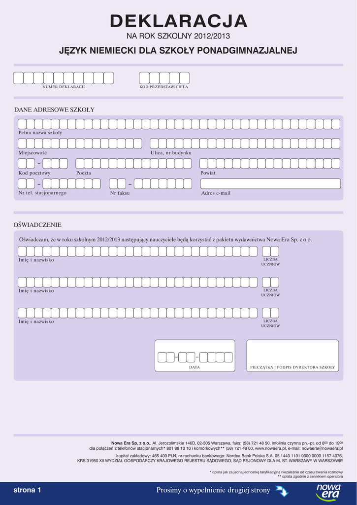 DEKLARACJA NA ROK SZKOLNY 2012/2013 JĘZYK NIEMIECKI DLA SZKOŁY PONADGIMNAZJALNEJ NUMER DEKLARACJI KOD PRZEDSTAWICIELA DANE ADRESOWE SZKOŁY Pełna nazwa szkoły Miejscowość Kod pocztowy Nr tel. stacjonarnego Ulica, nr budynku Poczta Powiat Adres e-mail Nr faksu OŚWIADCZENIE Oświadczam, że w roku szkolnym 2012/2013 następujący nauczyciele będą korzystać z pakietu wydawnictwa Nowa Era Sp. z o.o. Imię i nazwisko LICZBA UCZNIÓW Imię i nazwisko LICZBA UCZNIÓW Imię i nazwisko LICZBA UCZNIÓW DATA PIECZĄTKA I PODPIS DYREKTORA SZKOŁY Nowa Era Sp. z o.o., Al. Jerozolimskie 146D, 02-305 Warszawa, faks: (58) 721 48 50, infolinia czynna pn.–pt. od 800 do 1900 dla połączeń z telefonów stacjonarnych* 801 88 10 10 i komórkowych** (58) 721 48 00, www.nowaera.pl, e-mail: [email protected] kapitał zakładowy: 465 400 PLN, nr rachunku bankowego: Nordea Bank Polska S.A. 05 1440 1101 0000 0000 1157 4076, KRS 31950 XII WYDZIAŁ GOSPODARCZY KRAJOWEGO REJESTRU SĄDOWEGO, SĄD REJONOWY DLA M. ST. WARSZAWY W WARSZAWIE * opłata jak za jedną jednostkę taryfikacyjną niezależnie od czasu trwania rozmowy ** opłata zgodnie z cennikiem operatora strona 1 Prosimy o wypełnienie drugiej strony W związku z podpisaniem deklaracji wyboru pakietu Nowej Ery Nauczycielom przysługują do pracy w szkole poniższe bezpłatne publikacje z zadeklarowanej serii (wysyłka realizowana od 1 czerwca 2012)*: „Welttour 1” 0 8 7 2 7 3 „ Welttour 1” – Podręcznik z zeszytem ćwiczeń z 2 płytami CD-Audio KOD ZESTAWU – wersja dla nauczyciela 3 „Welttour 1” – Poradnik metodyczny z płytą CD-Audio 3 „Welttour 1” – Płyta DVD z filmami ZDF – pakiet podstawowy 3 „Welttour 1” – Płyta DVD z filmami ZDF – pakiet EXTRA! 3 „Welttour 1” – Broszura do pracy z filmami z pakietu EXTRA! 3 „Welttour 1” – Oprogramowanie do tablic multimedialnych 3 „Welttour” – Testy poziomujące 3 „Welttour” – Plakat – mapa świata i Europy 3 „Gewinn mit uns!” – Gry i zabawy cz. 1 Proszę o wysłanie Proszę o wysłanie Proszę o wysłanie ........................................... ........................................... ........................................... PODPIS NAUCZYCIELA PODPIS NAUCZYCIELA PODPIS NAUCZYCIELA „Welttour 2” 0 8 7 2 8 3 „ Welttour 2” – Podręcznik z zeszytem ćwiczeń z 2 płytami CD-Audio KOD ZESTAWU – wersja dla nauczyciela 3 „Welttour 2” – Poradnik metodyczny z płytą CD-Audio 3 „Welttour 2” – Płyta DVD z filmami ZDF – pakiet podstawowy 3 „Welttour 2” – Płyta DVD z filmami ZDF – pakiet EXTRA! 3 „Welttour 2” – Broszura do pracy z filmami z pakietu EXTRA! 3 „Welttour 2” – Oprogramowanie do tablic multimedialnych 3 „Welttour” – Testy poziomujące 3 „Welttour” – Plakat – mapa świata i Europy 3 „Gewinn mit uns!” – Gry i zabawy cz. 2 Proszę o wysłanie Proszę o wysłanie Proszę o wysłanie ........................................... ........................................... ........................................... PODPIS NAUCZYCIELA PODPIS NAUCZYCIELA PODPIS NAUCZYCIELA * Bezpłatne publikacje zostaną wysłane tylko do nauczycieli, którzy ich wcześniej nie otrzymali. strona 2 Prosimy o wypełnienie pierwszej strony