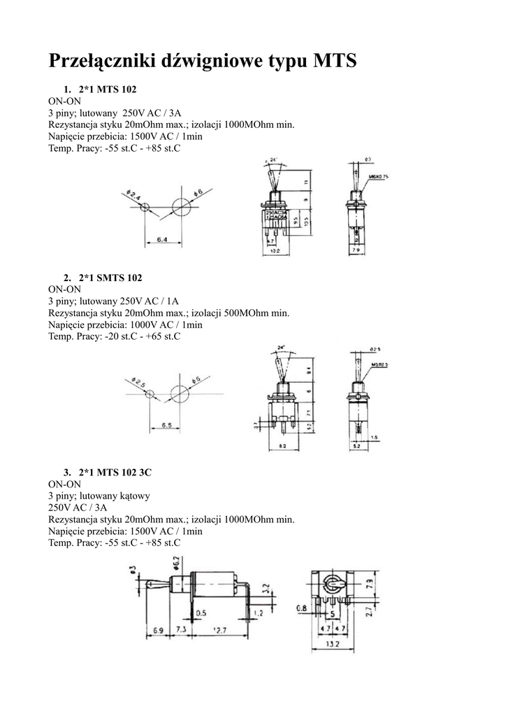 Przełączniki dźwigniowe typu MTS 1. 2*1 MTS 102 ON-ON 3 piny; lutowany 250V AC / 3A Rezystancja styku 20mOhm max.; izolacji 1000MOhm min. Napięcie przebicia: 1500V AC / 1min Temp. Pracy: -55 st.C - +85 st.C 2. 2*1 SMTS 102 ON-ON 3 piny; lutowany 250V AC / 1A Rezystancja styku 20mOhm max.; izolacji 500MOhm min. Napięcie przebicia: 1000V AC / 1min Temp. Pracy: -20 st.C - +65 st.C 3. 2*1 MTS 102 3C ON-ON 3 piny; lutowany kątowy 250V AC / 3A Rezystancja styku 20mOhm max.; izolacji 1000MOhm min. Napięcie przebicia: 1500V AC / 1min Temp. Pracy: -55 st.C - +85 st.C 4. 2*2 MTS 202 ON-ON 6 pin; lutowany 250V AC / 3A Rezystancja styku 20mOhm max.; izolacji 1000MOhm min. Napięcie przebicia: 1500V AC / 1min Temp. Pracy: -55 st.C - +85 st.C 5. 2*2 SMTS 202 do druku i lutowany ON-ON 6 pin; lutowany/do druku 250V AC / 1A Rezystancja styku 20mOhm max.; izolacji 500MOhm min. Napięcie przebicia: 1000V AC / 1min Temp. Pracy: -20 st.C - +65 st.C 6. 3*1 MTS 103 ON-OFF-ON 3 piny; lutowany 250V AC / 3A Rezystancja styku 20mOhm max.; izolacji 1000MOhm min. Napięcie przebicia: 1500V AC / 1min Temp. Pracy: -55 st.C - +85 st.C 7. 3*1 MTS 123 3C (ON)-OFF-(ON) 3 piny; lutowany kątowy 250V AC / 3A Rezystancja styku 20mOhm max.; izolacji 1000MOhm min. Napięcie przebicia: 1500V AC / 1min Temp. Pracy: -55 st.C - +85 st.C 8. 3*2 MTS 203 ON-OFF-ON 6 pin; lutowany 250V AC / 3A Rezystancja styku 20mOhm max.; izolacji 1000MOhm min. Napięcie przebicia: 1500V AC / 1min Temp. Pracy: -55 st.C - +85 st.C