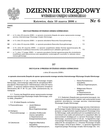 DZIENNIK URZÊDOWY WY¯SZEGO URZÊDU GÓRNICZEGO Nr 6 Katowice, dnia 10 marca 2006 r. TREŒÆ: Poz.: DECYZJE PREZESA WY¯SZEGO URZÊDU GÓRNICZEGO: 37 — nr 3 z dnia 20 stycznia 2006 r. w sprawie utworzenia Zespo³u do spraw opracowania nowego serwisu internetowego Wy¿szego Urzêdu Górniczego . . . . . . . . . . . . . . 71 38 — nr 4 z dnia 23 stycznia 2006 r. w sprawie odwo³ania Rzecznika Dyscyplinarnego . . . . . 72 39 — nr 5 z dnia 23 stycznia 2006 r. w sprawie powo³ania Rzecznika Dyscyplinarnego . . . . . 72 40 — nr 6 z dnia 25 stycznia 2006 r. w sprawie uzupe³nienia sk³adu Komisji egzaminacyjnej dla stwierdzenia kwalifikacji kierownika ruchu podziemnych zak³adów górniczych . . . . . . 73 41 — nr 7 z dnia 17 lutego 2006 r. w sprawie powo³ania Komisji egzaminacyjnej dla stwierdzenia kwalifikacji osób kierownictwa oraz specjalistów wykonuj¹cych czynnoœci w zakresie ratownictwa górniczego . . . . . . . . . . . . . . . . . . . . . . . . . . 73 37 DECYZJA Nr 3 PREZESA WY¯SZEGO URZÊDU GÓRNICZEGO z dnia 20 stycznia 2006 r. w sprawie utworzenia Zespo³u do spraw opracowania nowego serwisu internetowego Wy¿szego Urzêdu Górniczego Na podstawie § 2 ust. 4 statutu Wy¿szego Urzêdu Górniczego, stanowi¹cego za³¹cznik do zarz¹dzenia Ministra Spraw Wewnêtrznych i Administracji z dnia 25 marca 2002 r. w sprawie nadania statutu Wy¿szemu Urzêdowi Górniczemu (M. P. Nr 13, poz. 224), postanawia siê, co nastêpuje: § 1. Tworzy siê Zespó³ do spraw opracowania nowego serwisu internetowego Wy¿szego Urzêdu Górniczego, zwany dalej Zespo³em”. “ § 2. W sk³ad Zespo³u wchodz¹: 1) Przewodnicz¹cy — Jacek Bielawa dyrektor Biura Organizacyjnego; 2) Zastêpca Przewodnicz¹cego — Jaros³aw Królikowski starszy specjalista w Departamencie Energomechanicznym; 3) Cz³onkowie — Dagmara Machalica specjalista w Biurze Organizacyjnym, — Edyta Pawlukiewicz specjalista w Biurze Organizacyjnym, — Ma³gorzata Wawro inspektor w Departamencie Energomechanicznym. § 3. Zadaniem Zespo³u jest stworzenie koncepcji, merytoryczne przygotowanie i nadzór nad wykonaniem przez podmiot zewnêtrzny nowego serwisu internetowego Wy¿szego Urzêdu Górniczego. § 4. Tworz¹c koncepcjê nowego serwisu internetowego Wy¿szego Urzêdu Górniczego, Zespó³ wykorzystuje propozycje i uwagi komórek organizacyjnych Wy¿szego Urzêdu Górniczego, osób zatrudnionych na wyodrêbnionych stanowiskach oraz osób zatrudnionych w zespo³ach albo na stanowiskach dzia³aj¹cych w ramach Wy¿szego Urzêdu Górniczego, wymienionych w § 6 ust. 1a regulaminu organizacyjnego Wy¿szego Urzêdu Górniczego, stanowi¹cego za³¹cznik do zarz¹dzenia nr 1 Prezesa Wy¿szego Urzêdu Górniczego z dnia 8 lipca 2002 r. w sprawie regulaminu organizacyjnego Wy¿szego Urzêdu Górniczego (Dz. Urz. Dziennik Urzêdowy Nr 6 Wy¿szego Urzêdu Górniczego - 72 - WUG Nr 1, poz. 2, z 2003 r. Nr 4, poz. 15, z 2004 r. Nr 5, poz. 24 oraz z 2005 r. Nr 6, poz. 22). § 5. 1. Zespó³ odbywa posiedzenia w zale¿noœci od potrzeb, w terminach i sk³adzie ustalonych przez Przewodnicz¹cego Zespo³u. 2. Ustalenie przez Przewodnicz¹cego Zespo³u sk³adu, w którym zostanie odbyte posiedzenie, nastêpuje z uwzglêd- Poz. 37, 38 i 39 nieniem zagadnieñ, które bêd¹ rozpatrywane. § 6. Zespó³ rozpocznie pracê niezw³ocznie i zakoñczy j¹ w terminie do dnia 29 grudnia 2006 r. § 7. Decyzja wchodzi w ¿ycie z dniem podpisania. Prezes Wy¿szego Urzêdu Górniczego: Wojciech Bradecki 38 DECYZJA Nr 4 PREZESA WY¯SZEGO URZÊDU GÓRNICZEGO z dnia 23 stycznia 2006 r. w sprawie odwo³ania Rzecznika Dyscyplinarnego Na podstawie art. 117 ust. 1 ustawy z dnia 18 grudnia 1998 r. o s³u¿bie cywilnej (Dz. U. z 1999 r. Nr 49, poz. 483, z póŸn. zm.1 )) postanawia siê, co nastêpuje: 1) Zmiany wymienionej ustawy zosta³y og³oszone w Dz. U. z 1999 r. Nr 70, poz. 778 i Nr 110, poz. 1255, z 2001 r. Nr 102, poz. 1116, Nr 111, poz. 1194, Nr 128, poz. 1403 i Nr 154, poz. 1800, z 2002 r. Nr 150, poz. 1237, Nr 153, poz. 1271, Nr 238, poz. 2025 i Nr 240, poz. 2052, z 2003 r. Nr 228, poz. 2256 i 2257, z 2004 r. Nr 33, poz. 287, Nr 179, poz. 1845 i Nr 273, poz. 2703 oraz z 2005 r. Nr 10, poz. 71, Nr 132, poz. 1110 i Nr 249, poz. 2104. § 1. Odwo³uje siê mgr. Erwina D³ugajczyka z funkcji Rzecznika Dyscyplinarnego Okrêgowych Urzêdów Górniczych oraz Urzêdu Górniczego do Badañ Kontrolnych Urz¹dzeñ Energomechanicznych, w zwi¹zku z przejœciem na emeryturê. § 2. Decyzja wchodzi w ¿ycie z dniem podpisania. Prezes Wy¿szego Urzêdu Górniczego: Wojciech Bradecki 39 DECYZJA Nr 5 PREZESA WY¯SZEGO URZÊDU GÓRNICZEGO z dnia 23 stycznia 2006 r. w sprawie powo³ania Rzecznika Dyscyplinarnego Na podstawie art. 117 ust. 1 ustawy z dnia 18 grudnia 1998 r. o s³u¿bie cywilnej (Dz. U. z 1999 r. Nr 49, poz. 483, z póŸn. zm.1 )) postanawia siê, co nastêpuje: 1) Zmiany wymienionej ustawy zosta³y og³oszone w Dz. U. z 1999 r. Nr 70, poz. 778 i Nr 110, poz. 1255, z 2001 r. Nr 102, poz. 1116, Nr 111, poz. 1194, Nr 128, poz. 1403 i Nr 154, poz. 1800, z 2002 r. Nr 150, poz. 1237, Nr 153, poz. 1271, Nr 238, poz. 2025 i Nr 240, poz. 2052, z 2003 r. Nr 228, poz. 2256 i 2257, z 2004 r. Nr 33, poz. 287, Nr 179, poz. 1845 i Nr 273, poz. 2703 oraz z 2005 r. Nr 10, poz. 71, Nr 132, poz. 1110 i Nr 249, poz. 2104. § 1. Powo³uje siê mgr. Rafa³a Siutê — referenta prawnego w Okrêgowym Urzêdzie Górniczym w Poznaniu, na Rzecznika Dyscyplinarnego Okrêgowych Urzêdów Górniczych oraz Urzêdu Górniczego do Badañ Kontrolnych Urz¹dzeñ Energomechanicznych. § 2. Decyzja wchodzi w ¿ycie z dniem podpisania. Prezes Wy¿szego Urzêdu Górniczego: Wojciech Bradecki Dziennik Urzêdowy Nr 6 Wy¿szego Urzêdu Górniczego - 73 - Poz. 40 i 41 40 DECYZJA Nr 6 PREZESA WY¯SZEGO URZÊDU GÓRNICZEGO z dnia 25 stycznia 2006 r. w sprawie uzupe³nienia sk³adu Komisji egzaminacyjnej dla stwierdzenia kwalifikacji kierownika ruchu podziemnych zak³adów górniczych Na po