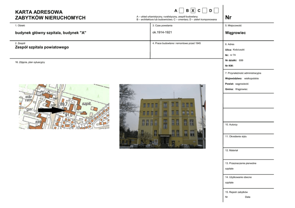 KARTA ADRESOWA ZABYTKÓW NIERUCHOMYCH A B X C D A – układ urbanistyczny, ruralistyczny, zespół budowlany; B – architektura lub budownictwo; C – cmentarz; D – zieleń komponowana Nr 1. Obiekt 3. Czas powstania 5. Miejscowość budynek główny szpitala, budynek "A" ok.1914-1921 Wągrowiec 2. Zespół 4. Prace budowlane i remontowe przed 1945 6. Adres Zespół szpitala powiatowego Ulica: Kościuszki Nr: nr 74 16. Zdjęcia, plan sytuacyjny Nr działki: 699 Nr KW: 7. Przynależność administracyjna Województwo: wielkopolskie Powiat: wągrowiecki Gmina: Wągrowiec 10. Autorzy 11. Określenie stylu 12. Materiał 13. Przeznaczenie pierwotne szpitale 14. Użytkowanie obecne szpitale 15. Rejestr zabytków Nr Data 17. Dodatkowe materiały kartograficzne i fotografie 18. Dodatkowe informacje, weryfikacja danych ze strony tytułowej, uwagi (osoba dokonująca wpisu i data) 19. Autor karty i data jej wypełnienia PAK "Arch-Geo" s.c. Copyright © 2006 by Grzegorz J. Budnik 2012-02-29