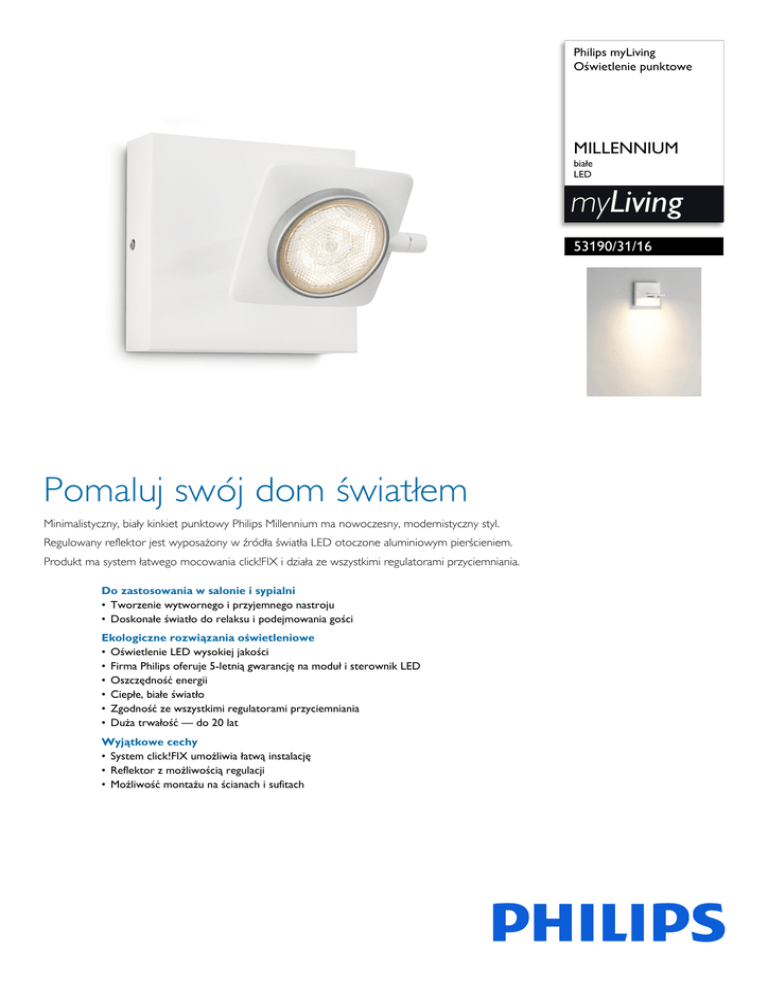 Philips myLiving Oświetlenie punktowe MILLENNIUM białe LED myLiving 53190/31/16 Pomaluj swój dom światłem Minimalistyczny, biały kinkiet punktowy Philips Millennium ma nowoczesny, modernistyczny styl. Regulowany reflektor jest wyposażony w źródła światła LED otoczone aluminiowym pierścieniem. Produkt ma system łatwego mocowania click!FIX i działa ze wszystkimi regulatorami przyciemniania. Do zastosowania w salonie i sypialni • Tworzenie wytwornego i przyjemnego nastroju • Doskonałe światło do relaksu i podejmowania gości Ekologiczne rozwiązania oświetleniowe • Oświetlenie LED wysokiej jakości • Firma Philips oferuje 5-letnią gwarancję na moduł i sterownik LED • Oszczędność energii • Ciepłe, białe światło • Zgodność ze wszystkimi regulatorami przyciemniania • Duża trwałość — do 20 lat Wyjątkowe cechy • System click!FIX umożliwia łatwą instalację • Reflektor z możliwością regulacji • Możliwość montażu na ścianach i sufitach 531903116 Oświetlenie punktowe MILLENNIUM białe, LED Zalety Oświetlenie LED wysokiej jakości Reflektor z możliwością regulacji opatentowany przez firmę Philips. Korzystając z systemu click!FIX, można łatwo zamontować lampę w 4 prostych krokach. To proste i szybkie! Oszczędność energii Technologia LED zastosowana w tej lampie firmy Philips to wyjątkowe rozwiązanie opracowane przez firmę Philips. Natychmiast się włącza, pozwala na uzyskanie optymalnej wydajności oświetlenia oraz podkreśla i ożywia kolory w Twoim domu. Skieruj światło w wybrane miejsce, obracając lub nachylając reflektor. Zgodność ze wszystkimi regulatorami przyciemniania Ta energooszczędna lampa firmy Philips zużywa mniej energii niż tradycyjne źródła światła, co pozwala zmniejszyć rachunki za prąd i przyczynia się do ochrony środowiska. Ciepłe, białe światło Duża trwałość Światło może mieć różne temperatury barwowe oznaczane za pomocą jednostek zwanych kelwinami (K). Lampy o niskiej wartości kelwinów zapewniają ciepłe, bardziej przytulne światło, natomiast lampy o wysokiej wartości kelwinów dają chłodne, bardziej pobudzające światło. Ta lampa firmy Philips rzuca ciepłe, białe światło, które zapewnia przytulną atmosferę. Ta lampa LED firmy Philips jest wyposażona w najnowszą technologię LED, która współpracuje niemal ze wszystkimi regulatorami przyciemniania. Możesz użyć posiadanego regulatora lub dowolnego innego! System łatwego mocowania click!FIX Lampa LED wykorzystuje system click!FIX, czyli nowy, rewolucyjny system mocowania Produkt godny zaufania. Trwałość wbudowanych źródeł światła LED wykorzystanych w tej lampie LED firmy Philips wynosi nawet 20 tysięcy godzin (co oznacza 20 lat w przypadku średniego użycia przez 3 godziny dziennie, przy co najmniej 13 000 włączeń i wyłączeń). Już nie musisz się martwić naprawą lub wymianą żarówki, ciesząc się doskonałym, nastrojowym oświetleniem w domu. 531903116 Oświetlenie punktowe MILLENNIUM białe, LED Dane techniczne Stylistyka i wykończenie • Zgodność ze wszystkimi regulatorami przyciemniania • Wbudowane diody LED • Precyzyjne wiązki światła • System mocowania click!FIX • Reflektor z możliwością regulacji • Kąt rozsyłu: 50° • Łączna moc strumienia świetlnego oprawy w lumenach: 280 lm • Oprawa z możliwością przyciemniania • LED • Maksymalny okres eksploatacji: 20 000 godz. • Współczynnik IP: IP20, ochrona przed przedmiotami powyżej 12,5 mm, brak ochrony przed wodą • Klasa ochronności: I — uziemienie • Źródło światła odpowiadające tradycyjnej żarówce o mocy: 54 W Wymiary i waga produktu Serwis • Materiał: metal • Kolor: biały Dodatkowe funkcje/akcesoria w zestawie • • • • Wysokość: 12,7 cm Długość: 11 cm Szerokość: 11 cm Waga netto: 0,455 kg • Gwarancja: 5 lat Wymiary i waga opakowania Dane techniczne • Zasilanie sieciowe: Przedział 220–240 V, 50–60 Hz • Technologia źródła światła: LED, Bezpieczne, bardzo niskie napięcie • Liczba źródeł światła: 1 • Moc źródła światła w zestawie: 4 W • Barwa światła: ciepła biel • • • • Wysokość: 11,8 cm Długość: 11,3 cm Szerokość: 11,3 cm Waga: 0,545 kg Różne • Opracowano z myślą o: Salon i sypialnia • Styl: Nowoczesna • Typ: Oświetlenie punktowe • Data wydania 2016-06-28 © 2016 Koninklijke Philips N.V. Wszelkie prawa zastrzeżone. Wersja: 3.0.1 Dane techniczne mogą ulec zmianie bez powiadomienia. Znaki towarowe są własnością Koninklijke Philips N.V. lub własnością odpowiednich firm. 12 NC: 9150 043 34101 EAN: 87 18291 48846 0 www.philips.com