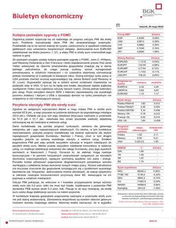 Biuletyn ekonomiczny wtorek, 24 maja 2016 Kolejne jastrzębie sygnały z FOMC Fixing NBP Zagranicą tydzień rozpoczął się od słabszego od prognoz odczytu PMI dla strefy euro. Podobnie rozczarowały dane PMI dla amerykańskiego przemysłu. Przekładało się to na wzrost awersji do ryzyka, uwidoczniony w spadkach indeksów giełdowych oraz umocnieniu bezpiecznych obligacji. Jednocześnie kurs EURUSD ustabilizował się blisko poziomu 1,121, a słaby PMI w strefy euro uniemożliwił jego wybicie w górę. EUR 4,4293 0,29% USD 3,9513 0,39% CHF 3,9862 0,35% GBP 5,7449 0,16% JPY 3,6055 1,09% Ze spokojem przyjęte zostały kolejne jastrzębie sygnały z FOMC. John C. Williams, szef Rezerwy Federalnej w San Francisco i bliski współpracownik prezes Fed Janet Yellen wskazywał, że obecnie amerykańska gospodarka znajduje się w stanie pełnego zatrudnienia, do czego pasuje szybszy wzrost wynagrodzeń odnotowywany w ostatnich miesiącach i co uzasadnia stopniową normalizację polityki monetarnej (2-3 podwyżki w bieżącym roku). Ocenę kondycji rynku pracy w USA podziela również wczoraj wypowiadający się James Bullard (szef Rezerwy w St. Louis). Wypowiedzi wpisują się w ostatni wzrost oczekiwań inwestorów na podwyżki stóp w USA. O tym na ile będą one trwałe, decydować będzie piątkowe wystąpienie Yellen oraz najbliższe odczyty danych makro. Dzisiaj jednak kalendarz jest ubogi. Poza odczytem danych ZEW z Niemiec (spodziewamy się wysokiego poziomu indeksu) i danymi z USA o sprzedaży domów na rynku pierwotnym nie znajdziemy w nim interesujących pozycji. Waluty Bazowe Peryferie obniżyły PMI dla strefy euro Polska PS0418 1,60 0,012 Polska PS0421 2,36 0,053 Polska DS0726 3,10 0,036 Niemcy 10L 0,18 0,012 Francja 10L 0,52 0,014 USA 10L 1,84 -0,009 Zgodnie ze wstępnymi wyliczeniami Markit w maju indeks PMI w strefie euro wyniósł 52,9 pkt., a więc pozostał na poziomie zbliżonym do poprzedniego miesiąca (53,0 pkt.). Osłabiła się przy tym jego składowa dotycząca nastrojów w przemyśle do 51,5 pkt z 51,7 pkt., natomiast bez zmian pozostała wielkość składowej odnoszącej się do nastrojów w sektorze usług. 1,1219 -0,04% EURJPY 122,55 -0,86% EURGBP 0,7744 0,13% EURCHF 1,1102 -0,11% USDJPY 109,24 -0,83% Prognoza na koniec EURPLN czerwca września 4,32 4,25 USDPLN 3,82 3,63 EURUSD 1,13 1,17 Rynki długu Prognoza na koniec czerwca Polska Odczyt PMI pokazuje, że widoczne w I kwartale przyspieszenie tempa wzrostu strefy euro (do 0,5 proc. kdk) nie musi być trwałe. Implikowana z poziomów PMI dynamika PKB wynosi około 0,3 proc. kdk. Pasuje to do tezy mówiącej, że strefę euro czeka długa stabilizacja wzrostu na niskim poziomie. Bank Gospodarstwa Krajowego Kontakt: tel. (+48 22) 52-29-211, tel. (+48 22) 52-29-211 Al. Jerozolimskie 7, 00-955 Warszawa Główny Ekonomista Tomasz Kaczor +48 22 596 59 13 Analityk Piotr Dmitrowski +48 22 522 92 17 Zmiana EURUSD Dane kształtowały się poniżej prognoz rynkowych, zarówno dla głównego wskaźnika, jak i jego najważniejszych składowych. Co istotne, w tym kontekście nieoczekiwanie, powyżej prognoz kształtowały się osobne wyliczenia dla dwóch największych gospodarek Eurolandu, Niemiec i Francji, choć w tym drugim wypadku jedynie za sprawą wysokiego odczytu z sektora usług. Źródłem pogorszenia PMI jest więc przede wszystkim sytuacja w krajach należących do peryferii strefy euro. Martwi przede wszystkim osłabienie koniunktury w sektorze usług, co implikuje stabilizacja wskaźnika dla całego Eurolandu, przy jego wysokich wzrostach w Niemczech i Francji. Oznacza to, że słabnąć mogą nastroje konsumpcyjne i to pomimo korzystnych uwarunkowań związanych ze wzrostem dochodów rozporządzalnych, będącym pochodną spadków cen paliw i energii. Ponadto trzeba odnotować pogorszenie długoterminowych perspektyw wzrostu wynikające z osłabienia tempa tworzenia nowych miejsc pracy. Wzrost zatrudnienia ma kluczowe znaczenie dla gospodarek borykających się z problemem wysokiego bezrobocia (np. Hiszpania). Jednocześnie można odnotować, że więcej optymizmu w zakresie nastrojów konsumenckich przynoszą dane KE, wskazujące na ich poprawę w ostatnich miesiącach. W kontekście krajowej gospodarki pogorszenie nastrojów w przemyśle strefy euro nie jest dobrą wiadomością. Zamówienia eksportowe są bowiem obecnie głównym motorem wzrostu krajowego sektora. Niemniej trzeba zaznaczyć, że w wypadku Zmiana Zmiana stopa referencyjna rentowność 10Y 1,50 3,11 0,00 0,31 0,25-0,5 1,95 Niemcy USA WIBOR % Zmiana O/N 1,64 - 1M 1,58 - 3M 1,67 - 6M 1,74 - Rynki kapitałowe Zmiana WIG 46042,2 0,56% FTSE 100 6136,4 -0,32% DAX 9842,3 -0,74% DJI 17492,9 -0,05% NIKKEI 16498,8 -0,94% Szanghaj 2813,8 -1,05% Notowania z końca ostatniego dnia roboczego, zmiana w stosunku do poprzedniego notowania (dla stóp banków centralnych - od ostatniego posiedzenia). Źródła informacji: Bloomberg, Thomson Reuters, PAP, GUS, NBP, NYMEX, GPW 1 Biuletyn ekonomiczny wtorek, 24 maja 2016 zapewne nawet dobry odczyt ZEW z Niemiec. W związku z tym, choć uważamy, że po ostatnim osłabieniu złoty jest niedowartościowany w odniesieniu do dobrych fundamentów krajowego wzrostu gospodarczego, to jednak nie spodziewamy się, by szybko mogła nastąpić jego wyraźna aprecjacja. W naszej ocenie bardziej prawdopodobna jest stabilizacja w przedziale 4,43-4,45. Polski największym odbiorcą pozostaje gospodarka niemiecka, gdzie nastroje nieznaczne poprawiły się, a mierzący je wskaźnik pozostaje na solidnych poziomach. Wysokie poziomy wskaźników koniunktury z Niemiec odnajdują również odzwierciedlenie w danych z realnej gospodarki, która w I kwartale urosła o 0,7 proc., co jest najwyższym wzrostem w okresie ostatnich dwóch lat. Tydzień słabo się zaczął również dla polskich obligacji skarbowych. Krzywa rentowności przesunęła się w górę na całej długości o 2-5 pb. Spadki cen łączymy zarówno z czynnikami p