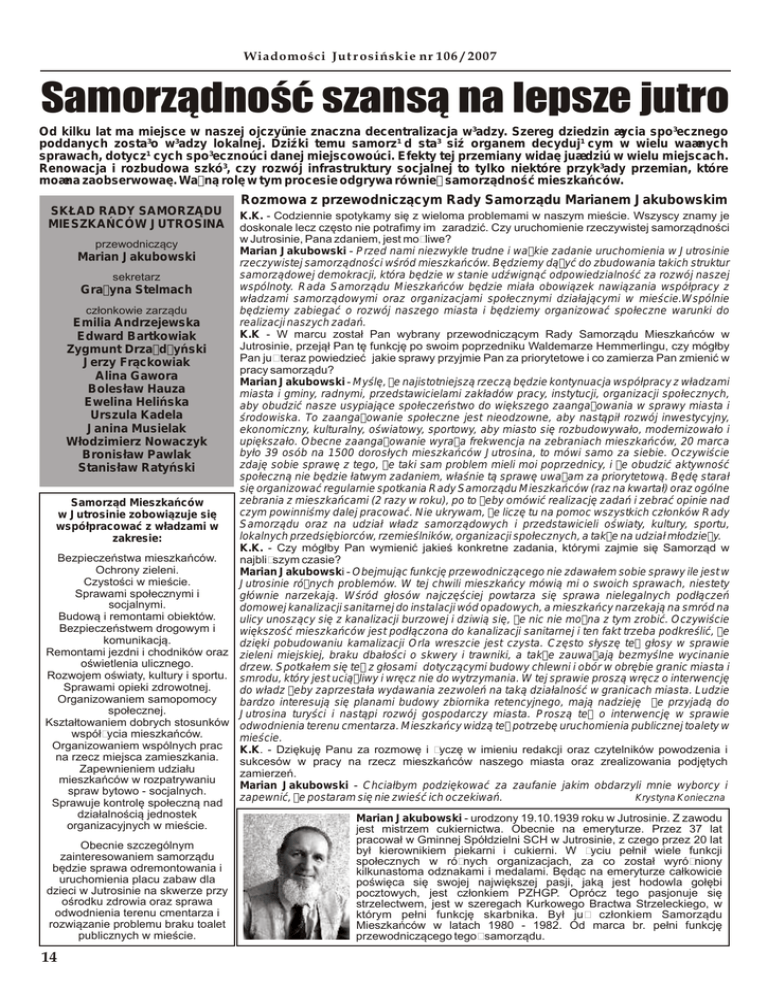 Wiadomości Jut r osińskie nr 106 / 2007 Samorządność szansą na lepsze jutro Od kilku lat ma miejsce w naszej ojczyü nie znaczna decentralizacja w³adzy. Szereg dziedzin æycia spo³ecznego poddanych zosta³o w³adzy lokalnej. Dziźki temu samorz¹ d sta³ siź organem decyduj¹ cym w wielu waænych sprawach, dotycz¹ cych spo³ecznoú ci danej miejscowoú ci. Efekty tej przemiany widaę juædziú w wielu miejscach. Renowacja i rozbudowa szkó³, czy rozwój infrastruktury socjalnej to tylko niektóre przyk³ady przemian, które moæna zaobserwowaę. Ważną rolę w tym procesie odgrywa również samorządność mieszkańców. SKŁAD RADY SAMORZĄDU MIESZKAŃCÓW JUTROSINA Rozmowa z przewodniczącym Rady Samorządu Marianem Jakubowskim K.K. - Codziennie spotykamy się z wieloma problemami w naszym mieście. Wszyscy znamy je doskonale lecz często nie potrafimy im zaradzić. Czy uruchomienie rzeczywistej samorządności w Jutrosinie, Pana zdaniem, jest możliwe? przewodniczący Marian Jakubowski - Przed nami niezwykle trudne i ważkie zadanie uruchomienia w Jutrosinie Marian Jakubowski rzeczywistej samorządności wśród mieszkańców. Będziemy dążyć do zbudowania takich struktur samorządowej demokracji, która będzie w stanie udźwignąć odpowiedzialność za rozwój naszej sekretarz wspólnoty. Rada Samorządu Mieszkańców będzie miała obowiązek nawiązania współpracy z Grażyna Stelmach władzami samorządowymi oraz organizacjami społecznymi działającymi w mieście.Wspólnie członkowie zarządu będziemy zabiegać o rozwój naszego miasta i będziemy organizować społeczne warunki do realizacji naszych zadań. Emilia Andrzejewska K.K - W marcu został Pan wybrany przewodniczącym Rady Samorządu Mieszkańców w Edward Bartkowiak Jutrosinie, przejął Pan tę funkcję po swoim poprzedniku Waldemarze Hemmerlingu, czy mógłby Zygmunt Drzażdżyński Pan już teraz powiedzieć jakie sprawy przyjmie Pan za priorytetowe i co zamierza Pan zmienić w Jerzy Frąckowiak pracy samorządu? Alina Gawora Marian Jakubowski - Myślę, że najistotniejszą rzeczą będzie kontynuacja współpracy z władzami Bolesław Hauza miasta i gminy, radnymi, przedstawicielami zakładów pracy, instytucji, organizacji społecznych, Ewelina Helińska aby obudzić nasze usypiające społeczeństwo do większego zaangażowania w sprawy miasta i Urszula Kadela środowiska. To zaangażowanie społeczne jest nieodzowne, aby nastąpił rozwój inwestycyjny, Janina Musielak ekonomiczny, kulturalny, oświatowy, sportowy, aby miasto się rozbudowywało, modernizowało i upiększało. Obecne zaangażowanie wyraża frekwencja na zebraniach mieszkańców, 20 marca Włodzimierz Nowaczyk było 39 osób na 1500 dorosłych mieszkańców Jutrosina, to mówi samo za siebie. Oczywiście Bronisław Pawlak zdaję sobie sprawę z tego, że taki sam problem mieli moi poprzednicy, i że obudzić aktywność Stanisław Ratyński społeczną nie będzie łatwym zadaniem, właśnie tą sprawę uważam za priorytetową. Będę starał się organizować regularnie spotkania Rady Samorządu Mieszkańców (raz na kwartał) oraz ogólne zebrania z mieszkańcami (2 razy w roku), po to żeby omówić realizację zadań i zebrać opinie nad Samorząd Mieszkańców czym powinniśmy dalej pracować. Nie ukrywam, że liczę tu na pomoc wszystkich członków Rady w Jutrosinie zobowiązuje się Samorządu oraz na udział władz samorządowych i przedstawicieli oświaty, kultury, sportu, współpracować z władzami w lokalnych przedsiębiorców, rzemieślników, organizacji społecznych, a także na udział młodzieży. zakresie: K.K. - Czy mógłby Pan wymienić jakieś konkretne zadania, którymi zajmie się Samorząd w Bezpieczeństwa mieszkańców. najbliższym czasie? Ochrony zieleni. Marian Jakubowski - Obejmując funkcję przewodniczącego nie zdawałem sobie sprawy ile jest w Czystości w mieście. Jutrosinie różnych problemów. W tej chwili mieszkańcy mówią mi o swoich sprawach, niestety Sprawami społecznymi i głównie narzekają. Wśród głosów najczęściej powtarza się sprawa nielegalnych podłączeń socjalnymi. domowej kanalizacji sanitarnej do instalacji wód opadowych, a mieszkańcy narzekają na smród na Budową i remontami obiektów. ulicy unoszący się z kanalizacji burzowej i dziwią się, że nic nie można z tym zrobić. Oczywiście Bezpieczeństwem drogowym i większość mieszkańców jest podłączona do kanalizacji sanitarnej i ten fakt trzeba podkreślić, że komunikacją. dzięki pobudowaniu kamalizacji Orla wreszcie jest czysta. Często słyszę też głosy w sprawie Remontami jezdni i chodników oraz zieleni miejskiej, braku dbałości o skwery i trawniki, a także zauważają bezmyślne wycinanie oświetlenia ulicznego. drzew. Spotkałem się też z głosami dotyczącymi budowy chlewni i obór w obrębie granic miasta i Rozwojem oświaty, kultury i sportu. smrodu, który jest uciążliwy i wręcz nie do wytrzymania. W tej sprawie proszą wręcz o interwencję Sprawami opieki zdrowotnej. do władz żeby zaprzestała wydawania zezwoleń na taką działalność w granicach miasta. Ludzie Organizowaniem samopomocy bardzo interesują się planami budowy zbiornika retencyjnego, mają nadzieję że przyjadą do społecznej. Jutrosina turyści i nastąpi rozwój gospodarczy miasta. Proszą też o interwencję w sprawie Kształtowaniem dobrych stosunków odwodnienia terenu cmentarza. Mieszkańcy widzą też potrzebę uruchomienia publicznej toalety w współżycia mieszkańców. mieście. Organizowaniem wspólnych prac K.K. - Dziękuję Panu za rozmowę i życzę w imieniu redakcji oraz czytelników powodzenia i na rzecz miejsca zamieszkania. sukcesów w pracy na rzecz mieszkańców naszego miasta oraz zrealizowania podjętych Zapewnieniem udziału zamierzeń. mieszkańców w rozpatrywaniu Marian Jakubowski - Chciałbym podziękować za zaufanie jakim obdarzyli mnie wyborcy i spraw bytowo - so
