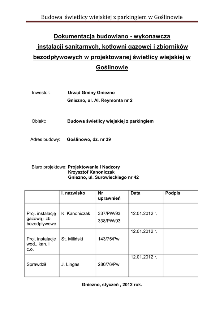 Budowa świetlicy wiejskiej z parkingiem w Goślinowie Dokumentacja budowlano - wykonawcza instalacji sanitarnych, kotłowni gazowej i zbiorników bezodpływowych w projektowanej świetlicy wiejskiej w Goślinowie Inwestor: Urząd Gminy Gniezno Gniezno, ul. Al. Reymonta nr 2 Obiekt: Budowa świetlicy wiejskiej z parkingiem Adres budowy: Goślinowo, dz. nr 39 Biuro projektowe: Projektowanie i Nadzory Krzysztof Kanoniczak Gniezno, ul. Surowieckiego nr 42 Proj. instalację gazową i zb. bezodpływowe I. nazwisko Nr uprawnień Data K. Kanoniczak 337/PW/93 12.01.2012 r. 338/PW/93 12.01.2012 r. Proj. instalacje wod., kan. i c.o. St. Miliński 143/75/Pw 12.01.2012 r. Sprawdził J. Lingas 280/76/Pw Gniezno, styczeń , 2012 rok. Podpis Budowa świetlicy wiejskiej z parkingiem w Goślinowie Spis treści strona 1. Strona tytułowa………………………………………………………………….............1 2. Spis treści…………………………………………………………………………..........2 3. Opis techniczny …………………………………………………………….…………..3 4. Zestawienie głównych materiałów…………………………………………………...11 5. Opis dot. Bezodpływowych zbiorników……………………………………………..12 6. Informacja BIOZ……………………………………………………………………….14 7. Oświadczenie projektantów i sprawdzającego projekt ……………………….......16 8. Uprawnienia proj. zbiorników bezodpływowych…………………………………...17 9. Zaświadczenie o przynależności do Izby Budowlanej projektanta……………....18 10. Uprawnienia proj. instalacji gazowej………………………………………………..19 11. Zaświadczenie o przynależności do Izby Budowlanej projektanta inst.sanit…..20 12. Uprawnienia proj. instalacji sanit……………………………………………………21 13. Zaświadczenie o przynależności do Izby Budowlanej sprawdzającego………..22 14. Uprawnienia sprawdzającego proj………………………………………………....23 15. Warunki techniczne dostawy gazu………………………………………………....24 16. Rys. nr 1 - Proj. instalacji wody zimnej………………...………………………...27 17. Rys. nr 2 - Proj. instalacji kanalizacyjnej………………………………………...28 18. Rys. nr 3 - Proj. instalacji gazowej………………..……………………………...29 19. Rys. nr 4 - Aksonometria instalacji gazowej………………………………….....30 20. Rys. nr 5 - Proj. instalacji c.o……………………………………………………...31 21. Rys. nr 6 - Rozwinięcie instalacji c.o………………………………………….....32 Budowa świetlicy wiejskiej z parkingiem w Goślinowie OPIS TECHNICZNY Opis techniczny dotyczy projektu instalacji wod-kan., gaz i c.o. dla projektowanego budynku świetlicy wiejskiej w Goślinowie na działce nr 39 w Gminie Gniezno. 1. Podstawy opracowania - zlecenie Inwestora, - rzuty architektoniczno-budowlane, - uzgodnienia międzybranżowe, - Warunki techniczne wydane przez PWiK Sp. z .o.o. w Gnieźnie, - Opinia wydana przez Wielkopolski Operator Systemu Dystrybucyjnego w Poznaniu, - obowiązujące przepisy i normy, - informacje techniczne. 2. Zakres opracowania Projekt obejmuje następujące instalacje: - kanalizacja sanitarna, - kanalizacja deszczowa, - instalacja z.w.; c.w. - instalacja gazu - instalacja c.o. 3. Opis techniczny instalacji kanalizacyjnej. Z budynku zaprojektowano dwa wyjścia przewodów kanalizacyjnych na zewnątrz. Oba przyłącza łączą się za pomocą trójnika i dalej przewodem o średnicy Dn 160 mm z P.C.V. odprowadzone zostają ścieki do dwóch 3 zbiorników bezodpływowych o pojemności każdego z nich 10,0 m . 3.1. Rurociągi podposadzkowe. Przewody podposadzkowe kanalizacji sanitarnej wykonać z rur grubościennego PVC. Przewody układać na podsypce piaskowej gr. 10 cm w wykopach wykonywanych ręcznie. Piony i podejście kanalizacyjne do przyborów sanitarnych zrealizowane będą z tradycyjnych rur i kształtek PCW. 3.2. Podejścia kanalizacyjne. Podejścia kanalizacyjne będą maskowane poprzez murowanie tzw. cokolików. W związku z tym rury przewidziane do maskowania owinąć należy papierem falistym i odrutować. Budowa świetlicy wiejskiej z parkingiem w Goślinowie Przy wszystkich przejściach przez przegrody budowlane rury kanalizacyjne należy owinąć folią / np. tzw. „foliówką„/. 3.3. Wyposażenie sanitarne pomieszczeń. Projektuje się standardowe wyposażenie mieszkań w następujące przybory sanitarne: - umywalki fajansowe 600x440 mm z otworami do baterii stojącej, z syfonem gruszkowym - zlewozmywaki dwukomorowe i jednokomorowe, blaszane, emaliowane, białe, z otworami do baterii stojącej, z syfonem zlewozmywakowym z PCW, - miski ustępowe z porsanitu z dolnopłukiem, - pisuary pojedyncze z płuczką - wpusty ściekowe z tworzywa sztucznego 3.4. Piony kanalizacyjne. Każdy pion kanalizacyjny zakończony będzie rurą wywiewną z PCW o średnicy Dn 150 mm wyprowadzoną nad dach 0,5 m powyżej połaci dachowej. U dołu pionów, montować rewizje służące do ewentualnego czyszczenia poziomów odpływowych. Rewizje te należy montować na każdym pionie kanalizacyjnym. 4. Opis techniczny instalacji wody zimnej. 4.1. Zasilanie instalacji wody zimnej. Woda zimna do budynku dostarczona będzie z projektowanego przyłącza / odrębnym projektem / . Przyłącze PE śr. 40 mm, wprowadzone zostanie do kotłowni gazowej, gdzie zlokalizowano wodomierz skrzydełkowy Js1,5, zawór zwrotny i zawór antyskażeniowy . Instalacja wody zimnej składa się z poziomów i pionów prowadzonych w posadzce z rur TE-CE. 4.2. Prowadzenie przewodów instalacji wody zimnej. Przewody prowadzone będą w posadzce, a podejścia w ścianach podty