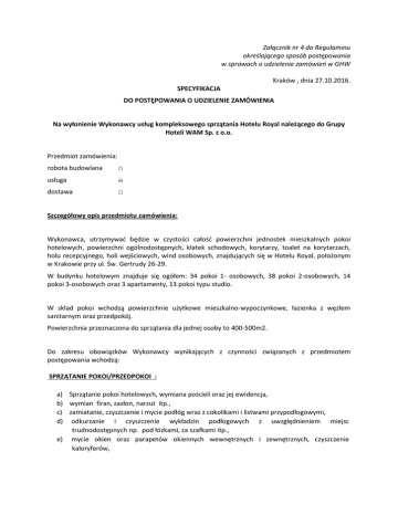 Załącznik nr 4 do Regulaminu określającego sposób postępowania w sprawach o udzielenie zamówień w GHW Kraków , dnia 27.10.2016. SPECYFIKACJA DO POSTĘPOWANIA O UDZIELENIE ZAMÓWIENIA Na wyłonienie Wykonawcy usług kompleksowego sprzątania Hotelu Royal należącego do Grupy Hoteli WAM Sp. z o.o. Przedmiot zamówienia: robota budowlana □ usługa □ dostawa □ Szczegółowy opis przedmiotu zamówienia: Wykonawca, utrzymywać będzie w czystości całość powierzchni jednostek mieszkalnych pokoi hotelowych, powierzchni ogólnodostępnych, klatek schodowych, korytarzy, toalet na korytarzach, holu recepcyjnego, holi wejściowych, wind osobowych, znajdujących się w Hotelu Royal, położonym w Krakowie przy ul. Św. Gertrudy 26-29. W budynku hotelowym znajduje się ogółem: 34 pokoi 1- osobowych, 38 pokoi 2-osobowych, 14 pokoi 3-osobowych oraz 3 apartamenty, 13 pokoi typu studio. W skład pokoi wchodzą powierzchnie użytkowe mieszkalno-wypoczynkowe, łazienka z węzłem sanitarnym oraz przedpokój. Powierzchnia przeznaczona do sprzątania dla jednej osoby to 400-500m2. Do zakresu obowiązków Wykonawcy wynikających z czynności związanych z przedmiotem postępowania wchodzą: SPRZĄTANIE POKOI/PRZEDPOKOI : a) Sprzątanie pokoi hotelowych, wymiana pościeli oraz jej ewidencja, b) wymian firan, zasłon, narzut itp., c) zamiatanie, czyszczenie i mycie podłóg wraz z cokolikami i listwami przypodłogowymi, d) odkurzanie i czyszczenie wykładzin podłogowych z uwzględnieniem miejsc trudnodostępnych np. pod łózkami, za szafkami itp., e) mycie okien oraz parapetów okiennych wewnętrznych i zewnętrznych, czyszczenie kaloryferów, f) czyszczenie oraz wycieranie z kurzy z zewnątrz oraz wewnątrz: biurek, lampek nocnych, obrazów, telewizorów, telefonów foteli, krzeseł, szaf oraz innych mebli i dekoracji znajdujących się w pokoju, g) uzupełnienie informacji oraz reklam w teczkach hotelowych zgodnie z określonymi standardami, h) mycie luster , i) opróżniania koszy na śmieci, j) mycie futryn, drzwi i klamek od wewnątrz oraz z zewnątrz, k) czyszczenie wywietrzników (kratek wentylacyjnych), l) zgłaszanie oraz odnoszenie rzeczy zaginionych/ pozostawionych przez gości hotelowych, m) informowanie o brakach i usterkach w pokojach, n) inne czynności w ramach sprzątania pokoi zlecone przez Zamawiającego, SPRZĄTANIE ŁAZIENEK : a) mycie i sprzątanie sanitariatów (mycie glazury wokół umywalek, czyszczenie luster, półek łazienkowych, armatury umywalkowej/natryskowej, dezynfekcja muszli klozetowych i pisuarów, mycie i czyszczenie pojemników na mydło w płynie/jeżeli znajdują się w łazience/, na papier toaletowy itp.) b) uzupełnianie na bieżąco w sanitariatach papieru toaletowego, mydła w płynie, galanterii hotelowej ręczników papierowych oraz środków zapachowych, c) opróżnianie i czyszczenie koszy na śmieci, d) wynoszenie śmieci do pojemników na odpady usytuowanych na zewnątrz budynków, e) mycie futryn, drzwi i klamek od wewnątrz oraz z zewnątrz, f) mycie podłóg, g) mycie luster, h) wymiana ręczników i) czyszczenie wywietrzników (kratek wentylacyjnych), SPRZĄTANIE POWIERZCHNI OGÓLNODOSTĘPNYCH: a) b) c) d) e) f) g) h) i) mycie holi wejściowych - co najmniej raz dziennie odkurzanie, mycie korytarzy oraz balkonów ogólnodostępnych z klatek schodowych utrzymanie w czystości mebli i innych elementów wyposażenia korytarzy takich jak: lustra, popielniczki, obrazy, klosze lamp oświetleniowych, parapety okienne wewnętrzne i zewnętrzne, listwy przypodłogowe mycie toalet ogólnodostępnych sprzątanie sal konferencyjnych utrzymanie w czystości wind osobowych opróżnianie koszy na śmieci mycie drzwi wejściowych po obu stronach hotelu mycie futryn i drzwi pomiędzy korytarzami a klatkami schodowymi Powyższe czynności, będą wykonywane przez Wykonawcę za pomocą jego własnego personelu. Lista personelu, zostanie złożona w siedzibie Zamawiającego w dniu podpisania umowy i będzie aktualizowana każdorazowo w przypadku zmiany składu personelu wykonującego w/w usługi, Zamawiający, zastrzega sobie prawo zażądania w każdym czasie zmiany pracowników sprzątających Wykonawcy w przypadku niewłaściwego wykonywania przez nich obowiązków. Wykonawca, zobowiązany jest w terminie 3 dni roboczych zastąpić wskazanych pracowników, a w przypadku rażącego naruszenia przez nich dyscypliny pracy od następnego dnia roboczego po takim zdarzeniu. Zamawiający, wyposaży pracowników Wykonawcy w niezbędne do wykonywania przedmiotu postępowania środki czystości, artykuły higieniczno–sanitarne oraz sprzęt potrzebny do należytego wykonania przedmiotu postepowania. Wykonawca usługi, ponosi pełną odpowiedzialność za wyposażenie personelu w odzież roboczą oraz obuwie robocze, niezbędne do wykonywania usług objętych przedmiotem postępowania oraz za ich bezpieczeństwo w trakcie ich wykonywania. Wykonawca musi przedstawić Zamawiającemu do zaopiniowania strój, w którym pracownicy Wykonawcy będą wykonywać zlecone usługi na rzecz Zamawiającego. Strój powinien być zawsze czysty i schludny. Wykonawca zobowiązuje się, że wszystkie osoby przy pomocy, których wykonywany będzie przedmiot postępowania będą zatrudnione zgodnie z obowiązującym prawem oraz, że posiadają aktualne szkolenia z zakresu BHP, badania lekarskie, aktualne książeczki Sanepid oraz wszelkie uprawnienia do wykonywanie pracy na danym stanowisku /miedzy innymi do pracy na wysokości / Wykonawca zobowiązuje się do wykonywania prac, będących przedmiotem niniejszego postępowania z należytą starannością i dokładnością. Oceny prawidłowości wykonania prac, objętych niniejszym postępowaniem dokonuje Zamawiający. Wykonawca zobowiązuje się do dokonywania wszelkich poprawek na żądanie Zamawiającego, o ile konieczność ich dokonania wyniknie z niewłaściwego wykonania przedmiotu postępowania. W przypadku nieterminowego lu