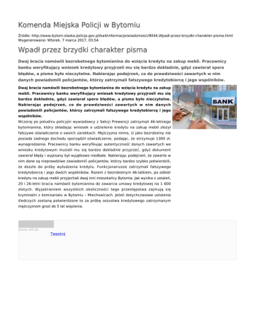 Komenda Miejska Policji w Bytomiu Źródło: http://www.bytom.slaska.policja.gov.pl/ka4/informacje/wiadomosci/9044,Wpadl-przez-brzydki-charakter-pisma.html Wygenerowano: Wtorek, 7 marca 2017, 03:54 Wpadł przez brzydki charakter pisma Dwaj bracia namówili bezrobotnego bytomianina do wzięcia kredytu na zakup mebli. Pracownicy banku weryfikujący wniosek kredytowy przyjrzeli mu się bardzo dokładnie, gdyż zawierał sporo błędów, a pismo było nieczytelne. Nabierając podejrzeń, co do prawdziwości zawartych w nim danych powiadomili policjantów, którzy zatrzymali fałszywego kredytobiorcę i jego wspólników. Dwaj bracia namówili bezrobotnego bytomianina do wzięcia kredytu na zakup mebli. Pracownicy banku weryfikujący wniosek kredytowy przyjrzeli mu się bardzo dokładnie, gdyż zawierał sporo błędów, a pismo było nieczytelne. Nabierając podejrzeń, co do prawdziwości zawartych w nim danych powiadomili policjantów, którzy zatrzymali fałszywego kredytobiorcę i jego wspólników. Wczoraj po południu policyjni wywiadowcy z Sekcji Prewencji zatrzymali 46-letniego bytomianina, który składając wniosek o udzielenie kredytu na zakup mebli złożył fałszywe oświadczenie o swoich zarobkach. Mężczyzna mimo, iż jako bezrobotny nie posiada żadnego dochodu sporządził oświadczenie, podając, że otrzymuje 1300 zł. wynagrodzenia. Pracownicy banku weryfikując autentyczność danych zawartych we wniosku kredytowym musieli mu się bardzo dokładnie przyjrzeć, gdyż dokument zawierał błędy i wypisany był wyjątkowo niedbale. Nabierając podejrzeń, że zawarte w nim dane są nieprawdziwe zawiadomili policjantów, którzy bardzo szybko potwierdzili, że doszło do próby wyłudzenia kredytu. Funkcjonariusze zatrzymali fałszywego kredytobiorcę i jego dwóch wspólników. Razem z bezrobotnym 46-latkiem, po odbiór kredytu na zakup mebli przyjechali dwaj inni mieszkańcy Bytomia. Jak wynika z ustaleń, 20 i 26-letni bracia namówili bytomianina do zawarcia umowy kredytowej na 1 600 złotych. Wyjaśnieniem wszystkich okoliczności tego przestępstwa zajmują się kryminalni z komisariatu w Bytomiu – Miechowicach. Jeżeli dotychczasowe ustalenia śledczych zostaną potwierdzone to za próbę oszustwa kredytowego zatrzymanym mężczyznom grozi do 5 lat więzienia. Ocena: 0/5 (0) Tweetnij