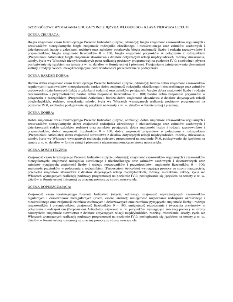 SZCZEGÓŁOWE WYMAGANIA EDUKACYJNE Z JĘZYKA WŁOSKIEGO – KLASA PIERWSZA LICEUM OCENA CELUJĄCA: Biegła znajomość czasu teraźniejszego Presente Indicativo (użycie, odmiany); biegła znajomość czasowników regularnych i czasowników nieregularnych; biegła znajomość rodzajnika określonego i nieokreślonego oraz zaimków osobowych i dzierżawczych (także z członkami rodziny) oraz zaimków pytających; biegła znajomość liczby i rodzaju rzeczowników i przymiotników; biegła znajomość liczebników 0 – 100; biegła znajomość przyimków w połączeniu z rodzajnikiem (Preposizioni Articolate); biegła znajomość słownictwa z działów dotyczących relacji międzyludzkich, rodziny, mieszkania, szkoły, życia we Włoszech niewykraczających poza realizację podstawy programowej na poziomie IV.0, swobodne i płynne posługiwanie się językiem na tematy z w. w. działów w formie ustnej i pisemnej. Przejawianie zainteresowania elementami kultury i tradycji Włoch, niewykraczającymi poza wiadomości prezentowane w podręczniku. OCENA BARDZO DOBRA: Bardzo dobra znajomość czasu teraźniejszego Presente Indicativo (użycie, odmiany); bardzo dobra znajomość czasowników regularnych i czasowników nieregularnych; bardzo dobra znajomość rodzajnika określonego i nieokreślonego oraz zaimków osobowych i dzierżawczych (także z członkami rodziny) oraz zaimków pytających; bardzo dobra znajomość liczby i rodzaju rzeczowników i przymiotników; bardzo dobra znajomość liczebników 0 – 100; bardzo dobra znajomość przyimków w połączeniu z rodzajnikiem (Preposizioni Articolate); bardzo dobra znajomość słownictwa z działów dotyczących relacji międzyludzkich, rodziny, mieszkania, szkoły, życia we Włoszech wymaganych realizacją podstawy programowej na poziomie IV.0, swobodne posługiwanie się językiem na tematy z w. w. działów w formie ustnej i pisemnej. OCENA DOBRA: Dobra znajomość czasu teraźniejszego Presente Indicativo (użycie, odmiany); dobra znajomość czasowników regularnych i czasowników nieregularnych; dobra znajomość rodzajnika określonego i nieokreślonego oraz zaimków osobowych i dzierżawczych (także członków rodziny) oraz zaimków pytających; dobra znajomość liczby i rodzaju rzeczowników i przymiotników; dobra znajomość liczebników 0 – 100; dobra znajomość przyimków w połączeniu z rodzajnikiem (Preposizioni Articolate); dobra znajomość słownictwa z działów dotyczących relacji międzyludzkich, rodziny, mieszkania, szkoły, życia we Włoszech wymaganych realizacją podstawy programowej na poziomie IV.0, posługiwanie się językiem na tematy z w. w. działów w formie ustnej i pisemnej z nieznaczną pomocą ze strony nauczyciela. OCENA DOSTATECZNA: Znajomość czasu teraźniejszego Presente Indicativo (użycie, odmiany); znajomość czasowników regularnych i czasowników nieregularnych; znajomość rodzajnika określonego i nieokreślonego oraz zaimków osobowych i dzierżawczych oraz zaimków pytających; znajomość liczby i rodzaju rzeczowników i przymiotników; znajomość liczebników 0 – 100; znajomość przyimków w połączeniu z rodzajnikiem (Preposizioni Articolate) wymagająca pomocy ze strony nauczyciela; przeciętna znajomość słownictwa z działów dotyczących relacji międzyludzkich, rodziny, mieszkania, szkoły, życia we Włoszech wymaganych realizacją podstawy programowej na poziomie IV.0, posługiwanie się językiem na tematy z w. w. działów w formie ustnej i pisemnej ze znaczną pomocą ze strony nauczyciela. OCENA DOPUSZCZAJĄCA: Znajomość czasu teraźniejszego Presente Indicativo (użycie, odmiany); znajomość najważniejszych czasowników regularnych i czasowników nieregularnych (avere, essere, andare); umiejętność rozpoznania rodzajnika określonego i nieokreślonego oraz znajomość zaimków osobowych i dzierżawczych oraz zaimków pytających; znajomość liczby i rodzaju rzeczowników i przymiotników; znajomość liczebników 0 – 100; umiejętność rozpoznania i tworzenia przyimków w połączeniu z rodzajnikiem (Preposizioni Articolate), używanie w. w. przyimków wymagające znacznej pomocy ze strony nauczyciela; znajomość słownictwa z działów dotyczących relacji międzyludzkich, rodziny, mieszkania, szkoły, życia we Włoszech wymaganych realizacją podstawy programowej na poziomie IV.0, posługiwanie się językiem na tematy z w. w. działów w formie ustnej i pisemnej ze znaczną pomocą ze strony nauczyciela. SZCZEGÓŁOWE WYMAGANIA EDUKACYJNE Z JĘZYKA WŁOSKIEGO – KLASA DRUGA LICEUM OCENA CELUJĄCA: Biegła znajomość czasu teraźniejszego Presente Indicativo oraz czasu przeszłego Passato Prossimo i formy Participio Passato czasowników regularnych i niektórych nieregularnych; biegła znajomość czasowników regularnych i czasowników nieregularnych oraz czasowników zwrotnych; biegła znajomość rodzajnika określonego i nieokreślonego oraz zaimków osobowych, dzierżawczych, pytających, wskazujących oraz zaimków dopełnienia bliższego i dalszego; biegła znajomość liczby i rodzaju rzeczowników i przymiotników; biegła znajomość liczebników; biegła znajomość przyimków w połączeniu z rodzajnikiem (Preposizioni Articolate); biegła znajomość gerundio oraz konstrukcji stare + gerundio; biegła znajomość słownictwa z działów dotyczących życia codziennego, pracy, żywienia, zakupów, spędzania wolnego czasu niewykraczających poza realizację podstawy programowej na poziomie IV.0, swobodne i płynne posługiwanie się językiem na tematy z w. w. działów w formie ustnej i pisemnej, przejawianie zainteresowania elementami kultury i tradycji Włoch, niewykraczającymi poza wiadomości prezentowane w podręczniku (np. poprzez udział w konkursach wiedzy lub poprzez prezentację samodzielnie przeczytanych lektur w języku włoskim na poziomie językowym A1/A2). OCENA BARDZO DOBRA: Bardzo dobra znajomość czasu ter