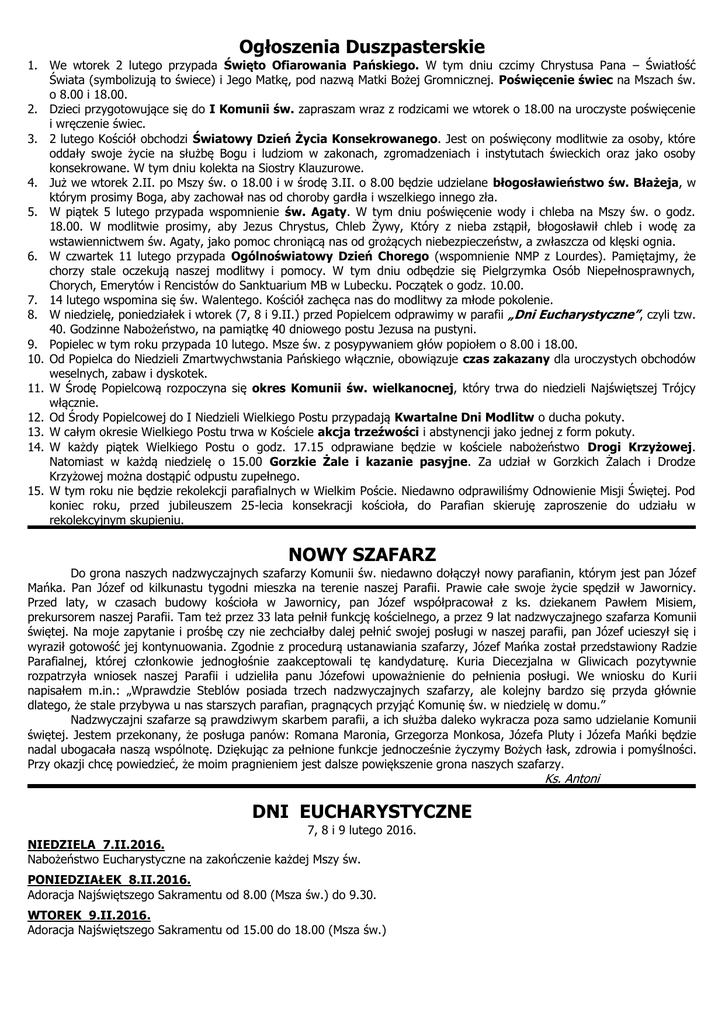 Ogłoszenia Duszpasterskie 1. We wtorek 2 lutego przypada Święto Ofiarowania Pańskiego. W tym dniu czcimy Chrystusa Pana – Światłość Świata (symbolizują to świece) i Jego Matkę, pod nazwą Matki Bożej Gromnicznej. Poświęcenie świec na Mszach św. o 8.00 i 18.00. 2. Dzieci przygotowujące się do I Komunii św. zapraszam wraz z rodzicami we wtorek o 18.00 na uroczyste poświęcenie i wręczenie świec. 3. 2 lutego Kościół obchodzi Światowy Dzień Życia Konsekrowanego. Jest on poświęcony modlitwie za osoby, które oddały swoje życie na służbę Bogu i ludziom w zakonach, zgromadzeniach i instytutach świeckich oraz jako osoby konsekrowane. W tym dniu kolekta na Siostry Klauzurowe. 4. Już we wtorek 2.II. po Mszy św. o 18.00 i w środę 3.II. o 8.00 będzie udzielane błogosławieństwo św. Błażeja, w którym prosimy Boga, aby zachował nas od choroby gardła i wszelkiego innego zła. 5. W piątek 5 lutego przypada wspomnienie św. Agaty. W tym dniu poświęcenie wody i chleba na Mszy św. o godz. 18.00. W modlitwie prosimy, aby Jezus Chrystus, Chleb Żywy, Który z nieba zstąpił, błogosławił chleb i wodę za wstawiennictwem św. Agaty, jako pomoc chroniącą nas od grożących niebezpieczeństw, a zwłaszcza od klęski ognia. 6. W czwartek 11 lutego przypada Ogólnoświatowy Dzień Chorego (wspomnienie NMP z Lourdes). Pamiętajmy, że chorzy stale oczekują naszej modlitwy i pomocy. W tym dniu odbędzie się Pielgrzymka Osób Niepełnosprawnych, Chorych, Emerytów i Rencistów do Sanktuarium MB w Lubecku. Początek o godz. 10.00. 7. 14 lutego wspomina się św. Walentego. Kościół zachęca nas do modlitwy za młode pokolenie. 8. W niedzielę, poniedziałek i wtorek (7, 8 i 9.II.) przed Popielcem odprawimy w parafii „Dni Eucharystyczne”, czyli tzw. 40. Godzinne Nabożeństwo, na pamiątkę 40 dniowego postu Jezusa na pustyni. 9. Popielec w tym roku przypada 10 lutego. Msze św. z posypywaniem głów popiołem o 8.00 i 18.00. 10. Od Popielca do Niedzieli Zmartwychwstania Pańskiego włącznie, obowiązuje czas zakazany dla uroczystych obchodów weselnych, zabaw i dyskotek. 11. W Środę Popielcową rozpoczyna się okres Komunii św. wielkanocnej, który trwa do niedzieli Najświętszej Trójcy włącznie. 12. Od Środy Popielcowej do I Niedzieli Wielkiego Postu przypadają Kwartalne Dni Modlitw o ducha pokuty. 13. W całym okresie Wielkiego Postu trwa w Kościele akcja trzeźwości i abstynencji jako jednej z form pokuty. 14. W każdy piątek Wielkiego Postu o godz. 17.15 odprawiane będzie w kościele nabożeństwo Drogi Krzyżowej. Natomiast w każdą niedzielę o 15.00 Gorzkie Żale i kazanie pasyjne. Za udział w Gorzkich Żalach i Drodze Krzyżowej można dostąpić odpustu zupełnego. 15. W tym roku nie będzie rekolekcji parafialnych w Wielkim Poście. Niedawno odprawiliśmy Odnowienie Misji Świętej. Pod koniec roku, przed jubileuszem 25-lecia konsekracji kościoła, do Parafian skieruję zaproszenie do udziału w rekolekcyjnym skupieniu. NOWY SZAFARZ Do grona naszych nadzwyczajnych szafarzy Komunii św. niedawno dołączył nowy parafianin, którym jest pan Józef Mańka. Pan Józef od kilkunastu tygodni mieszka na terenie naszej Parafii. Prawie całe swoje życie spędził w Jawornicy. Przed laty, w czasach budowy kościoła w Jawornicy, pan Józef współpracował z ks. dziekanem Pawłem Misiem, prekursorem naszej Parafii. Tam też przez 33 lata pełnił funkcję kościelnego, a przez 9 lat nadzwyczajnego szafarza Komunii świętej. Na moje zapytanie i prośbę czy nie zechciałby dalej pełnić swojej posługi w naszej parafii, pan Józef ucieszył się i wyraził gotowość jej kontynuowania. Zgodnie z procedurą ustanawiania szafarzy, Józef Mańka został przedstawiony Radzie Parafialnej, której członkowie jednogłośnie zaakceptowali tę kandydaturę. Kuria Diecezjalna w Gliwicach pozytywnie rozpatrzyła wniosek naszej Parafii i udzieliła panu Józefowi upoważnienie do pełnienia posługi. We wniosku do Kurii napisałem m.in.: „Wprawdzie Steblów posiada trzech nadzwyczajnych szafarzy, ale kolejny bardzo się przyda głównie dlatego, że stale przybywa u nas starszych parafian, pragnących przyjąć Komunię św. w niedzielę w domu.” Nadzwyczajni szafarze są prawdziwym skarbem parafii, a ich służba daleko wykracza poza samo udzielanie Komunii świętej. Jestem przekonany, że posługa panów: Romana Maronia, Grzegorza Monkosa, Józefa Pluty i Józefa Mańki będzie nadal ubogacała naszą wspólnotę. Dziękując za pełnione funkcje jednocześnie życzymy Bożych łask, zdrowia i pomyślności. Przy okazji chcę powiedzieć, że moim pragnieniem jest dalsze powiększenie grona naszych szafarzy. Ks. Antoni DNI EUCHARYSTYCZNE 7, 8 i 9 lutego 2016. NIEDZIELA 7.II.2016. Nabożeństwo Eucharystyczne na zakończenie każdej Mszy św. PONIEDZIAŁEK 8.II.2016. Adoracja Najświętszego Sakramentu od 8.00 (Msza św.) do 9.30. WTOREK 9.II.2016. Adoracja Najświętszego Sakramentu od 15.00 do 18.00 (Msza św.)
