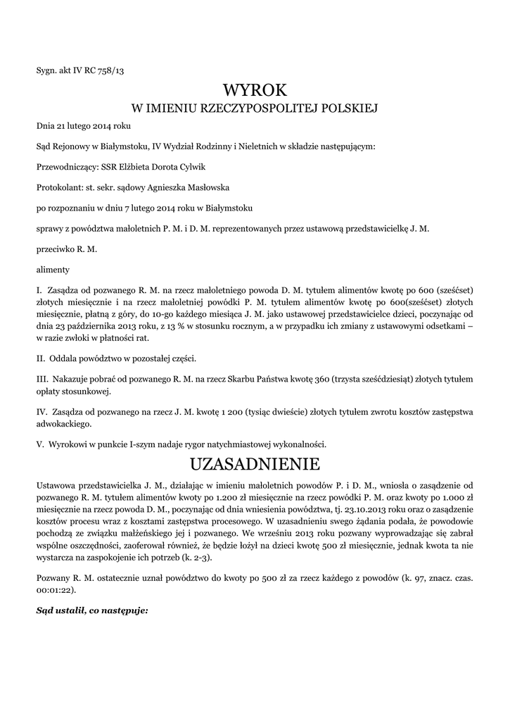 Sygn. akt IV RC 758/13 WYROK W IMIENIU RZECZYPOSPOLITEJ POLSKIEJ Dnia 21 lutego 2014 roku Sąd Rejonowy w Białymstoku, IV Wydział Rodzinny i Nieletnich w składzie następującym: Przewodniczący: SSR Elżbieta Dorota Cylwik Protokolant: st. sekr. sądowy Agnieszka Masłowska po rozpoznaniu w dniu 7 lutego 2014 roku w Białymstoku sprawy z powództwa małoletnich P. M. i D. M. reprezentowanych przez ustawową przedstawicielkę J. M. przeciwko R. M. alimenty I. Zasądza od pozwanego R. M. na rzecz małoletniego powoda D. M. tytułem alimentów kwotę po 600 (sześćset) złotych miesięcznie i na rzecz małoletniej powódki P. M. tytułem alimentów kwotę po 600(sześćset) złotych miesięcznie, płatną z góry, do 10-go każdego miesiąca J. M. jako ustawowej przedstawicielce dzieci, poczynając od dnia 23 października 2013 roku, z 13 % w stosunku rocznym, a w przypadku ich zmiany z ustawowymi odsetkami – w razie zwłoki w płatności rat. II. Oddala powództwo w pozostałej części. III. Nakazuje pobrać od pozwanego R. M. na rzecz Skarbu Państwa kwotę 360 (trzysta sześćdziesiąt) złotych tytułem opłaty stosunkowej. IV. Zasądza od pozwanego na rzecz J. M. kwotę 1 200 (tysiąc dwieście) złotych tytułem zwrotu kosztów zastępstwa adwokackiego. V. Wyrokowi w punkcie I-szym nadaje rygor natychmiastowej wykonalności. UZASADNIENIE Ustawowa przedstawicielka J. M., działając w imieniu małoletnich powodów P. i D. M., wniosła o zasądzenie od pozwanego R. M. tytułem alimentów kwoty po 1.200 zł miesięcznie na rzecz powódki P. M. oraz kwoty po 1.000 zł miesięcznie na rzecz powoda D. M., poczynając od dnia wniesienia powództwa, tj. 23.10.2013 roku oraz o zasądzenie kosztów procesu wraz z kosztami zastępstwa procesowego. W uzasadnieniu swego żądania podała, że powodowie pochodzą ze związku małżeńskiego jej i pozwanego. We wrześniu 2013 roku pozwany wyprowadzając się zabrał wspólne oszczędności, zaoferował również, że będzie łożył na dzieci kwotę 500 zł miesięcznie, jednak kwota ta nie wystarcza na zaspokojenie ich potrzeb (k. 2-3). Pozwany R. M. ostatecznie uznał powództwo do kwoty po 500 zł za rzecz każdego z powodów (k. 97, znacz. czas. 00:01:22). Sąd ustalił, co następuje: Małoletnia P. M., urodzona (...) w B.. i małoletni D. M. urodzony (...) w B., pochodzą z małżeństwa J. i R. M.. Aktualnie pomiędzy rodzicami dzieci nie toczy się postępowanie o rozwód lub separację (odpisy aktów urodzenia k. 6-7, odpis aktu małżeństwa k. 8). Małoletnia P. M. ma 10 lat. Uczęszcza do klasy IV szkoły podstawowej, w szkole korzysta z obiadów, które są refundowane. Jest zdrowa. Małoletnia uczęszcza na zajęcia dodatkowe z judo, ich koszt to 70 zł miesięcznie. Obecnie wraz z matką i bratem mieszka w B. w wynajętym mieszkaniu (faktura k. 43, wyjaśnienia przedstawicielki ustawowej k. 74v-75, znacz. czas. 00:17:55, k. 99 znacz. czas. 00:38:08). Małoletni D. M. ma 5 lat. Uczęszcza do „zerówki”, która jest bezpłatna. W szkole korzysta również z refundowanych obiadów. Jest dzieckiem ogólnie zdrowym, ale jest zarażony glistą ludzką. Nie uczęszcza na płatne zajęcia dodatkowe. Wraz z matką i siostrą mieszka w B. w wynajętym mieszkaniu (wyjaśnienia przedstawicielki ustawowej k. 74v-75, znacz. czas. 00:17:55, k. 99 znacz. czas. 00:38:08). Ustawowa przedstawicielka powodów J. M. ma 32 lata. Posiada zawód technolog żywienia zbiorowego. Jest zamężna z pozwanym, nie toczy się sprawa o rozwód, ani separację, poza małoletnimi powodami nie ma innych dzieci. Podejmowała prace dorywcze, obecnie przeprowadziła się z dziećmi do B., gdzie mieszkają w wynajętym mieszkaniu, poszukuje pracy. Posiada majątek wspólny z mężem w postaci maszyn rolniczych, zboża oraz samochodu F. (...), który użytkuje. W utrzymaniu pomaga jej rodzina, w szczególności ojciec i brat. Czynsz za mieszkanie wynosi 670 zł (wyjaśnienia przedstawicielki ustawowej k. 74-75, znacz. czas. 00:04:13, k. 98v-99 znacz. czas. 00:37:12). Pozwany R. ma 31 lat, wykształcenie podstawowe. Utrzymuje się z prac dorywczych, osiągając dochód w granicach 1.000 zł miesięcznie – naprawia maszyny rolnicze, ma także własne maszyny rolnicze, którymi pracuje wiosną i latem. Za usługi żniwne latem 2013 roku uzyskał dochód ok. 12.000 zł. Prowadzi też gospodarstwo rolne, które obsiewa zbożem. Ma ziemię, którą dzierżawi znajomemu, w zamian otrzymuje dotacje i opłaca podatek. Jest żonaty z przedstawicielką ustawową, poza powodami nie ma innych dzieci. Mieszka u kolegi, za mieszkanie płaci mu 100 zł miesięcznie. Wraz z żoną posiada majątek w postaci maszyn rolniczych, zboża i samochodu F. (...), który użytkuje żona. Wraz z żoną mają zadłużenie w KRUS w kwocie ok. 3.000 zł. W toku postępowania dobrowolnie łożył na dzieci 500 zł, a później 300 zł (odpowiedź na pozew k. 16-17, zaświadczenia k. 22-23, wyjaśnienia pozwanego k. 75 znacz. czas. 00:39:55, k. 99-99v znacz. czas. 00:45:57). Sąd zważył, co następuje: Artykuł 133 § 1 kro stanowi, że rodzice obowiązani są do świadczeń alimentacyjnych względem dziecka, które nie jest jeszcze w stanie utrzymać się samodzielnie, chyba, że dochody z majątku dziecka wystarczają na pokrycie kosztów jego utrzymania i wychowania. Z kolei art. 135 § 1 kro stanowi, że zakres świadczeń alimentacyjnych zależy od usprawiedliwionych potrzeb uprawnionego oraz od zarobkowych i majątkowych możliwości zobowiązanego. Jak stwierdził Sąd Najwyższy, określenie wysokości alimentów od każdego z rodziców na rzecz dziecka stanowi wypadkową usprawiedliwionych potrzeb uprawnionego, zarobkowych i majątkowych możliwości zobowiązanego oraz wkładu osobistych starań rodzica w utrzymanie i wychowanie dziecka (uzasadnienie uchwały z dnia 1 lipca 1974 roku III CZP 41/74, OSCP z 1974 roku, nr 5 poz. 76). Usprawiedliwione potrzeby powinny być zaspokojone