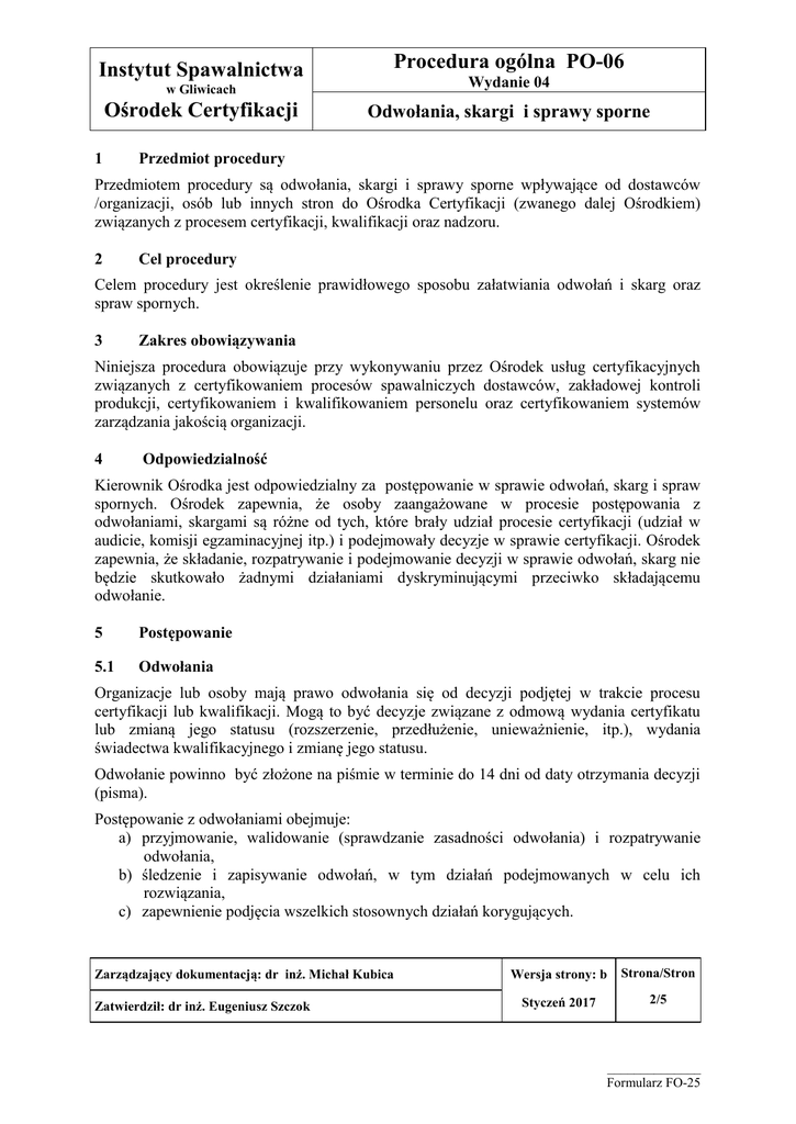 Instytut Spawalnictwa Procedura ogólna PO-06 w Gliwicach Wydanie 04 Ośrodek Certyfikacji Odwołania, skargi i sprawy sporne 1 Przedmiot procedury Przedmiotem procedury są odwołania, skargi i sprawy sporne wpływające od dostawców /organizacji, osób lub innych stron do Ośrodka Certyfikacji (zwanego dalej Ośrodkiem) związanych z procesem certyfikacji, kwalifikacji oraz nadzoru. 2 Cel procedury Celem procedury jest określenie prawidłowego sposobu załatwiania odwołań i skarg oraz spraw spornych. 3 Zakres obowiązywania Niniejsza procedura obowiązuje przy wykonywaniu przez Ośrodek usług certyfikacyjnych związanych z certyfikowaniem procesów spawalniczych dostawców, zakładowej kontroli produkcji, certyfikowaniem i kwalifikowaniem personelu oraz certyfikowaniem systemów zarządzania jakością organizacji. 4 Odpowiedzialność Kierownik Ośrodka jest odpowiedzialny za postępowanie w sprawie odwołań, skarg i spraw spornych. Ośrodek zapewnia, że osoby zaangażowane w procesie postępowania z odwołaniami, skargami są różne od tych, które brały udział procesie certyfikacji (udział w audicie, komisji egzaminacyjnej itp.) i podejmowały decyzje w sprawie certyfikacji. Ośrodek zapewnia, że składanie, rozpatrywanie i podejmowanie decyzji w sprawie odwołań, skarg nie będzie skutkowało żadnymi działaniami dyskryminującymi przeciwko składającemu odwołanie. 5 Postępowanie 5.1 Odwołania Organizacje lub osoby mają prawo odwołania się od decyzji podjętej w trakcie procesu certyfikacji lub kwalifikacji. Mogą to być decyzje związane z odmową wydania certyfikatu lub zmianą jego statusu (rozszerzenie, przedłużenie, unieważnienie, itp.), wydania świadectwa kwalifikacyjnego i zmianę jego statusu. Odwołanie powinno być złożone na piśmie w terminie do 14 dni od daty otrzymania decyzji (pisma). Postępowanie z odwołaniami obejmuje: a) przyjmowanie, walidowanie (sprawdzanie zasadności odwołania) i rozpatrywanie odwołania, b) śledzenie i zapisywanie odwołań, w tym działań podejmowanych w celu ich rozwiązania, c) zapewnienie podjęcia wszelkich stosownych działań korygujących. Zarządzający dokumentacją: dr inż. Michał Kubica Zatwierdził: dr inż. Eugeniusz Szczok Wersja strony: b Strona/Stron Styczeń 2017 2/5 ______________ Formularz FO-25 Procedura ogólna PO-06 Instytut Spawalnictwa w Gliwicach Wydanie 04 Ośrodek Certyfikacji Odwołania, skargi i sprawy sporne Po wpłynięciu odwołania podlegają rejestracji w rejestrze RO-07 sporządzanym na formularzu FO-07. Odwołanie rozpatrywane jest przez Zespół Odwoławczy powołany przez Kierownika Ośrodka lub jego Z-cę. Zarówno osoby podejmujące decyzję jak i osoby będąca w składzie Zespołu Odwoławczego nie mogą być w jakikolwiek sposób związane z organizacją lub osobą wnoszącą odwołanie. Zespół Odwoławczy bada zasadność odwołania a następnie wydaje opinie dotyczącą odwołania. Po zapoznaniu się z opinią Zespołu Odwoławczego Kierownik Ośrodka lub jego Z-ca podejmuje decyzje o uznaniu lub nie uznaniu odwołania i następnie wraz z uzasadnieniem powiadamia pisemnie wnoszącego odwołanie o podjętej decyzji. Proces odwołania prowadzony jest przy zachowaniu pełnej poufności. Odwołanie załatwiane jest w terminie do 30 dni od daty jej wpłynięcia. W przypadku nie uznania odwołania przez Kierownika Ośrodka lub jego Z-cę organizacja lub osoba może zwrócić się do Dyrektora Instytutu Spawalnictwa o ponowne rozpatrzenie odwołania. Przed podjęciem decyzji o uznaniu lub nie uznaniu odwołania Dyrektor Instytutu Spawalnictwa może skorzystać z opinii Rady Zarządzającej lub członków Komitetu Technicznego właściwego dla danego zakresu certyfikacji a następnie powiadamia pisemnie wnoszącego odwołanie o podjętej decyzji. Odwołanie załatwiane jest w terminie do 60 dni od daty jego wpłynięcia. Składanie, rozpatrywanie i podejmowanie decyzji w sprawach odwołań nie skutkuje żadnymi działaniami dyskryminującymi składającego odwołanie. Ośrodek Certyfikacji powiadamia pisemnie składającego odwołanie o zakończeniu procesu rozpatrywania odwołania 5.2 Skargi Skargi składane przez organizacje lub osobę dotyczą uchybień w pracy Ośrodka np. błędnych zapisów, nie dotrzymania terminów, braku niezbędnych informacji itp. Skargi mogą być złożone na piśmie w formie listowej lub drogą elektroniczną oraz telefonicznie w terminie 7 dni od wystąpienia uchybienia. Wszystkie skargi przekazane zarówno w formie pisemnej jak i ustnej są rejestrowane w "Rejestr odwołań i skarg" na formularzu R0-07. Osoba podejmująca decyzje oraz osoby rozpatrujące skargi nie mogą być w jakikolwiek sposób związane z organizacją lub osobami wnoszącymi skargi. Rozpatrywanie skarg prowadzone jest przy zachowaniu pełnej poufności przy braku jakichkolwiek działań dyskryminujących przeciwko składającemu skargę. Przy rozpatrywaniu skargi klienta dotyczącej jego systemu zarządzania Ośrodek Certyfikacji uwzględnia skuteczność działania wdrożonego certyfikowanego systemu zarządzania. Postępowanie z skargami obejmuje: a) przyjmowanie, walidowanie (sprawdzanie zasadności skargi), rozpatrywanie skargi i podjęte działania na nie, b) śledzenie i zapisywanie skargi , w tym działań podejmowanych na nie, c) zapewnienie podjęcia wszelkich stosownych działań korygujących. Skarga jest rozpatrywana wstępnie przez Kierownika Ośrodka, a następnie kierowane do osoby wyznaczonej do jej załatwienia. Uzasadnione skargi dotyczące certyfikowanego klienta są kierowane do klienta w przeciągu 14 dni licząc od daty wpłynięcia do Ośrodka. Zarządzający dokumentacją: dr inż. Michał Kubica Zatwierdził: dr inż. Eugeniusz Szczok Wersja strony: d Strona/Stron Styczeń 2017 3/5 ______________ Formularz FO-25 Procedura ogólna PO-06 Instytut Spawalnictwa w Gliwicach Wydanie 04 Ośrodek Certyfikacji Odwołania, skargi i sprawy sporne O spo