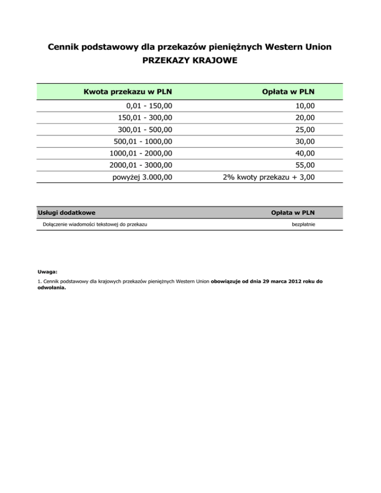 Cennik podstawowy dla przekazów pieniężnych Western Union PRZEKAZY KRAJOWE Kwota przekazu w PLN Opłata w PLN 0,01 - 150,00 10,00 150,01 - 300,00 20,00 300,01 - 500,00 25,00 500,01 - 1000,00 30,00 1000,01 - 2000,00 40,00 2000,01 - 3000,00 55,00 powyżej 3.000,00 2% kwoty przekazu + 3,00 Usługi dodatkowe Dołączenie wiadomości tekstowej do przekazu Opłata w PLN bezpłatnie Uwaga: 1. Cennik podstawowy dla krajowych przekazów pieniężnych Western Union obowiązuje od dnia 29 marca 2012 roku do odwołania.
